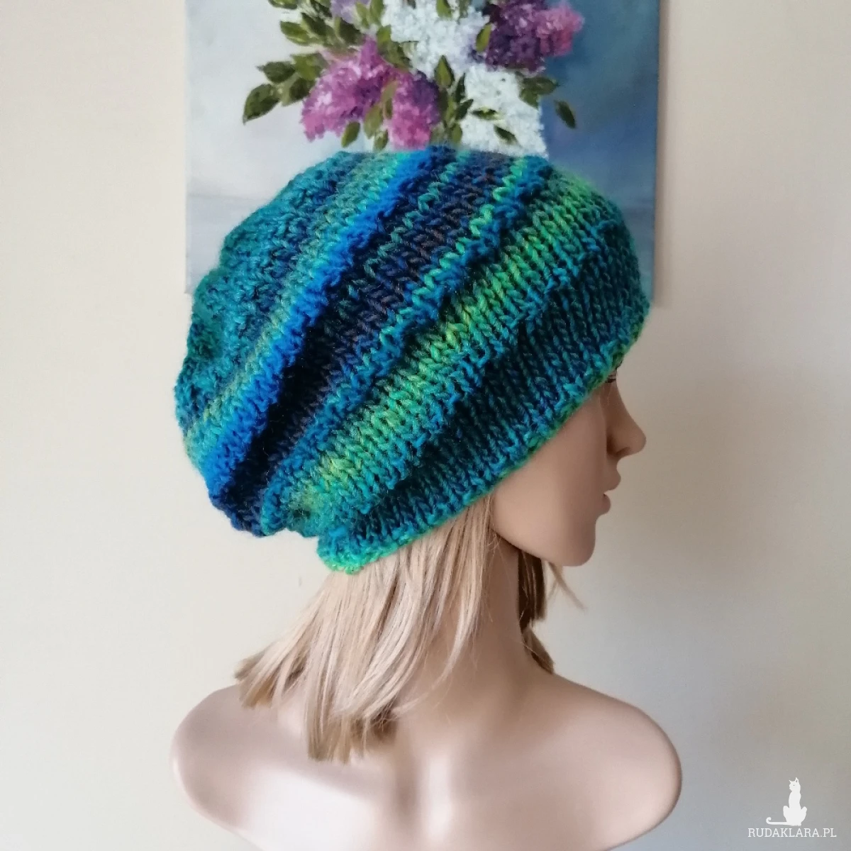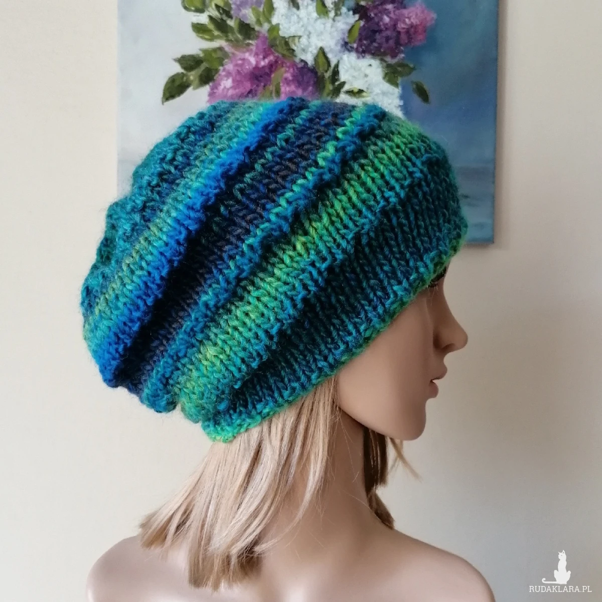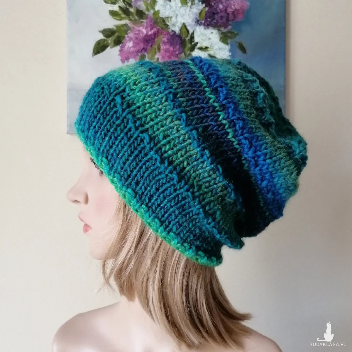 Miła, ciepła, bezszwowa (robiona naokoło, a nie zszywana) czapka, wykonana ręcznie na drutach z doskonałej hiszpańskiej włóczki o składzie: 47% akryl 53% wełna. Super dodatek do zimowych stylizacji. Twarzowy fason, który pomieści dłuższe włosy i loki. Wymiary: dł. 27,5 cm, polecam dla obwodów głowy 56-59. Brak klasycznego ściągacza nie grozi rozciągnięciem czapki. Pranie ręczne.