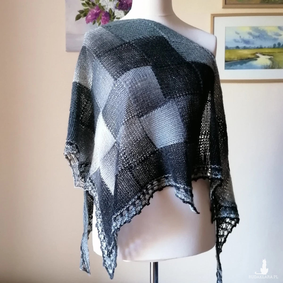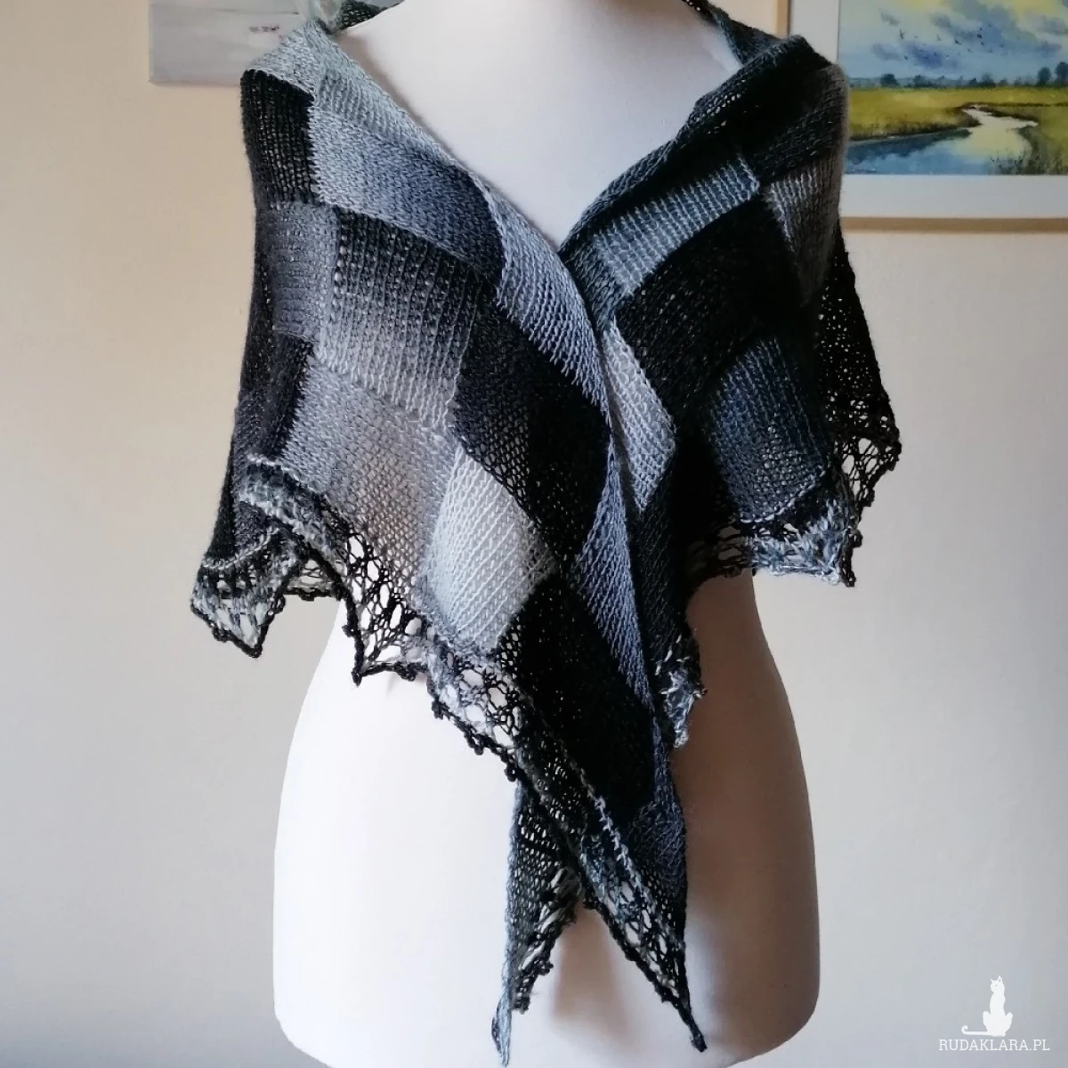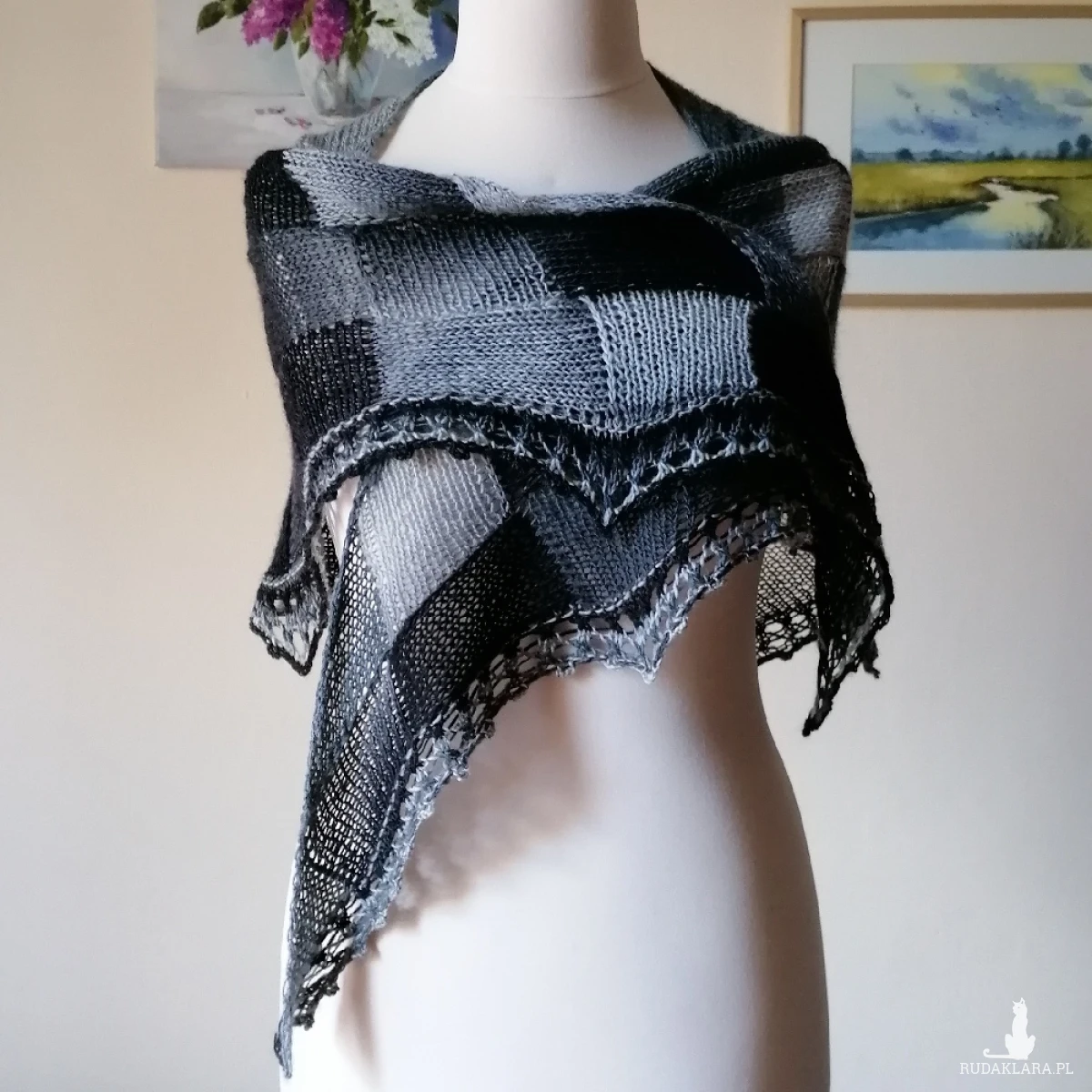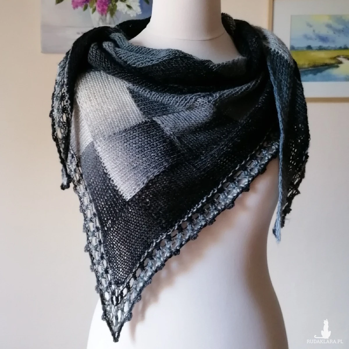 Chusta wykonana ręcznie na drutach z jakościowej włóczki: 75% wełna 25% poliamid. Chusta jest lekka, przyjemna, ładnie się układa, a dzięki wełnie w składzie - jest ciepła. Układ kolorów umożliwia dowolne ułożenie przy twarzy. Delikatna, ażurowa bordiura nadaje chuście charakteru i stylu. Wymiary: 193 cm. (najdłuższy bok), ok. 72 cm. wys. trójkąta. Zalecam pranie ręczne w delikatnych środkach piorących.