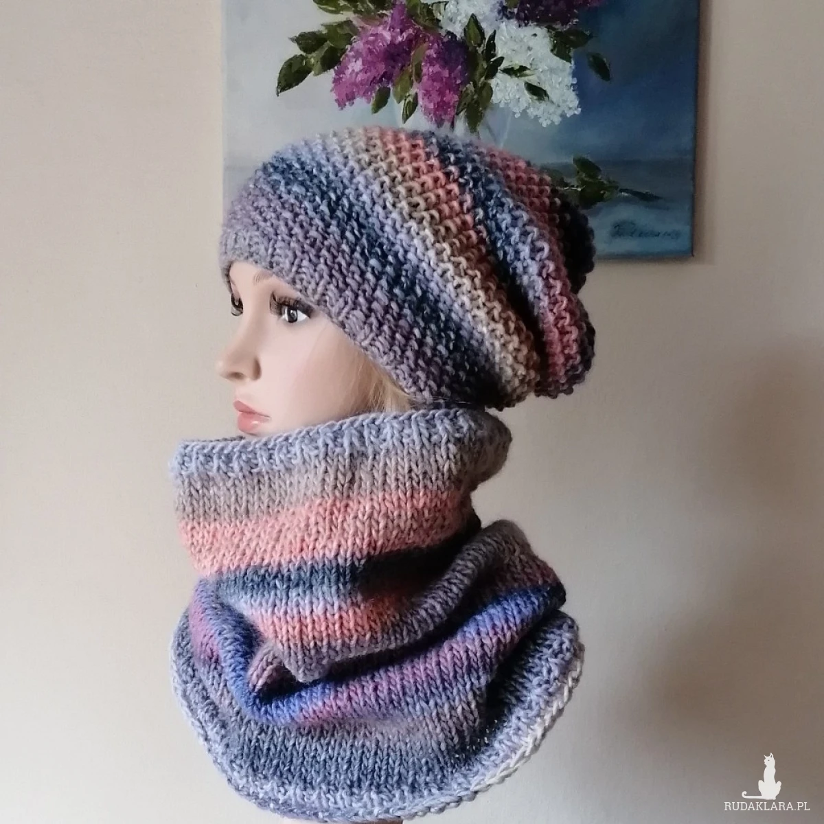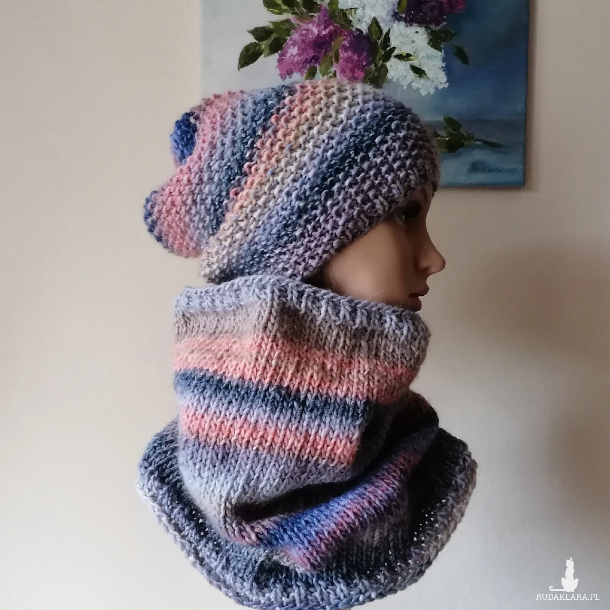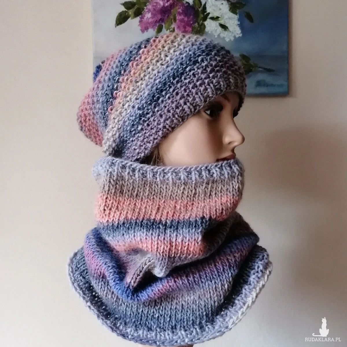 Miły, ciepły, bezszwowy (robiony naokoło, a nie zszywany) komplet, wykonany ręcznie na drutach z doskonałej hiszpańskiej włóczki o składzie: 53% wełna, 47% akryl. Włóczka jest delikatna, przyjemna dla skóry, a kolory twarzowe. Świetny do codziennego noszenia, jak i w czasie sportowych "wypadów". Wymiary: czapka dł. 27 cm, polecam dla obwodów głowy 55-57, komin szer. 56 (góra), 66 (dół), dł. komina 37 cm.