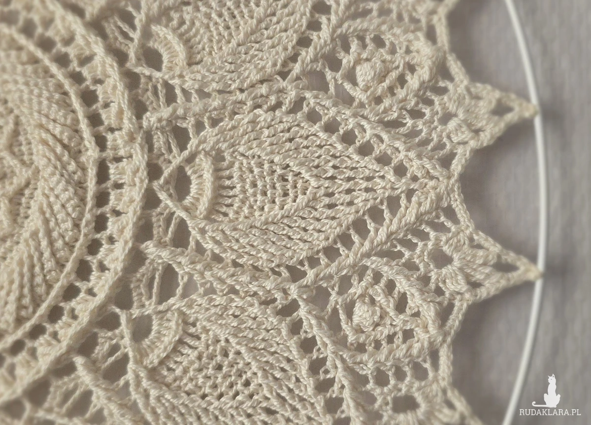 Serweta Ulita zrobiona z kordonka Ariadna Aria 5 col 0000, rozpięta na obręczy 45 cm.