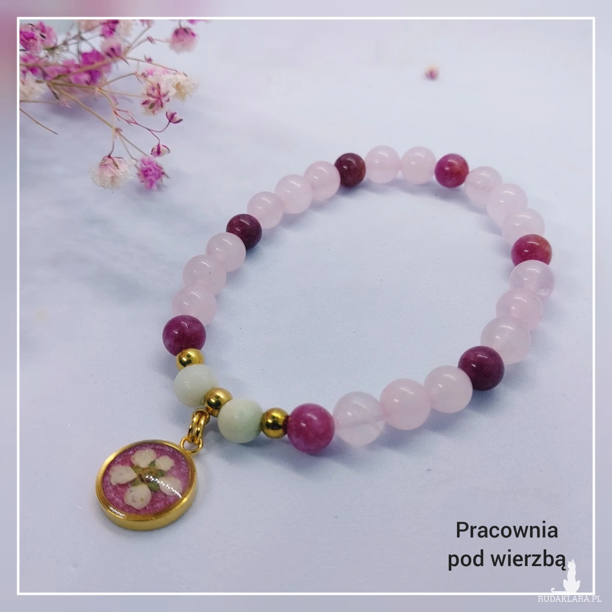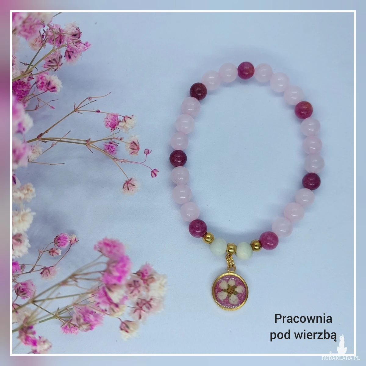 Kompozycja z kamieni została uzupełniona zawieszką z kwiatem białej tawuły, która dodaje bransoletce kobiecego uroku i delikatności.