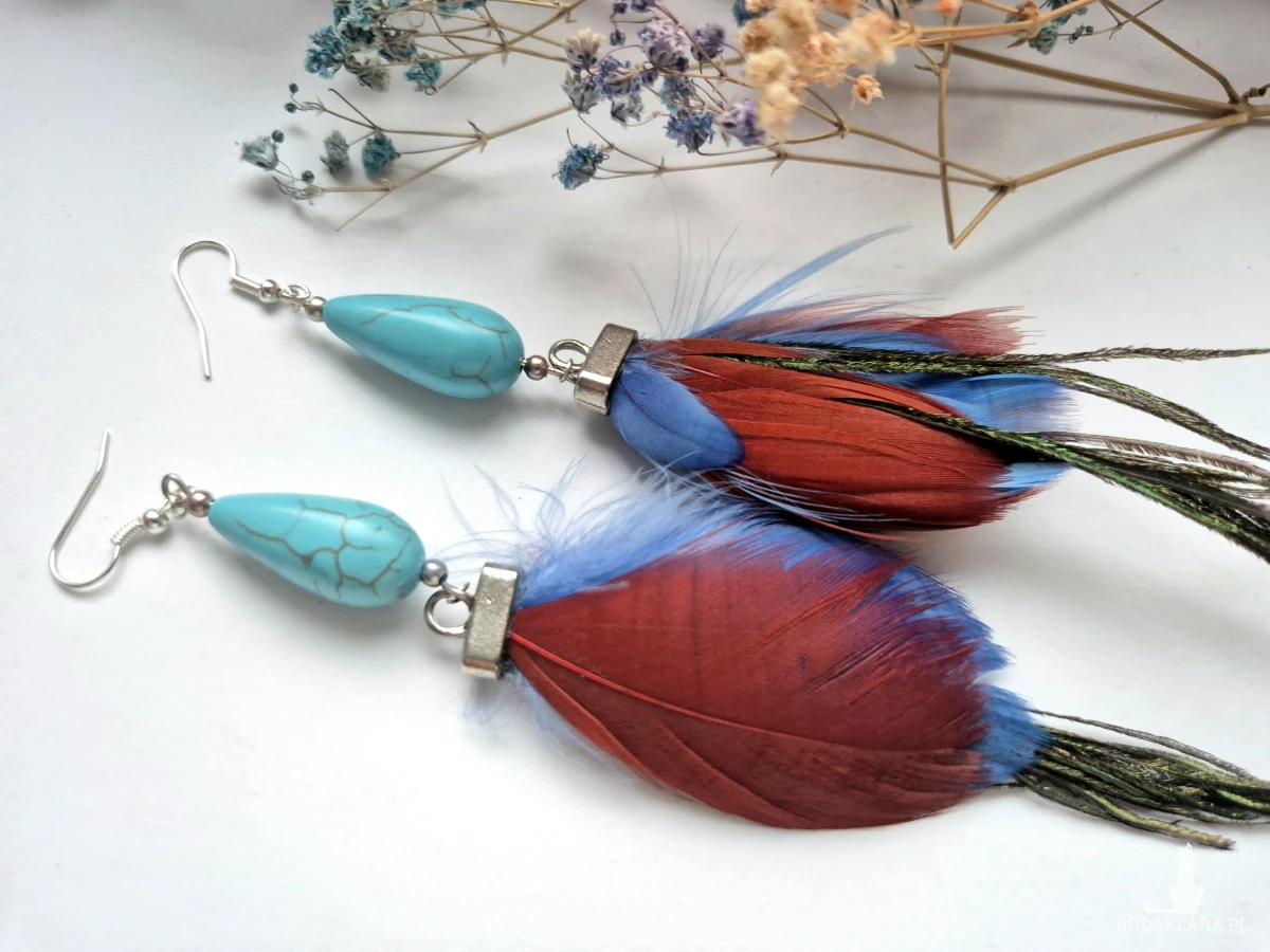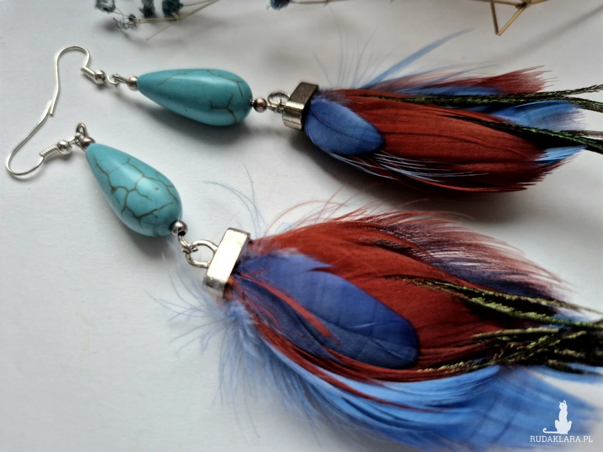 Kolczyki pióra boho kolorowe lekkie wykonane w pojedynczym egzemplarzu