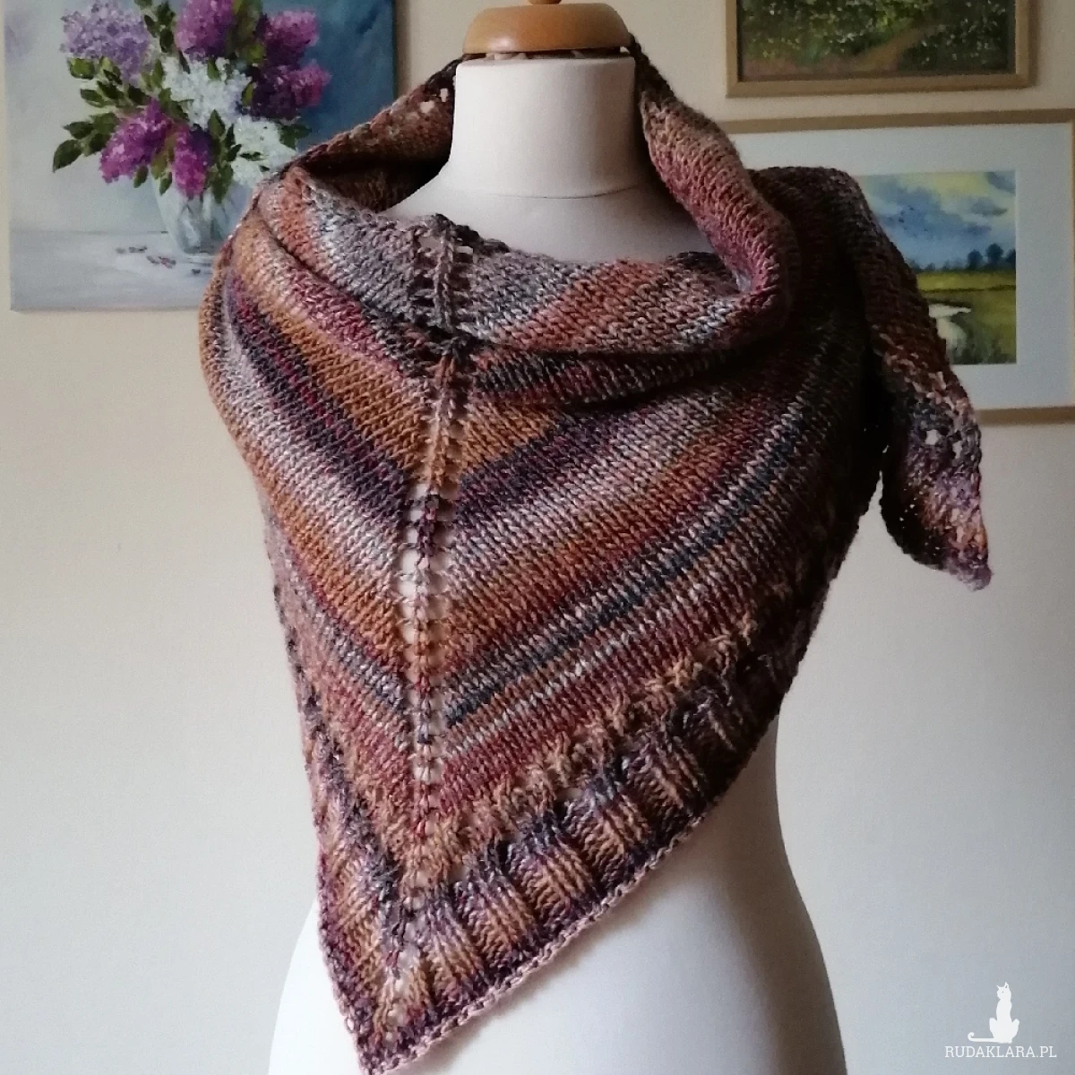 Duża chusta wykonana ręcznie na drutach z miłej, nieco grubszej włóczki produkcji włoskiej o składzie: 30% wełny merino, 70% mikrofibry akrylowej. Chusta jest bardzo miła i świetnie sprawdzi się dla osób nielubiących "dotyku" wełny. Apetyczny kolor jest jej dodatkowym atutem. Ponieważ włóczka jest grubsza, polecam chustę w chłodniejszym i zimowym sezonie. Wymiary: 202 cm. bok najdłuższy, 92 cm. wys. trójkąta. Producent dopuszcza pranie w pralce w programie "jedwab/pranie ręczne". Ja raczej zalecam realne pranie ręczne.