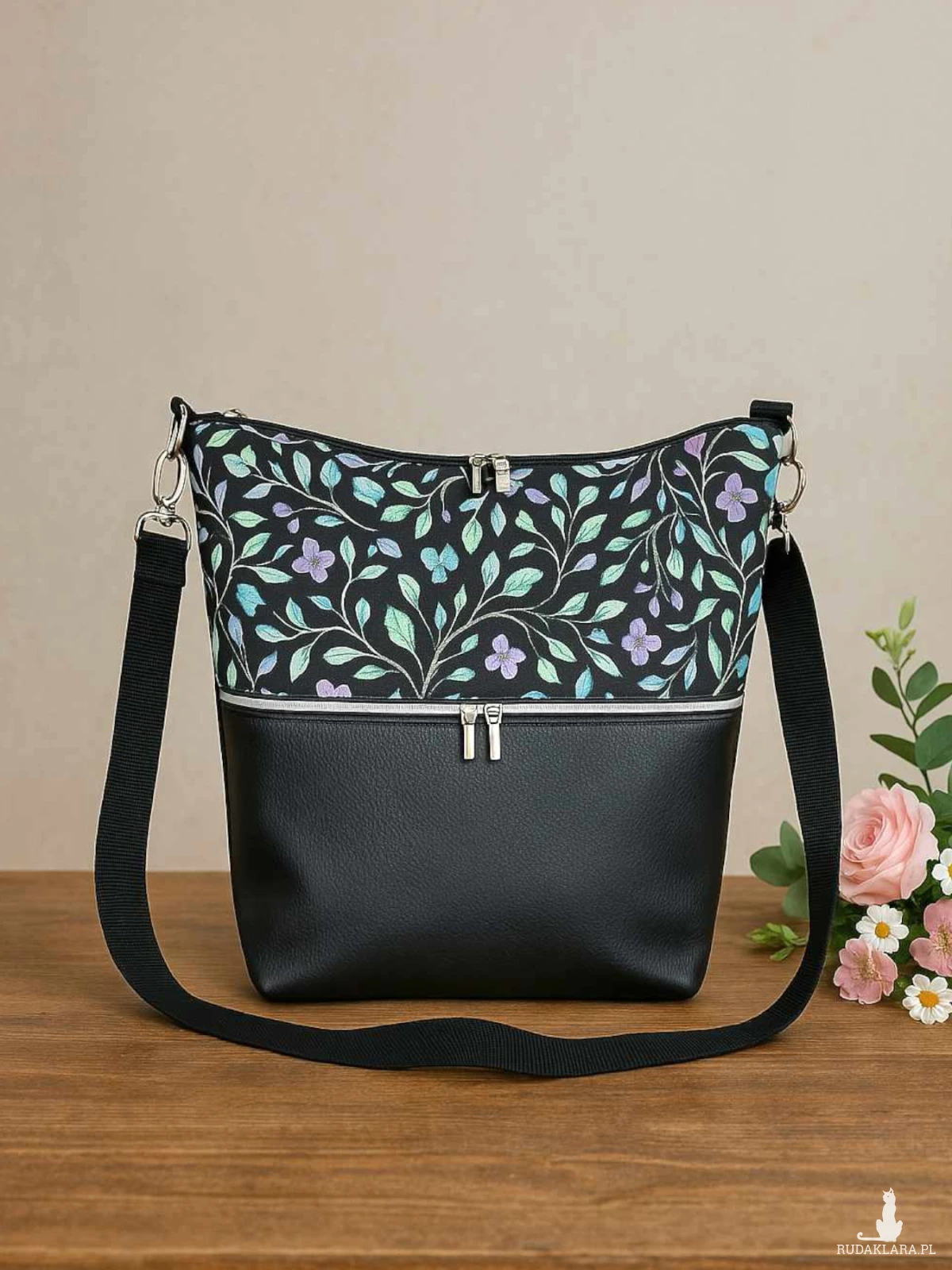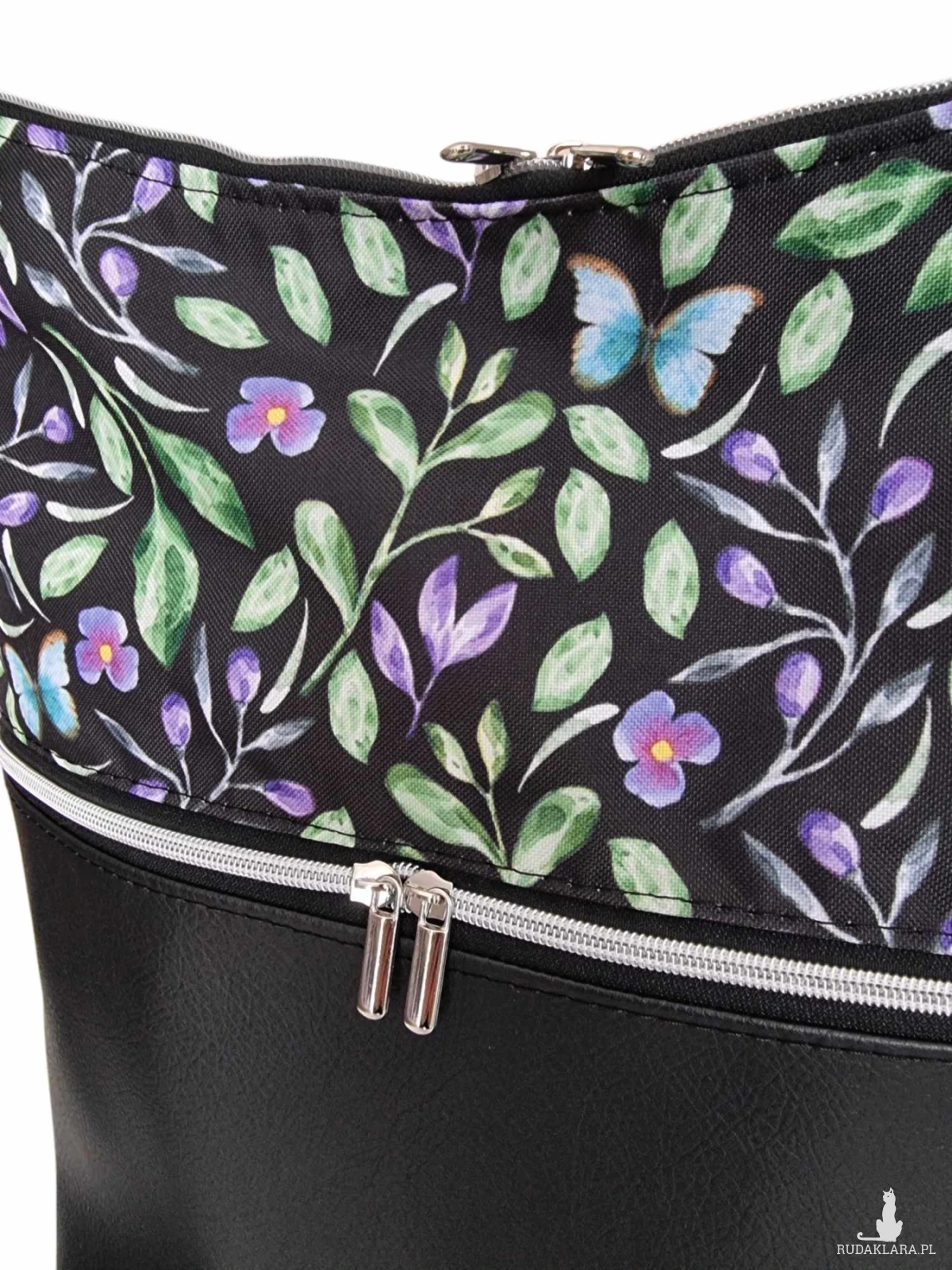 Tył oraz dół torebki wykonane są z ekoskóry w klasycznym czarnym kolorze, natomiast przód zdobi tkanina tapicerska wodoodporna, na której widnieją kolorowe, zielone i fioletowe liście oraz subtelne motylki.