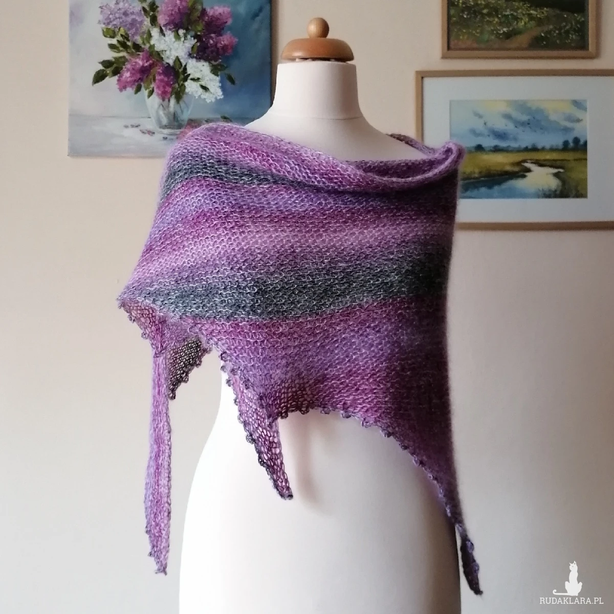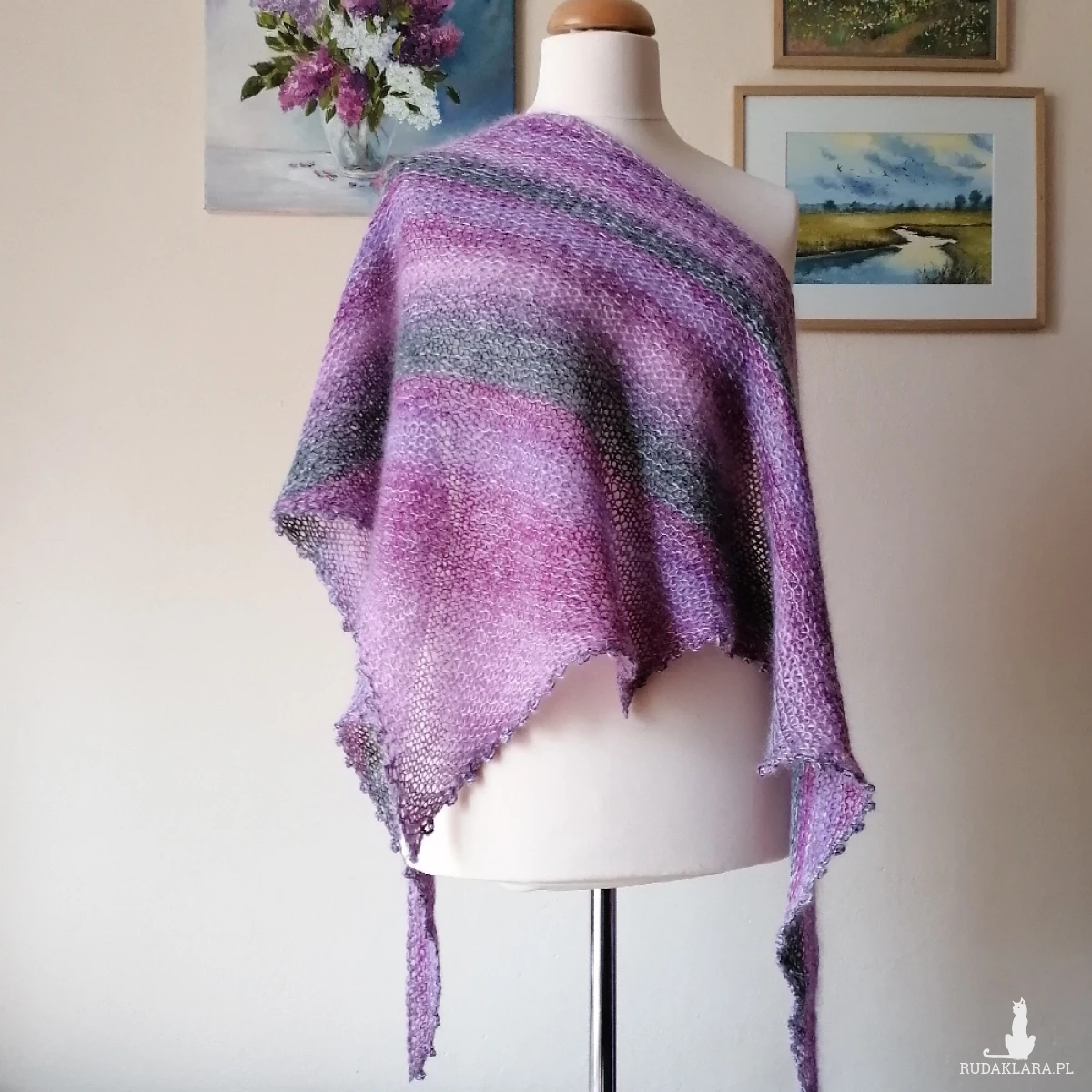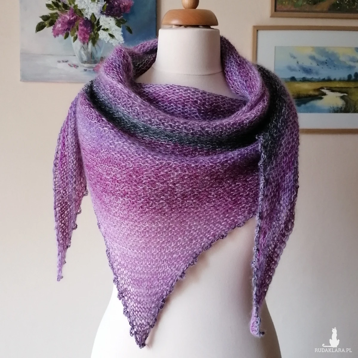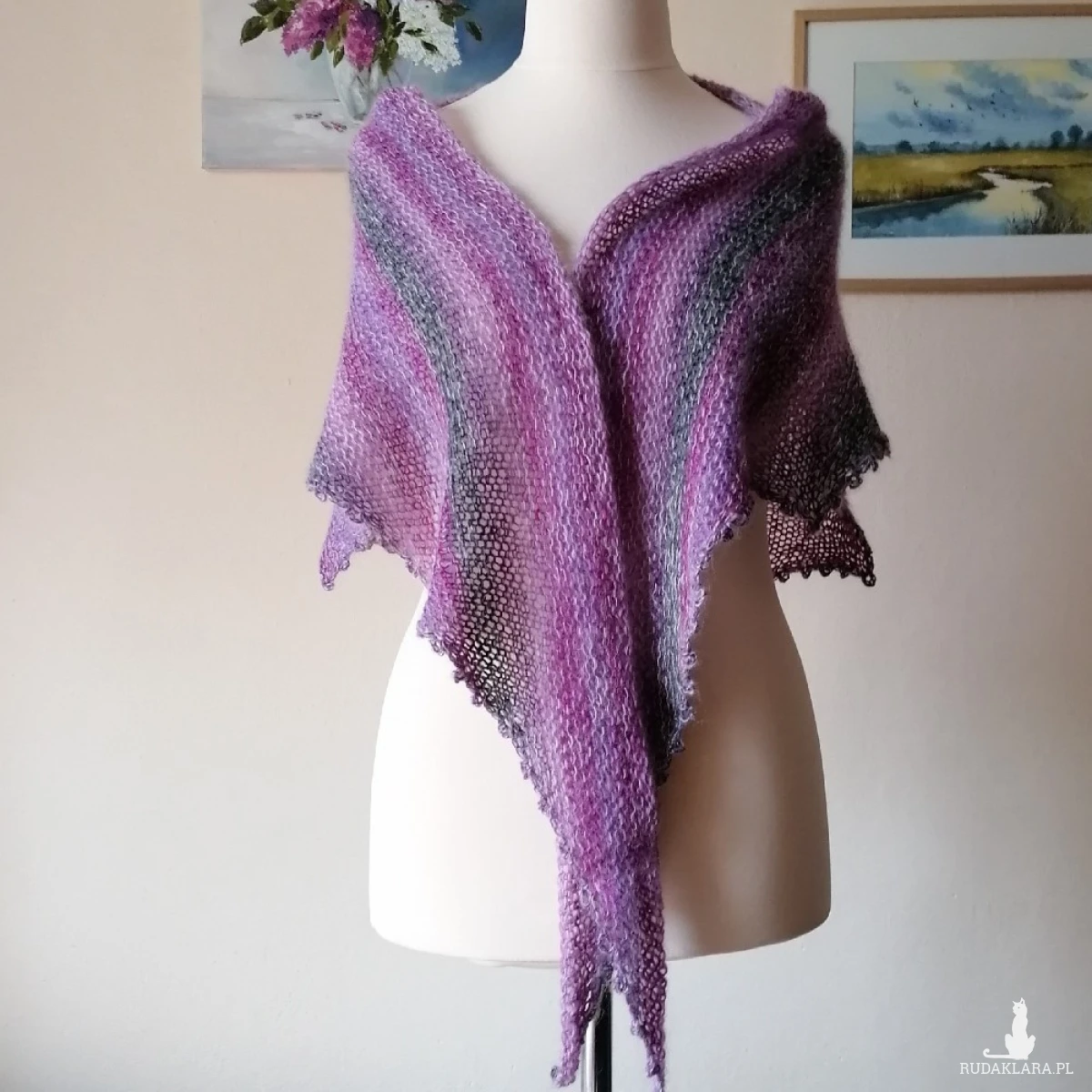 Ciekawa chusta wykonana ręcznie na drutach podwójną nitką z najwyższej jakości włóczek: cudownie miękkiego francuskiego moheru z jedwabiem (75%/25%) i delikatnej włóczki niemieckiego producenta o składzie: 85% merino, 15% poliamid. Kombinacja włóczek dała subtelny, twarzowy efekt kolorystyczny. Chusta jest ciepła, miła, delikatnie puchata, lekka. Jest "lejąca" i doskonale się układa. Latem z powodzeniem ochroni przy niepogodzie, a w chłodniejszych miesiącach będzie świetnym dodatkiem do dowolnych stylizacji. Ze względu na fason i miękkość chusty można ją dowolnie układać. Wymiary: 220 cm. bok najdłuższy, 70 cm wysokość trójkąta. Pranie wyłącznie ręczne.
