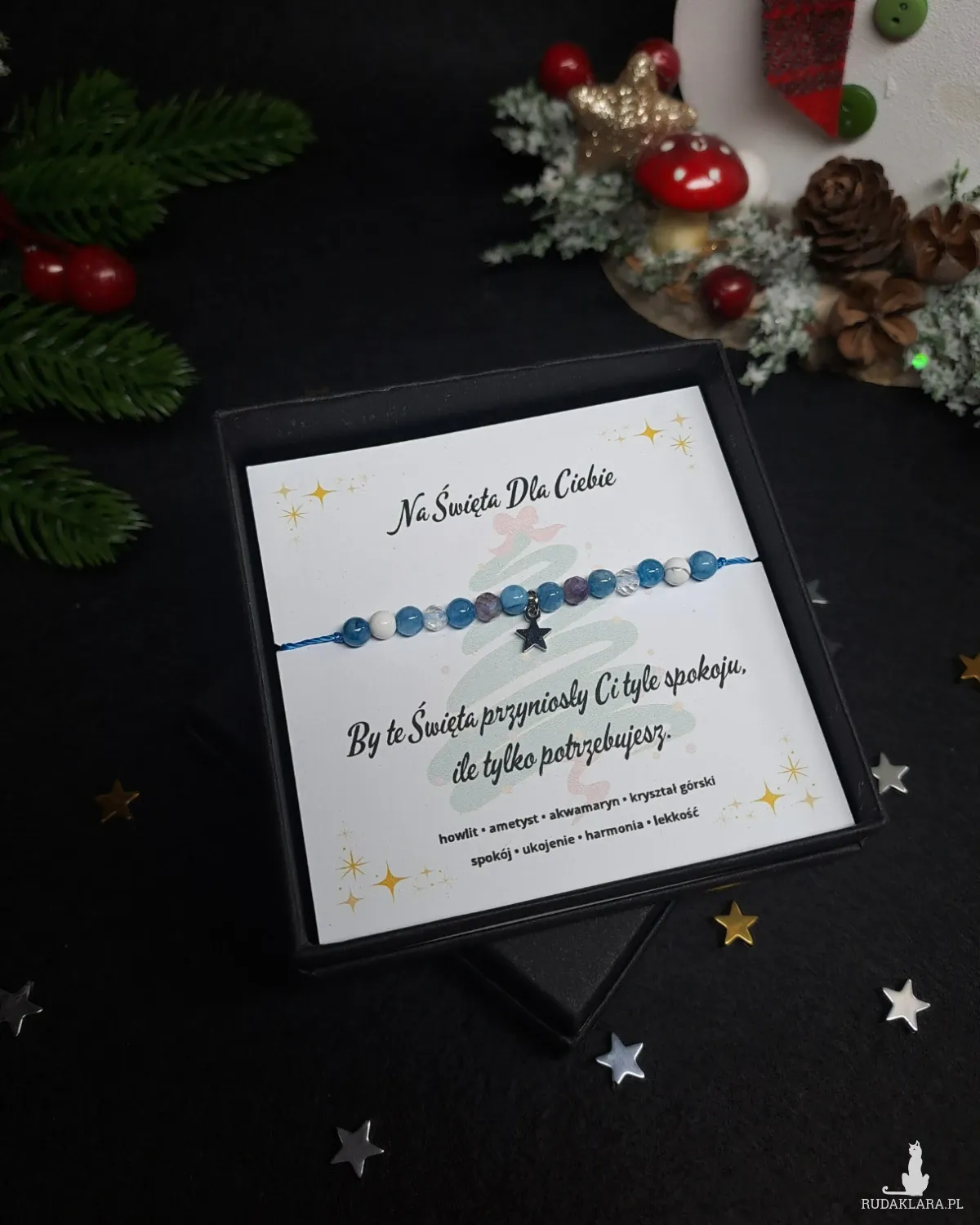 - Naturalne kamienie: howlit, ametyst, akwamaryn i kryształ górski — dobrane tak, by idealnie współgrały z zimowo-świąteczną kolorystyką.