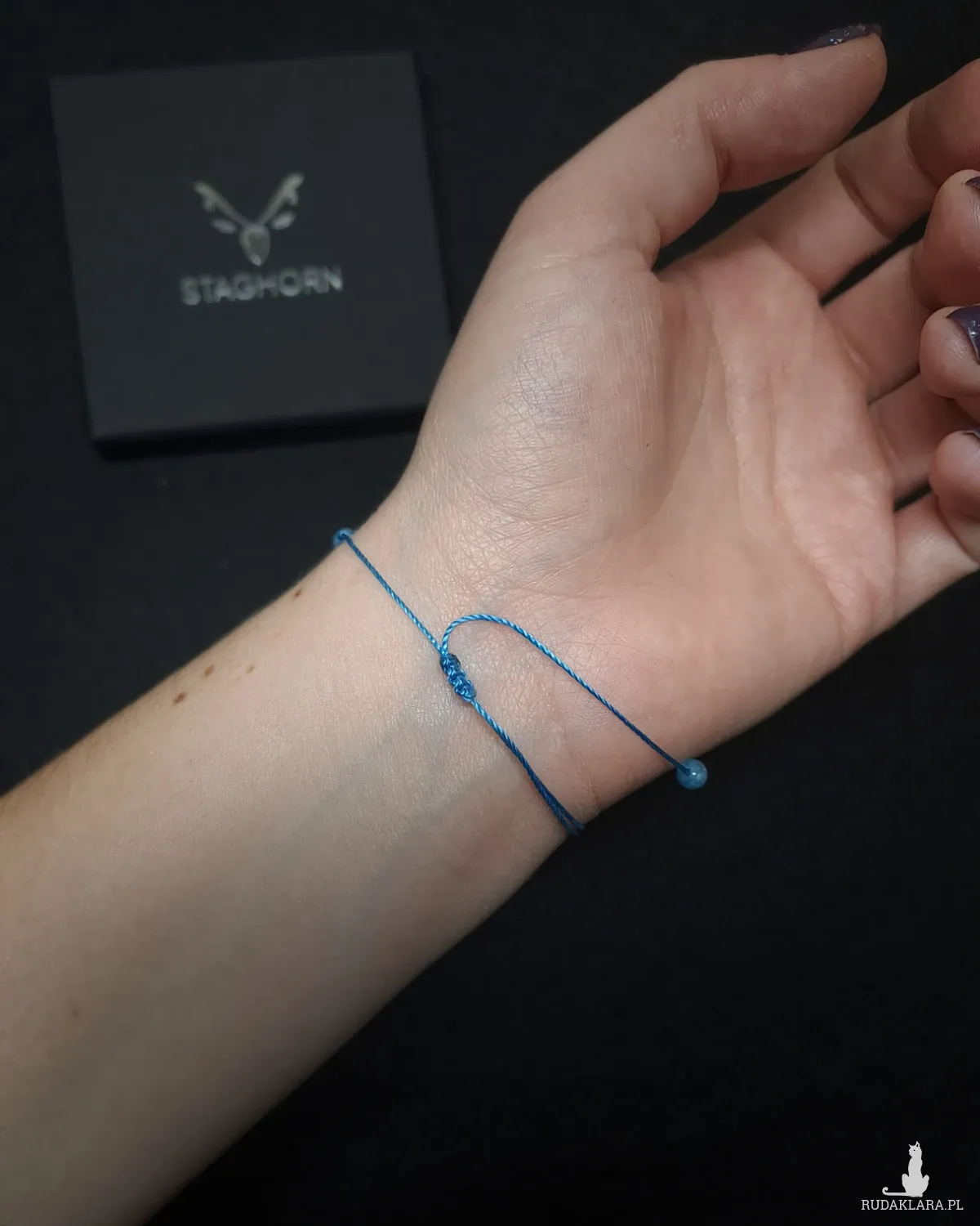 - Błękitny sznurek makramowy z regulowanym wiązaniem, które pozwala dopasować bransoletkę do każdego nadgarstka.