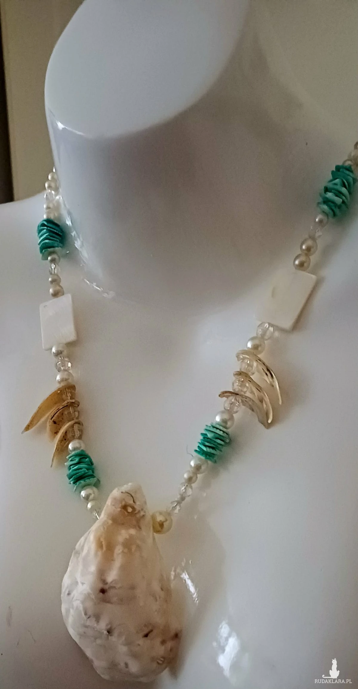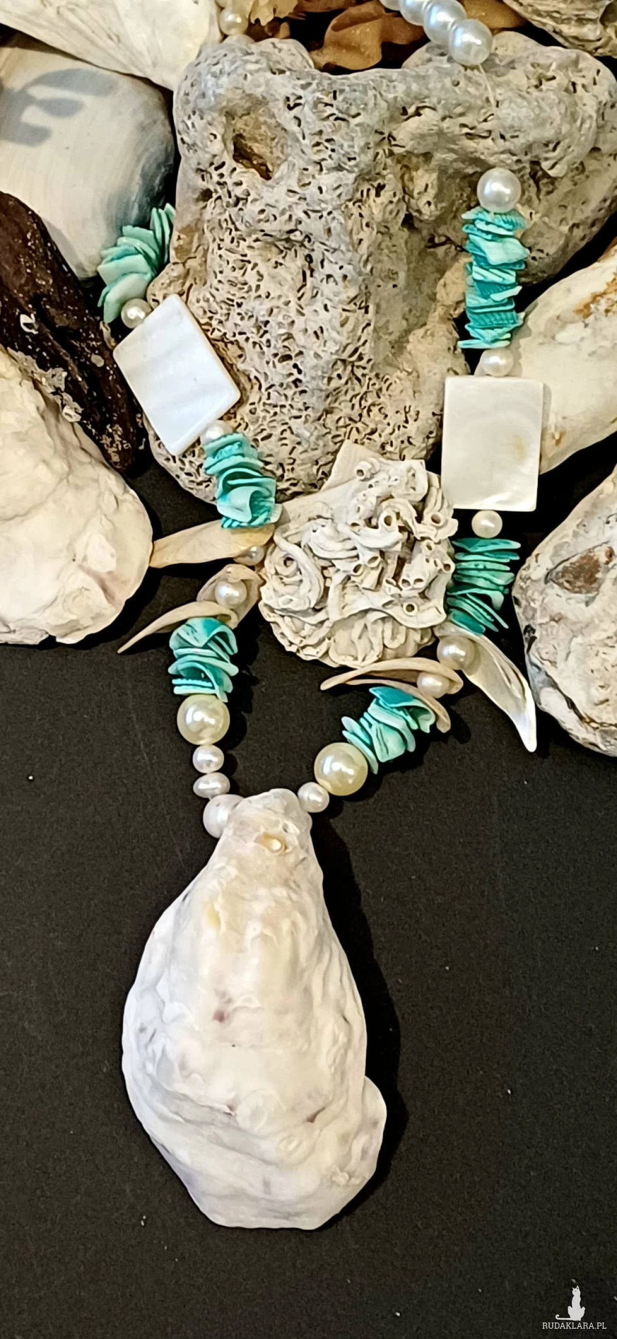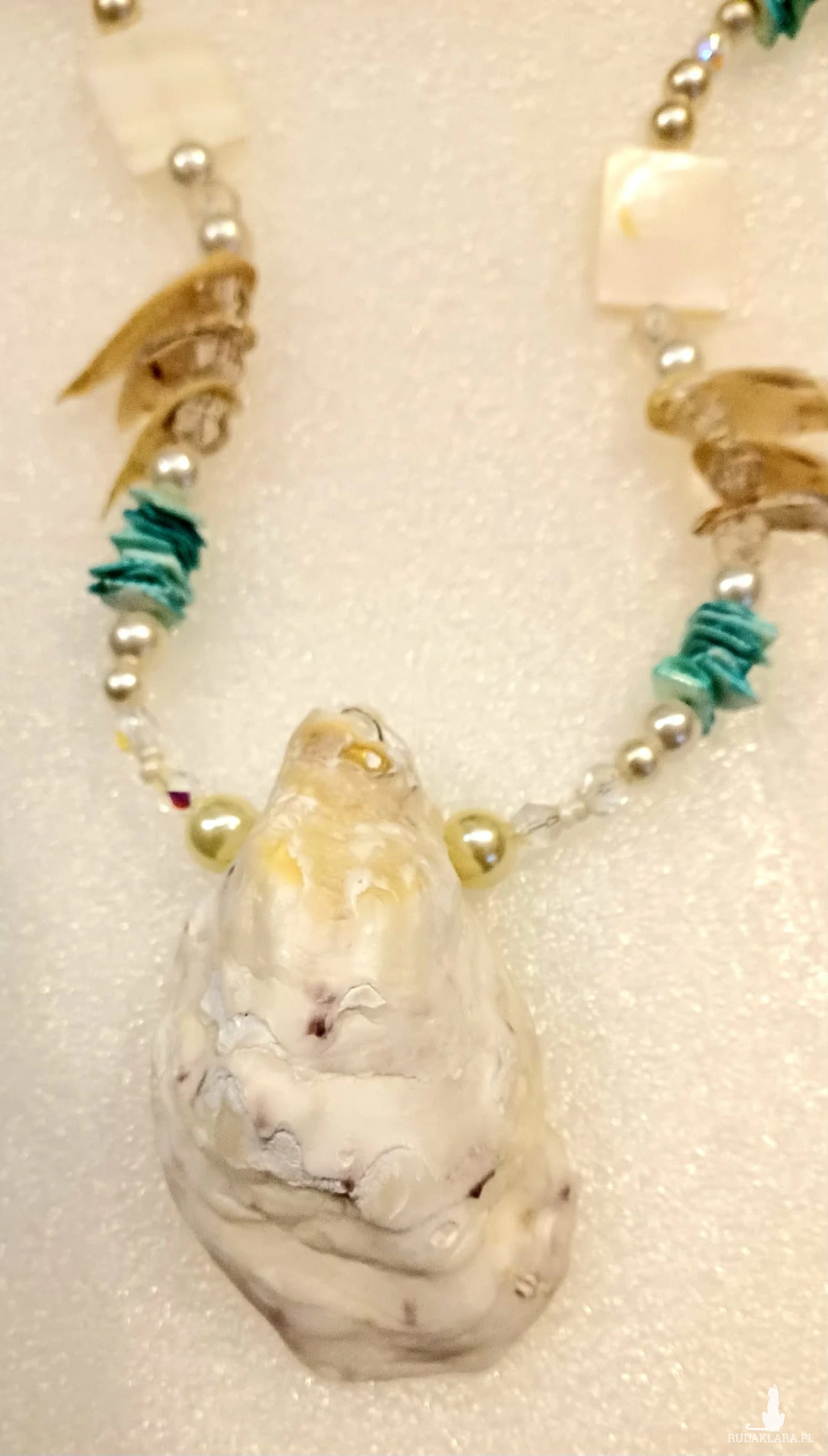 Naturalny, biały wisiorek z muszli ostrygi z Normandii 9x4 cm, - z perełkami, kryształami i kawałkami muszli. Długość naszyjnika z boku - 36 cm z muszlą. Symboliczne znaczenie muszli - Miłość i płodność. Ostrygi ( i ich muszle) od wieków kojarzone są z miłością i płodnością. W mitologii greckiej Afrodyta, bogini miłości, wyłoniła się z morza stojąc na muszli. Muszla, jako znak żywiołu wody, symbolizuje kobiecość, emocje, a także nieskończoność i nowe życie. Muszle morskie są często uważane za amulety przynoszące szczęście i ochronę. W niektórych wierzeniach muszle ostryg są uważane za talizmany odwagi, spokoju, kreatywności i ochrony. Ostryga skrywająca perłę może być postrzegana jako symbol tajemnicy i ukrytego piękna.