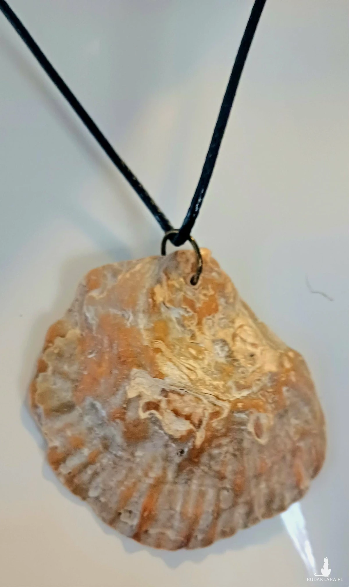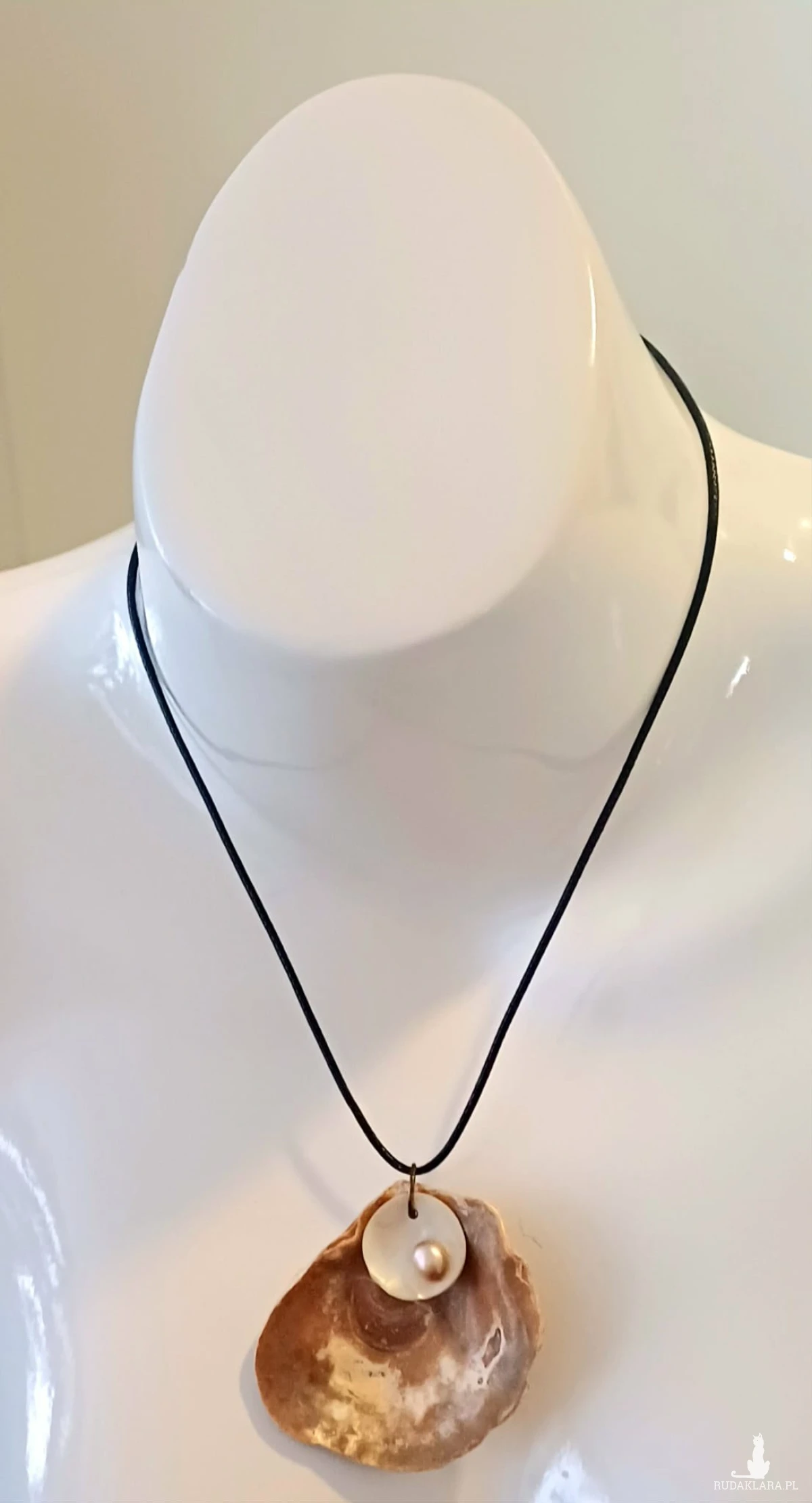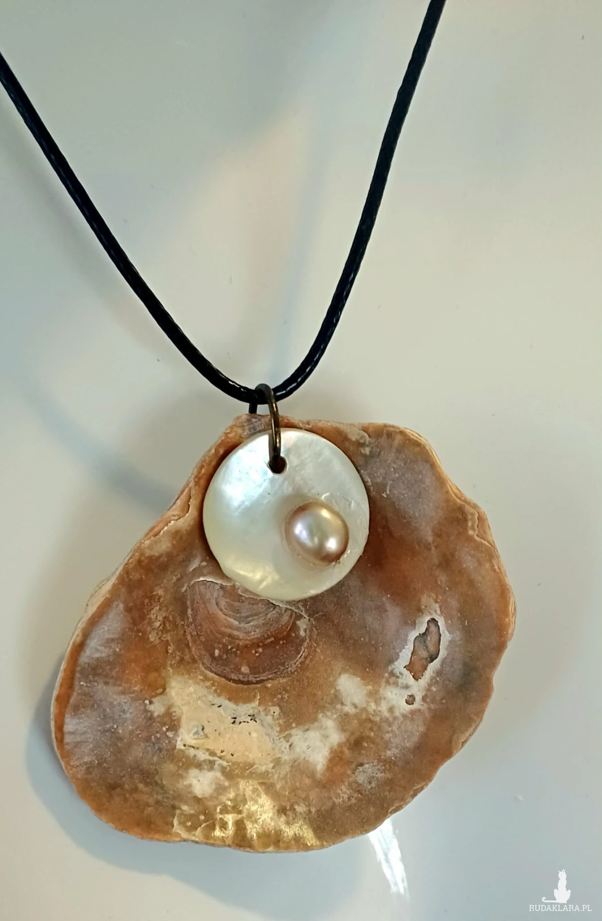 Wspaniały wisiorek z muszli ostrygowej , masy perłowej i perełki na sznurku 48 cm z regulowanym zapięciem.