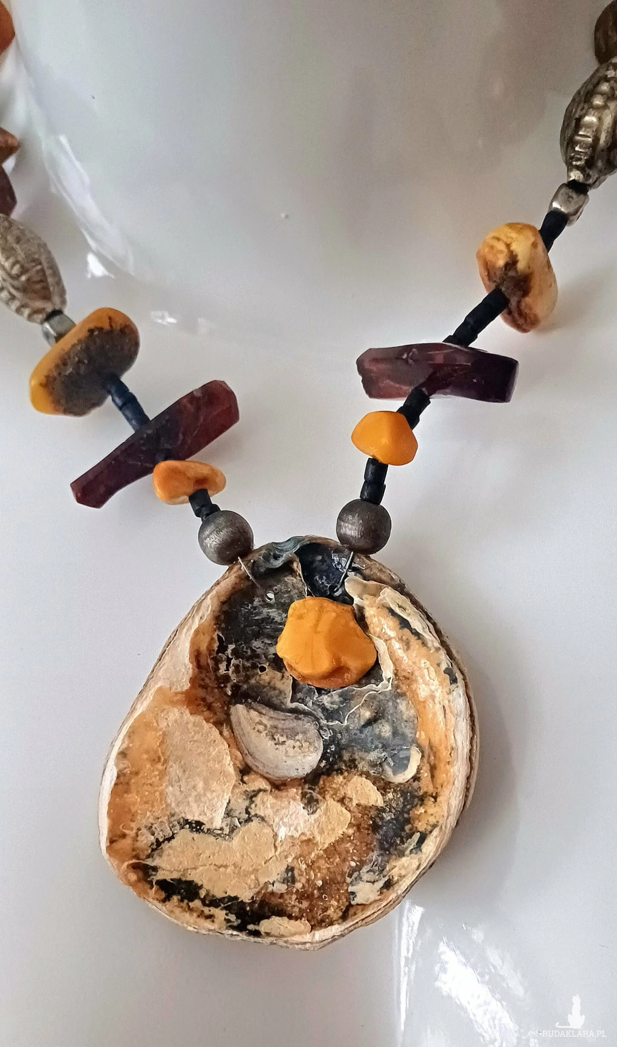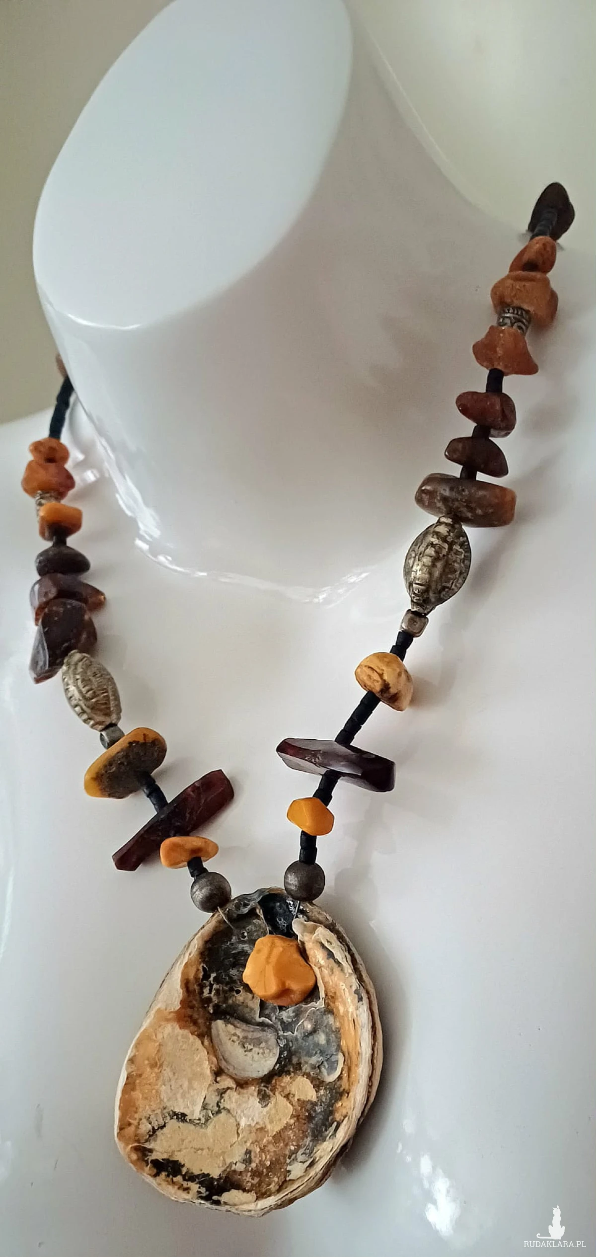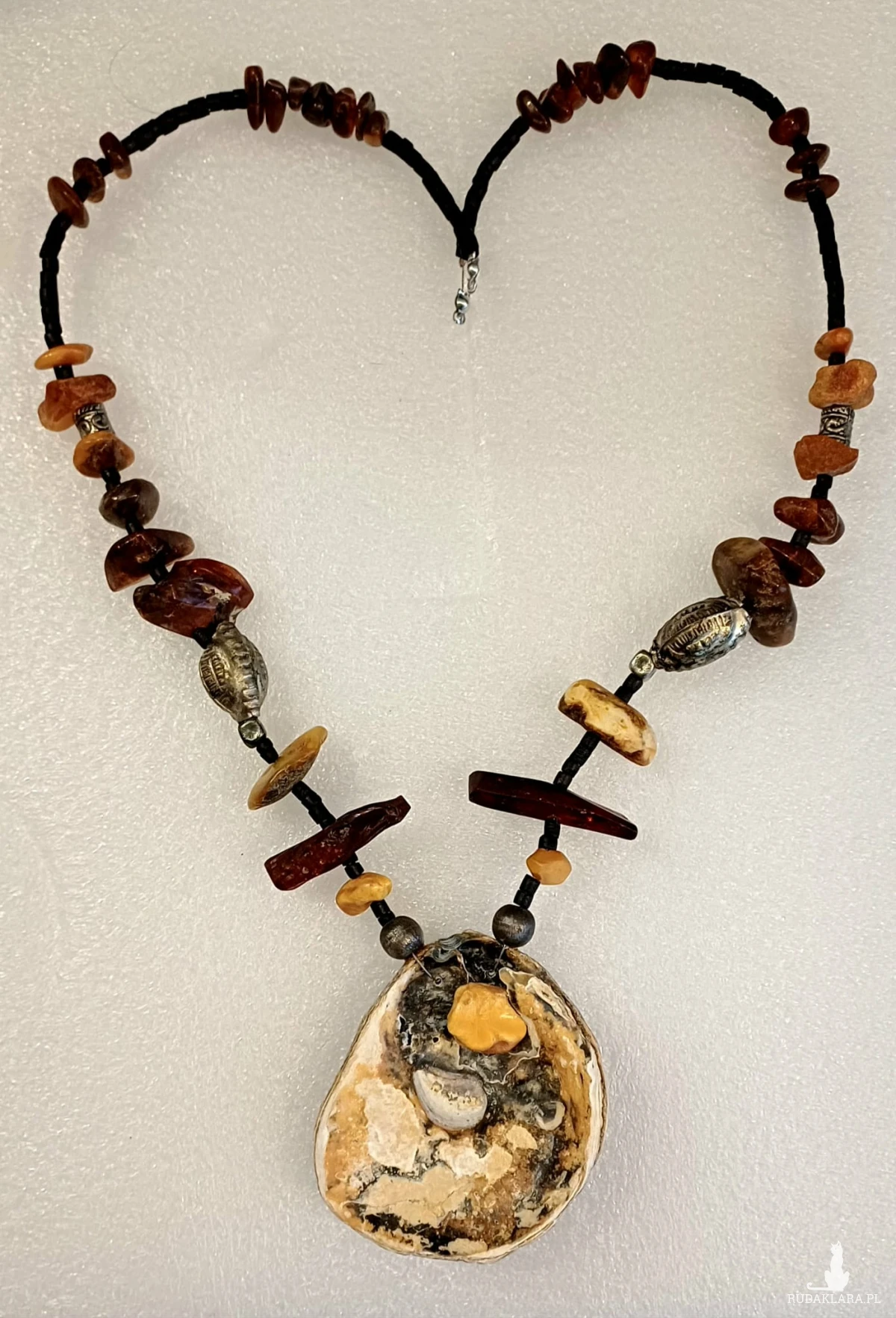 Ta muszla może być Twoja, a jedno jest pewne - nie będzie drugiego takiego naszyjnika - bo ta muszla jest jedyna w swoim rodzaju - natura tworzy najpiękniejsze dzieła sztuki! • Materiał: Naturalna, beżowa zawieszka z muszli ostrygowej z Normandii -wymiary 7x6 cm, z bursztynem w środku - do tego dodałam bursztyn bałtycki (1-4 cm), drewniane koraliki i srebrne dodatki!