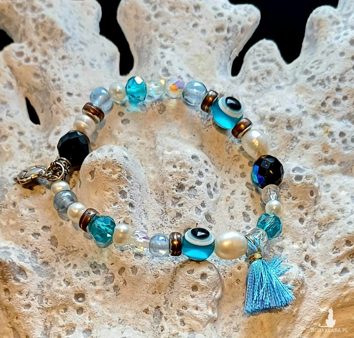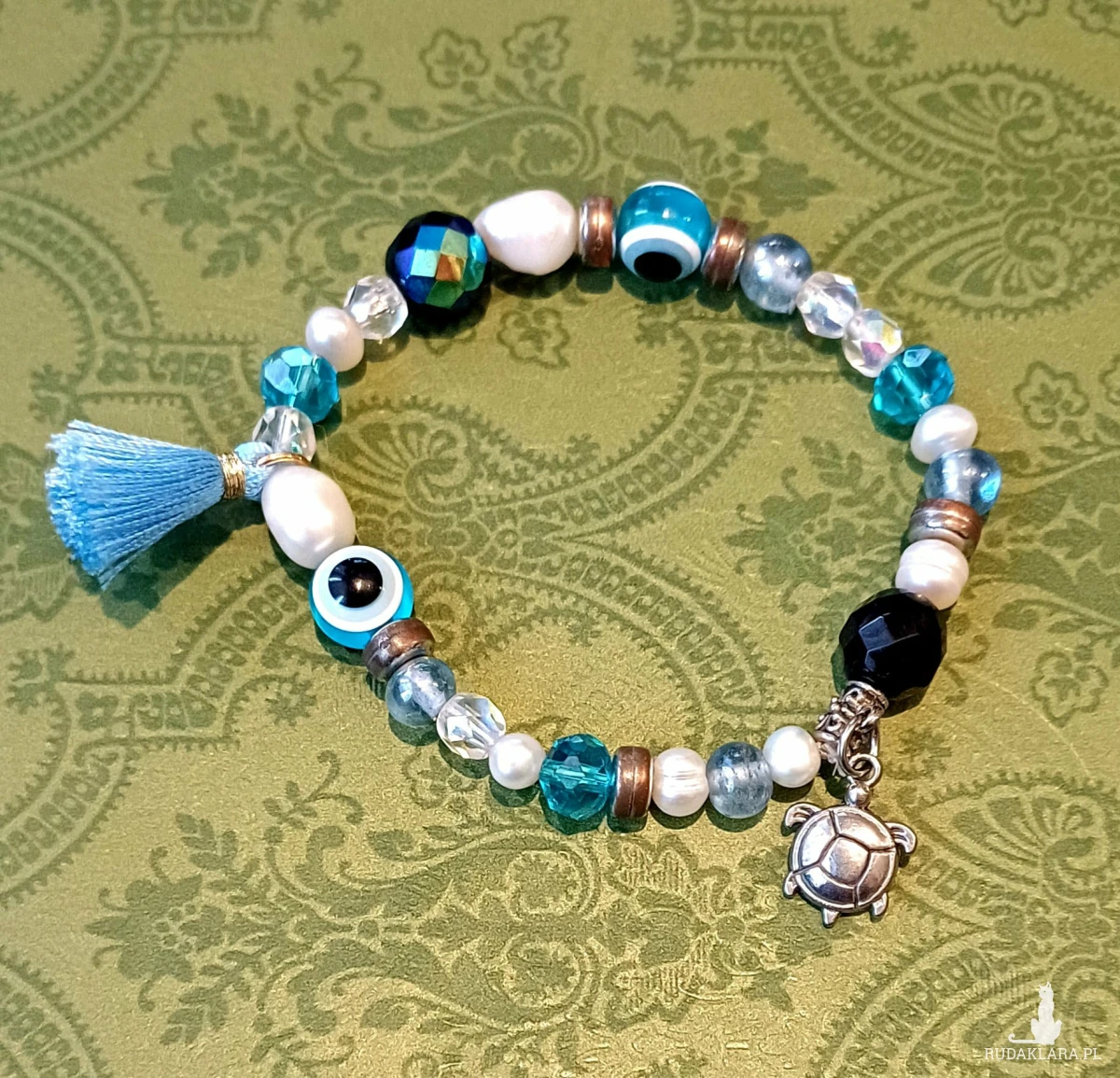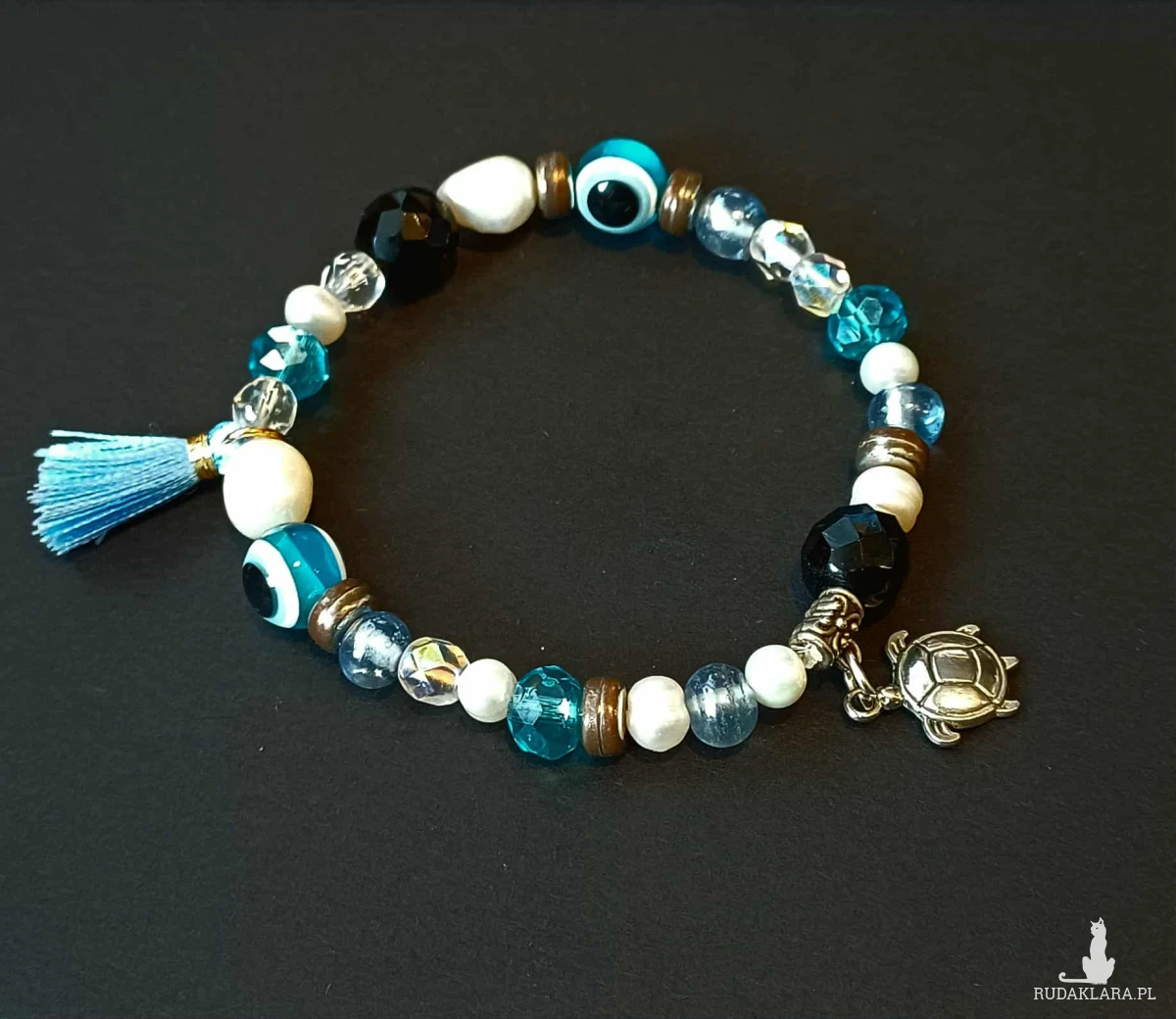 Urocza biało- niebieska bransoletka z okiem proroka ( a nawet z dwoma) , słodką zawieszką w kształcie żółwia i chwościkiem. Do tego dodałam rzeczne perełki i kryształowe koraliki.