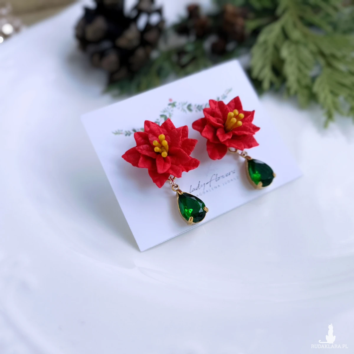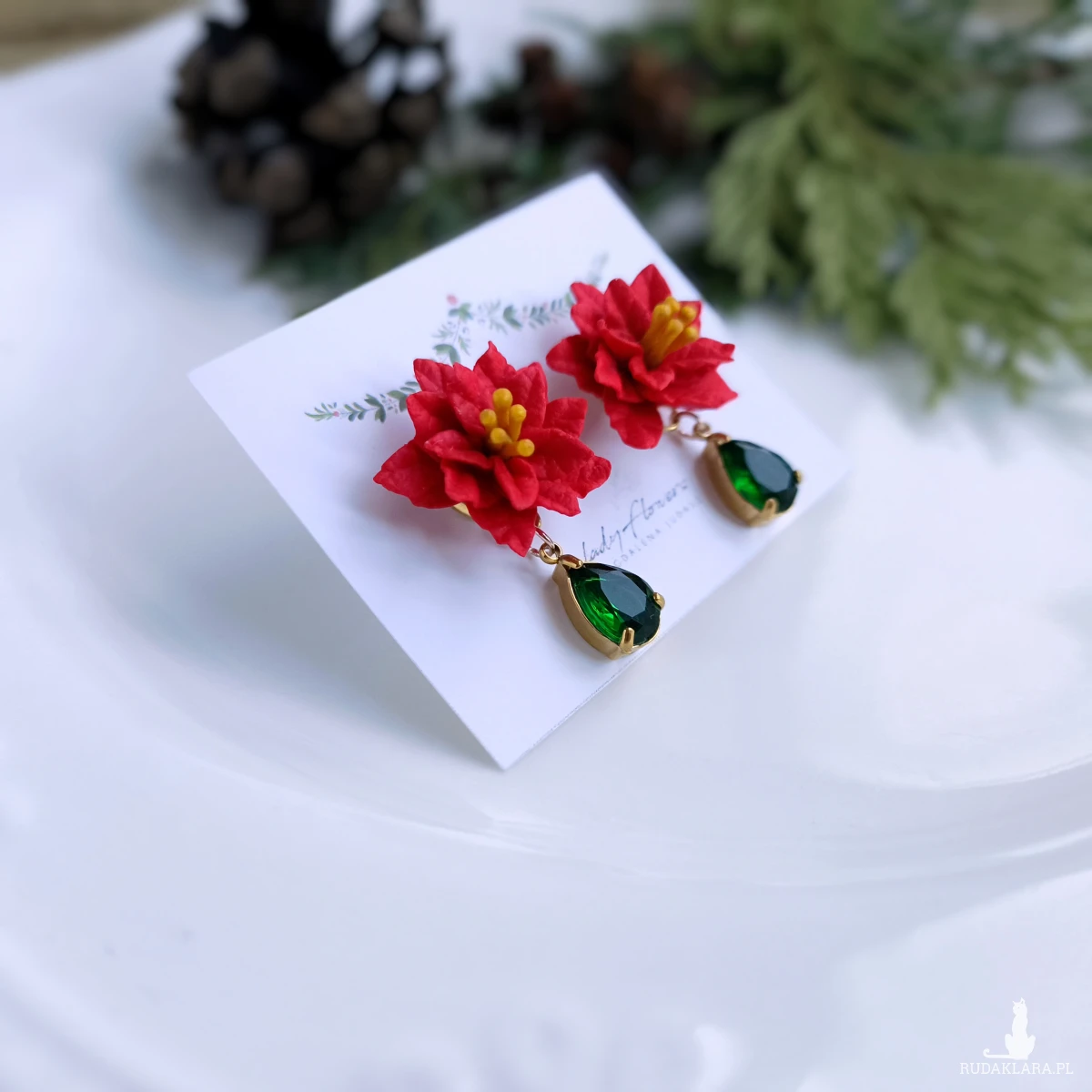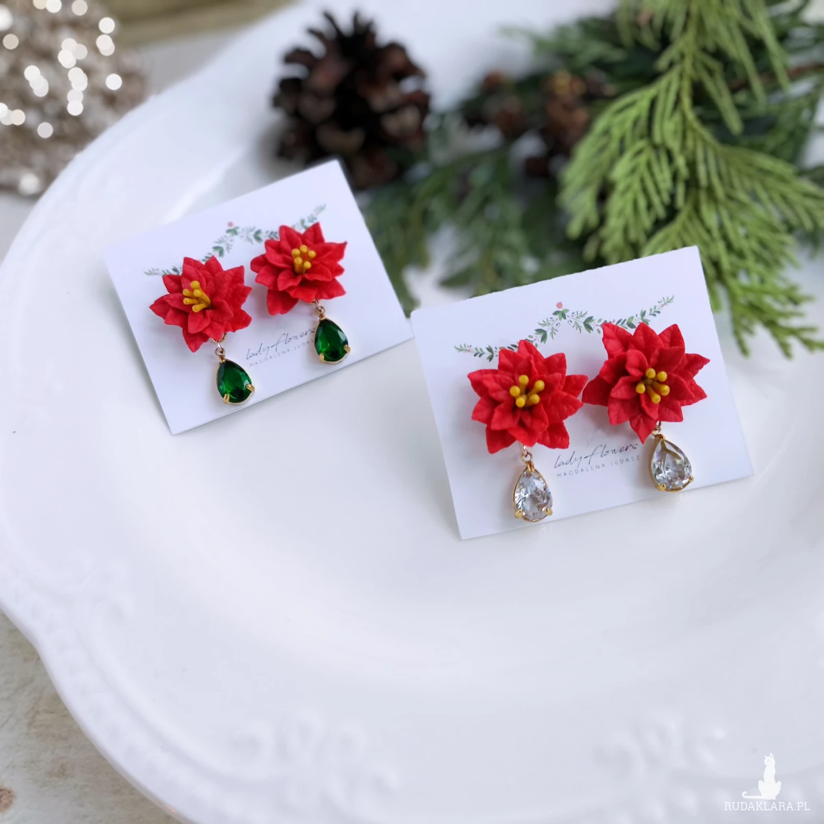 Eleganckie, świąteczne kolczyki z kwiatami poisencji z kryształkiem