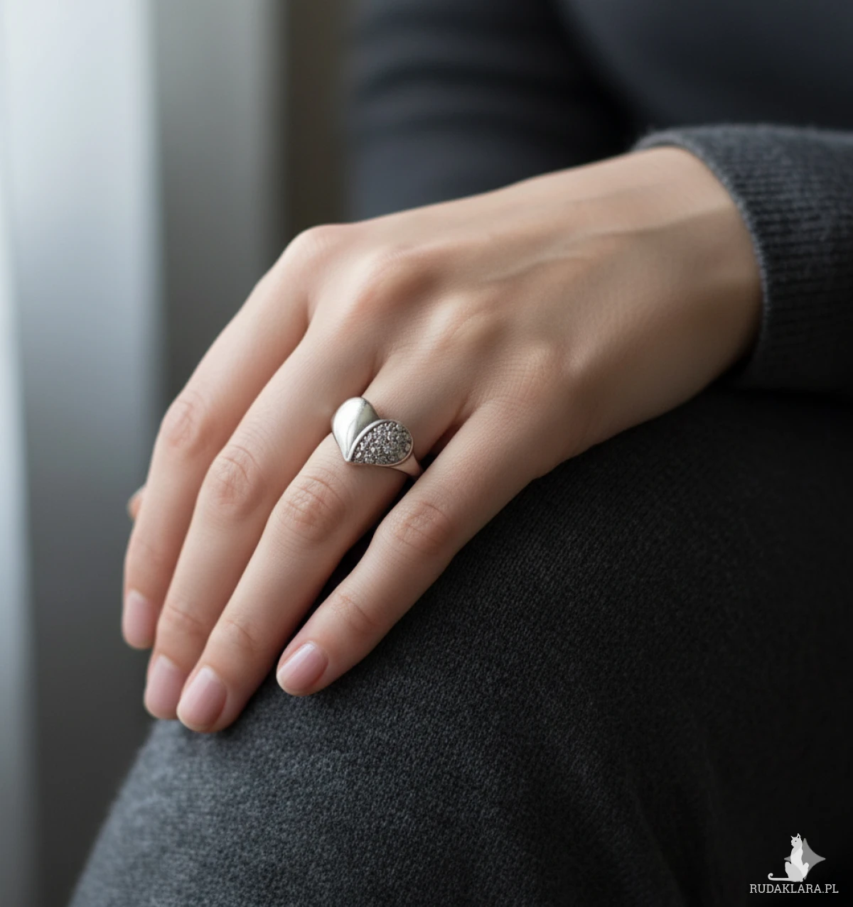 Serce o unikalnym, dwustronnym wykończeniu – jedna połowa jest gładka i polerowana na wysoki połysk, druga posiada efektowną fakturę imitującą delikatne mikroosadzenie (pavé), co nadaje mu luksusowy blask.