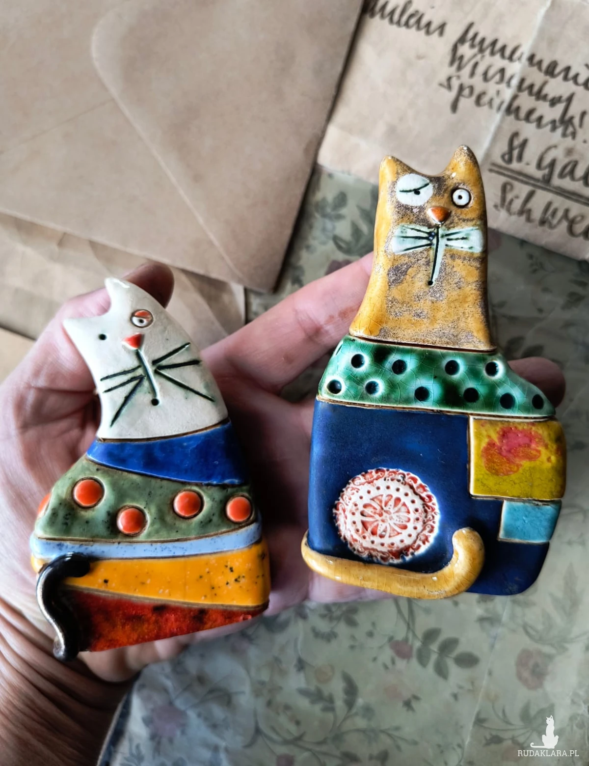 Figurki kotów do postawienia o wymiarach ok 8 cm x 10 cm większy oraz 7,5 c, x 98 cm mniejszy, wykonane z ceramiki. Polecam serdecznie.