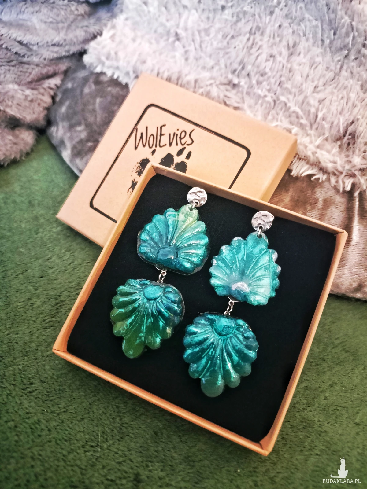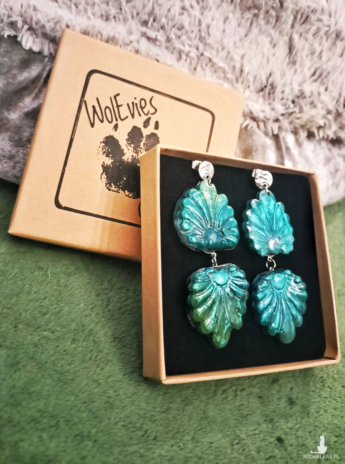 kolczyki długie wiszące • kolczyki liście handmade • kolczyki z glinki polimerowej • kolczyki butelkowa zieleń • kolczyki perłowe zielone • kolczyki żywica Resin Pro • biżuteria handmade elegancka • kolczyki dla niej wyjątkowy prezent • kolczyki stal nierdzewna srebrne • kolczyki prezent świąteczny