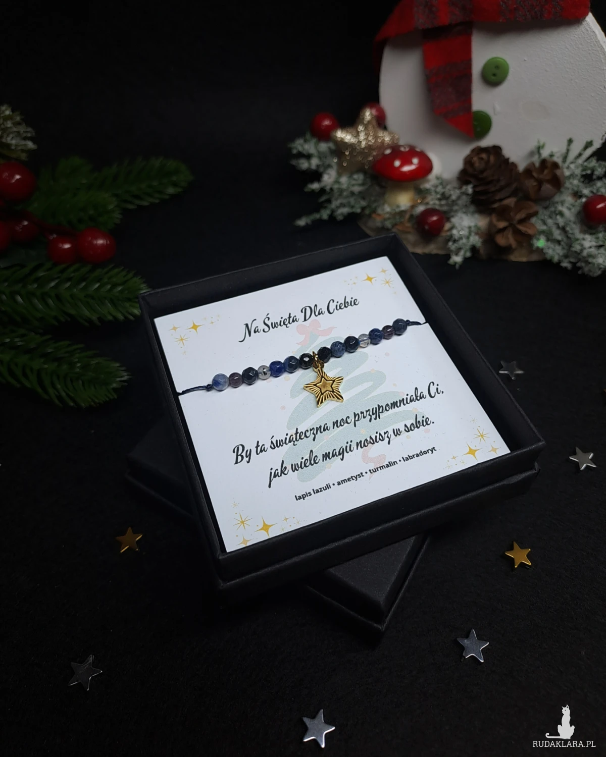 Bransoletka „Magia Świątecznej Nocy” to biżuteria, która zachwyca głębią kolorów i symboliką — jakby zamykała w sobie fragment zimowego nieba, tajemnicę gwiazd i ciepło świątecznego światła. Jej granatowo-fioletowe odcienie przywodzą na myśl najpiękniejsze grudniowe wieczory, kiedy w ciszy można poczuć, że magia naprawdę istnieje. To idealny prezent dla każdej kobiety — od córki po babcię — która potrzebuje przypomnienia, jak wiele światła i piękna nosi w sobie.