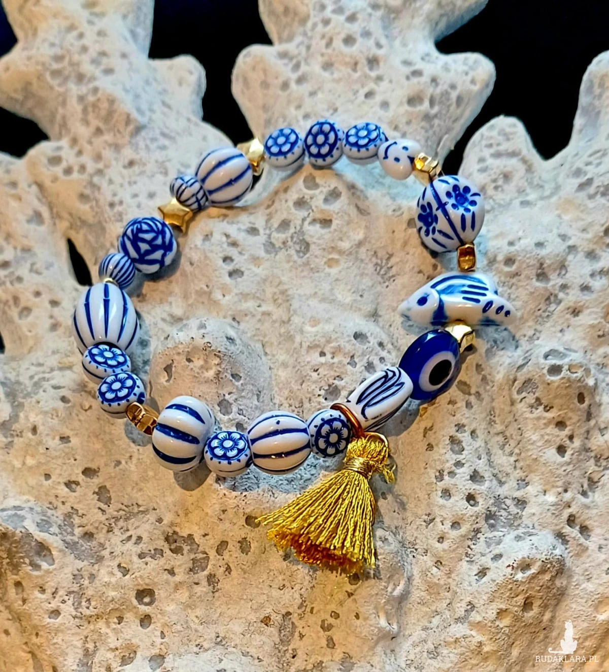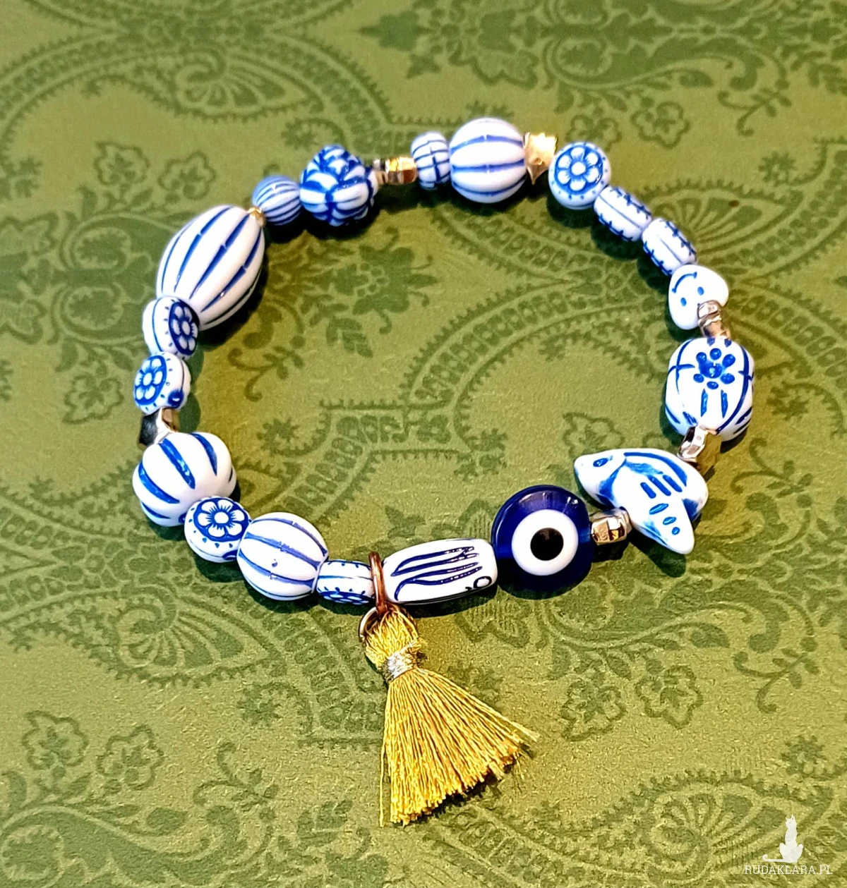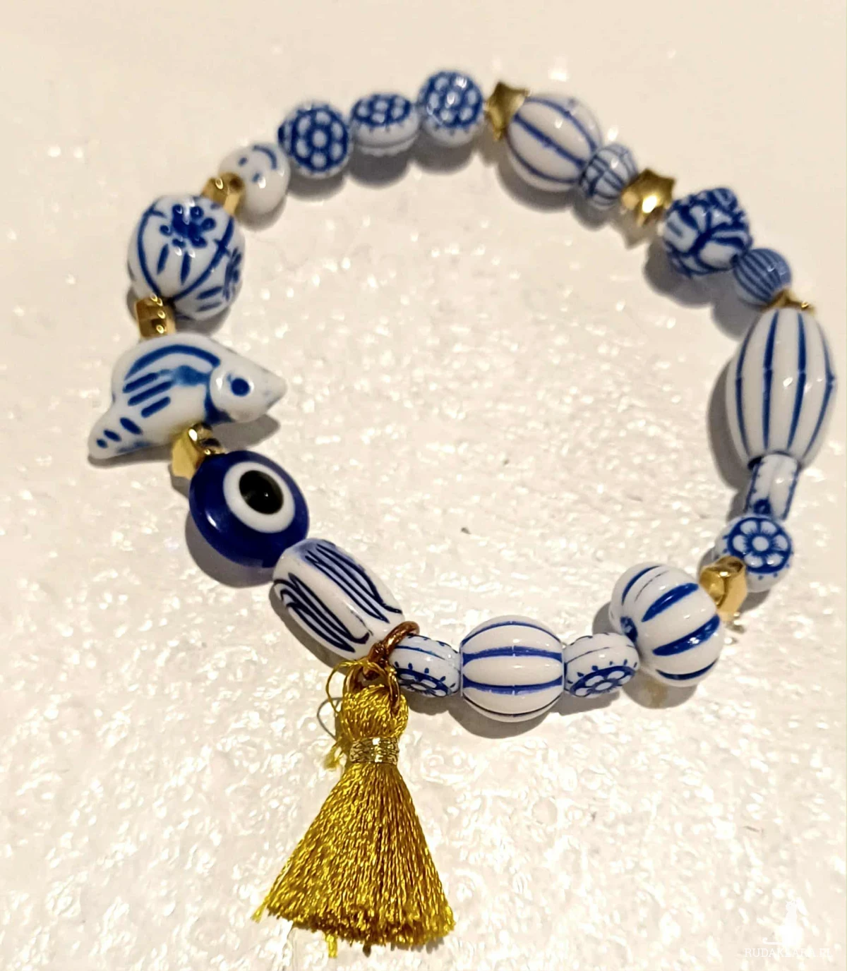 Urocza bransoletka : oko proroka ( symbol ochronny ) akrylowe koraliki przypominają porcelanę , do tego dodałam gwiazdki w złotym kolorze , serduszko "Smile" ( każdy uśmiechnie się jak go odkryje ) - do tego mały złoty chwościk.