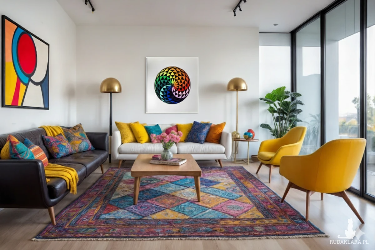Użycie pełnego spektrum barw tęczy oraz strategiczne rozmieszczenie cienia (czerń) i światła (białe kropki) nadaje rysunkowi głębię i wibrację.