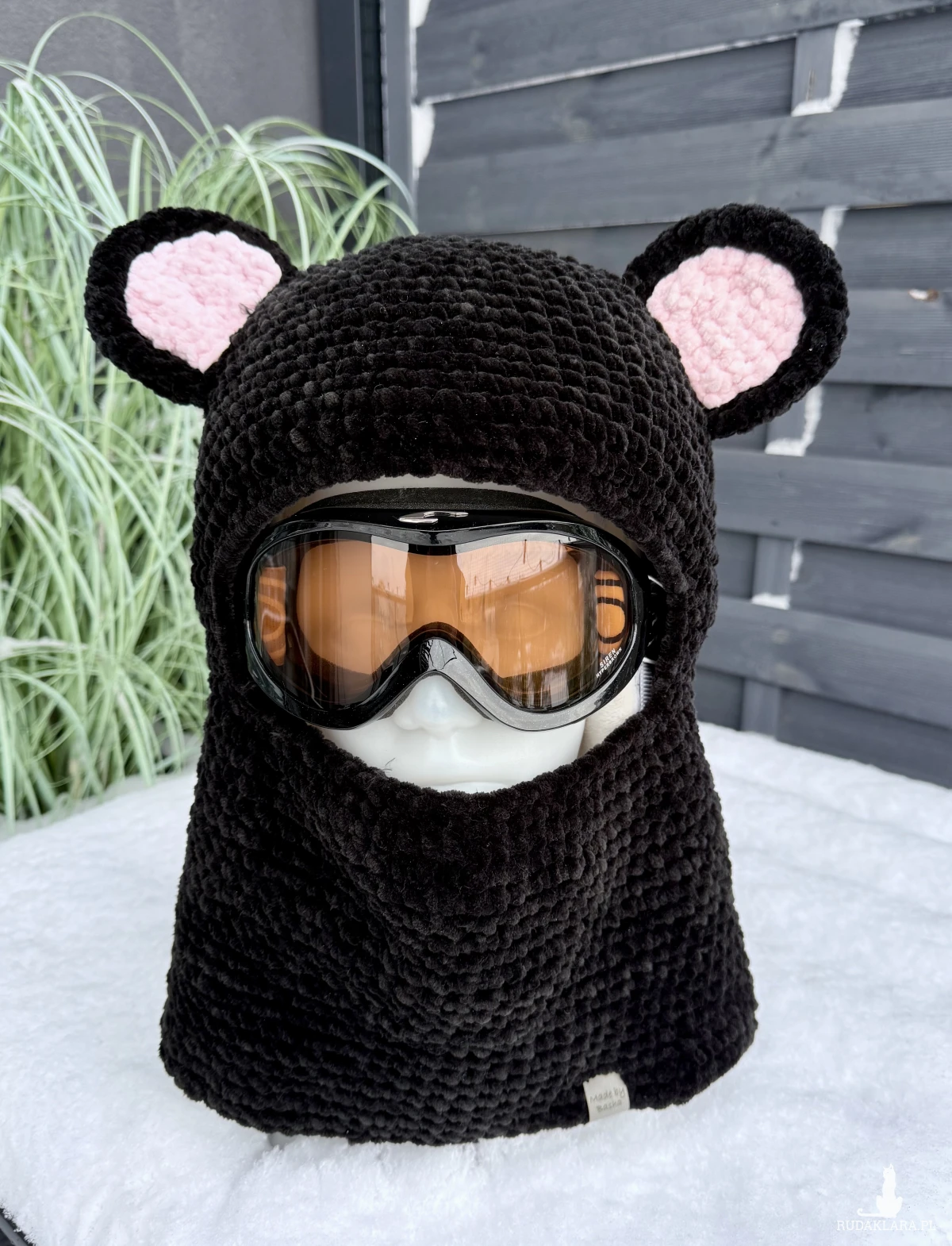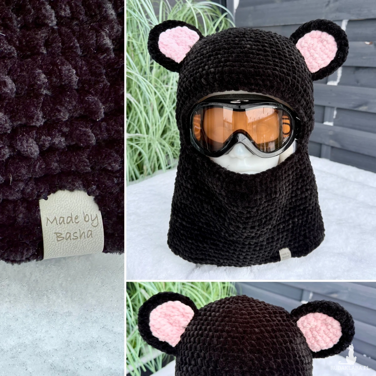 Ręcznie wykonana na szydełku kominiarka na kask narciarski z niezwykle miękkiej, przyjemnej w dotyku włóczki chenilowej.