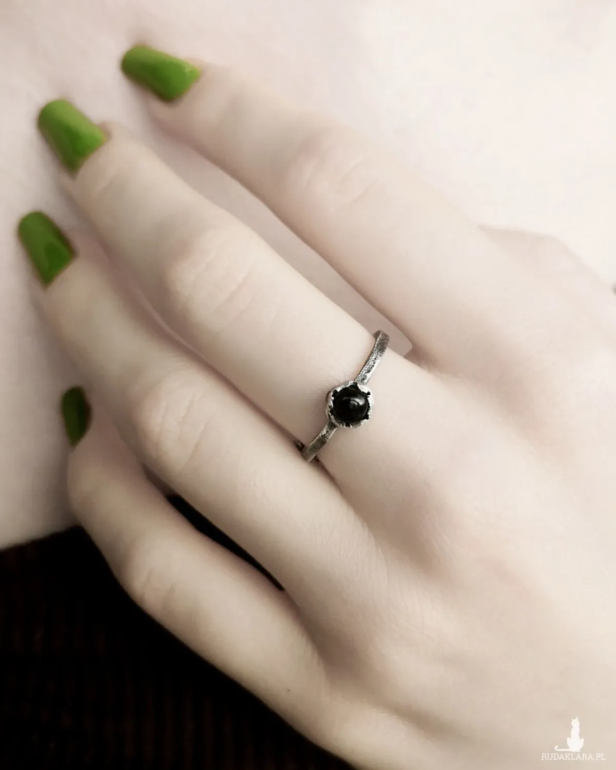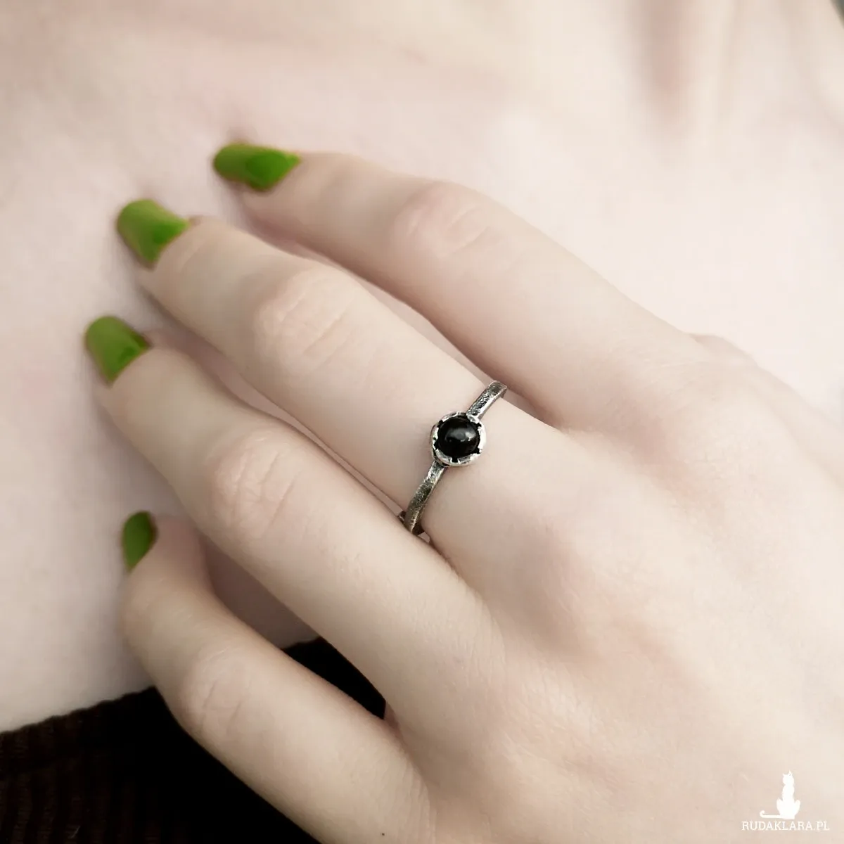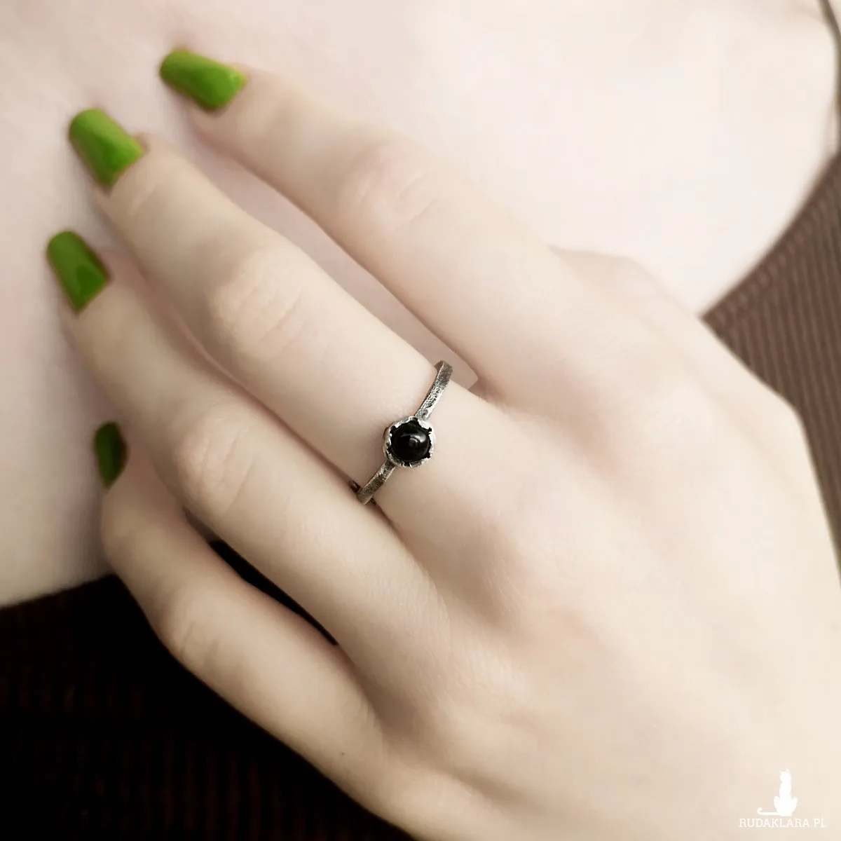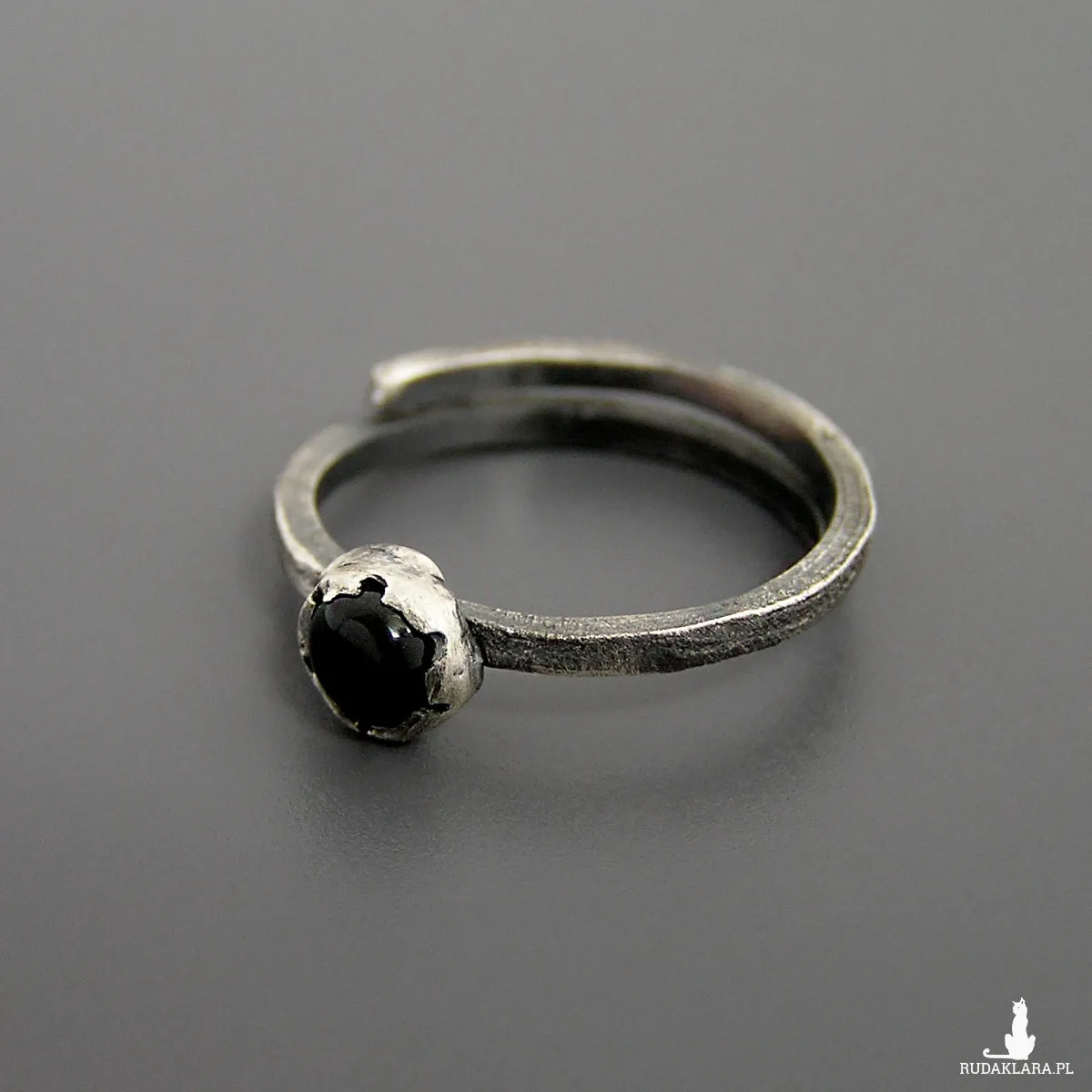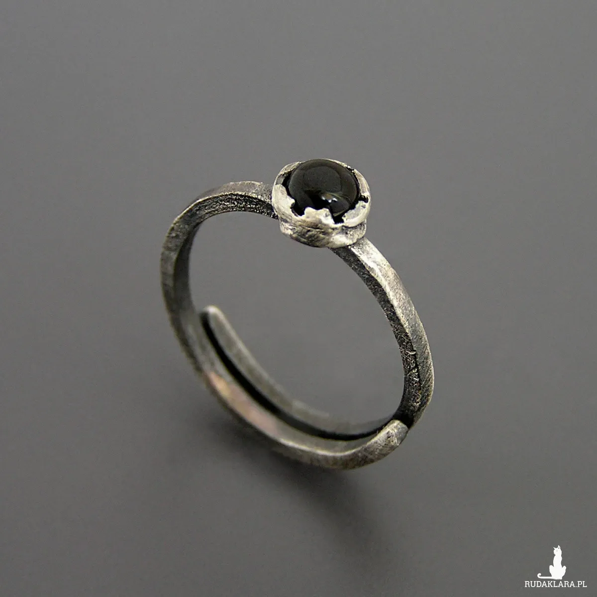 Surowy pierścionek z onyksem o średnicy 5 mm.