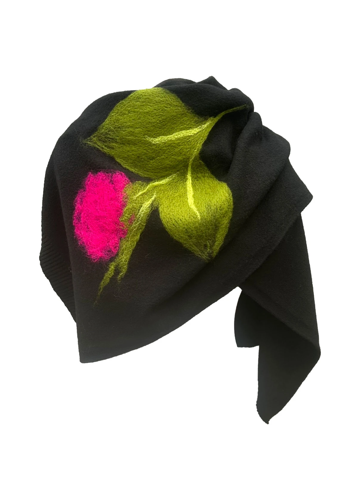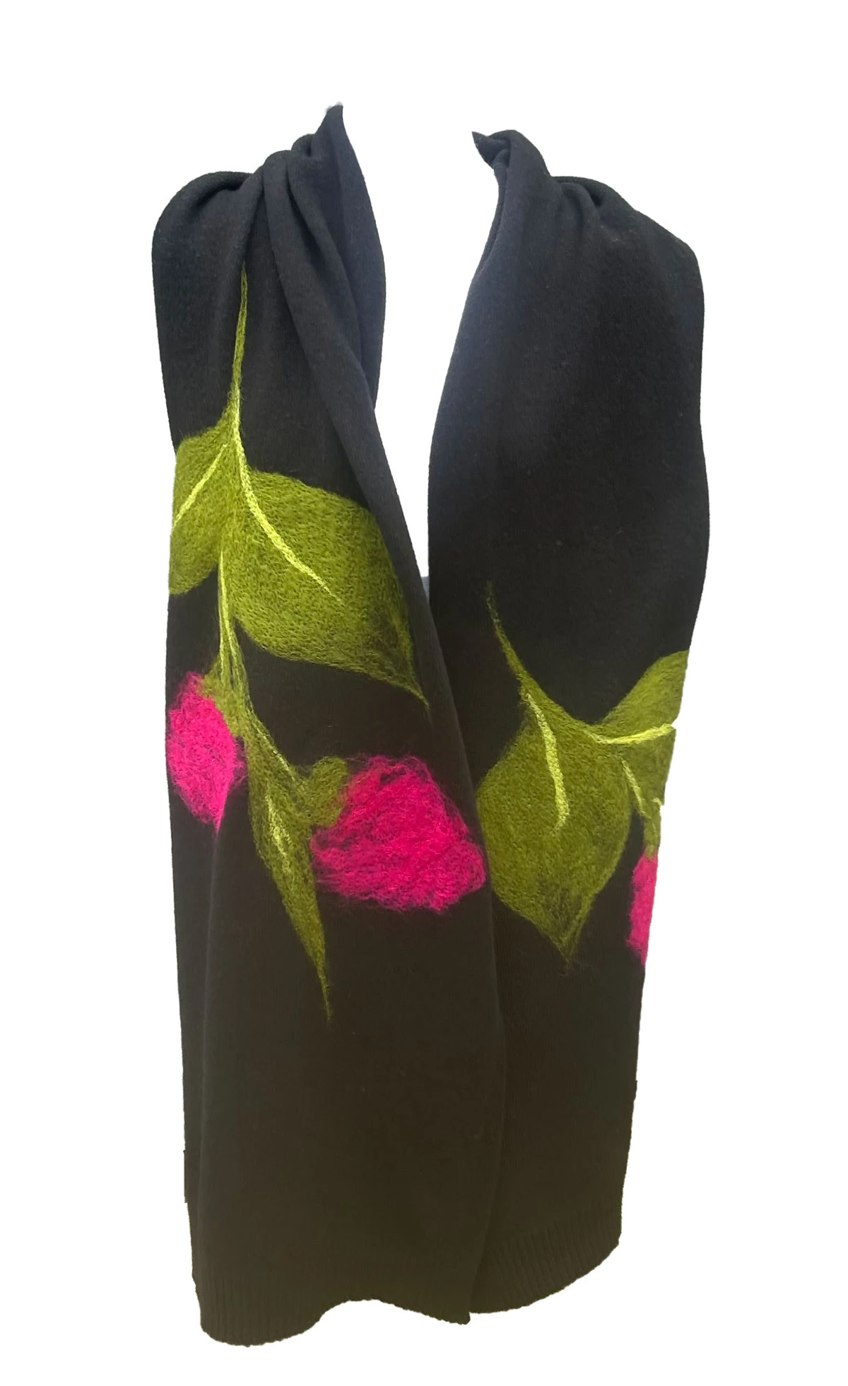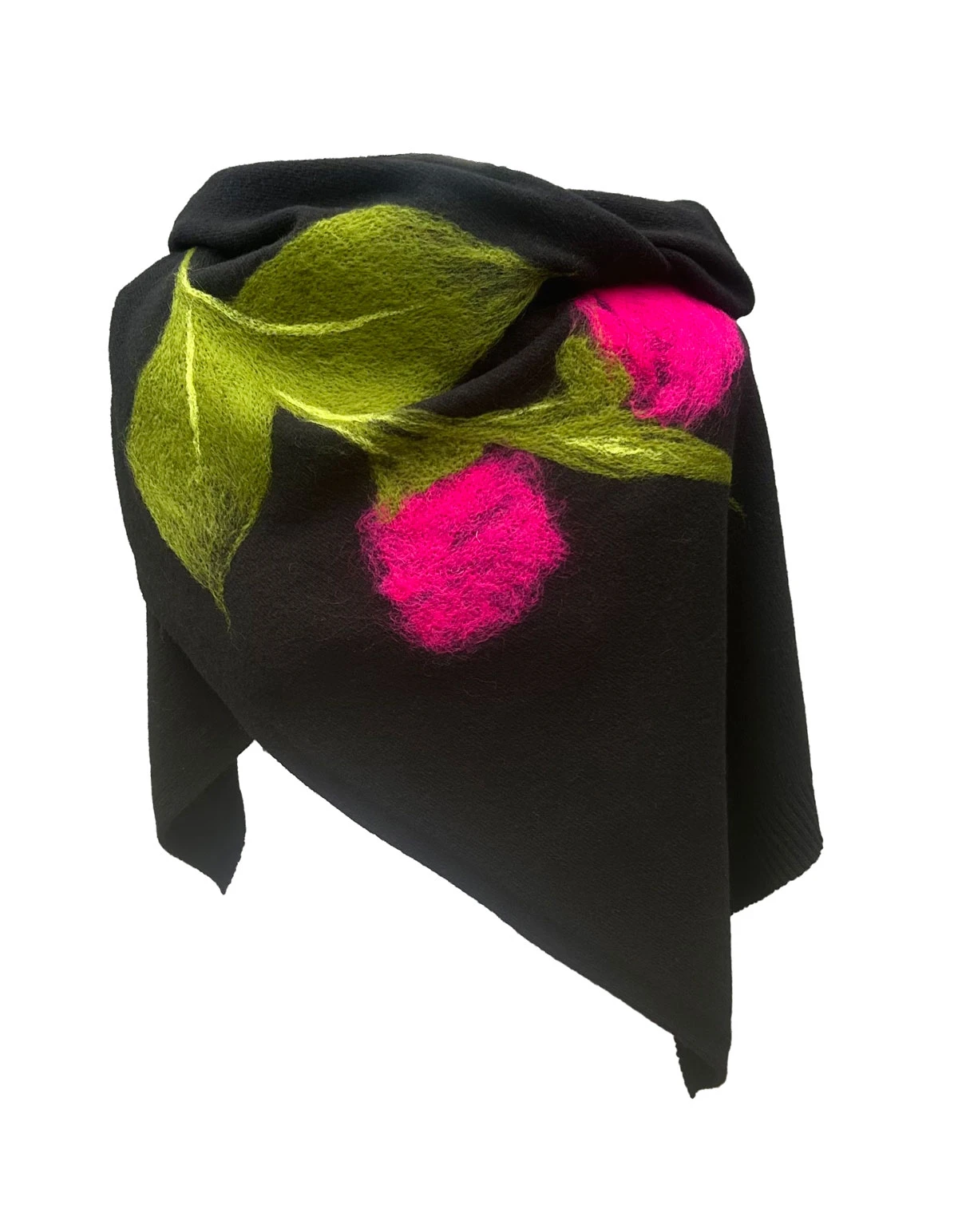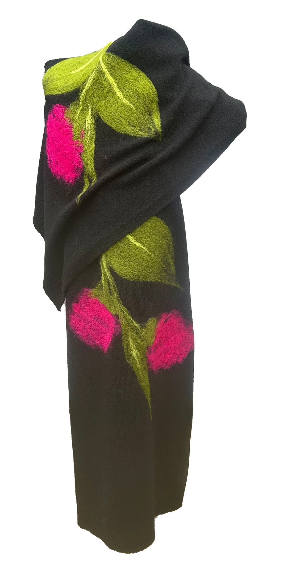 Czarny wełniany szal malowany wełną zdobiony kwiaty