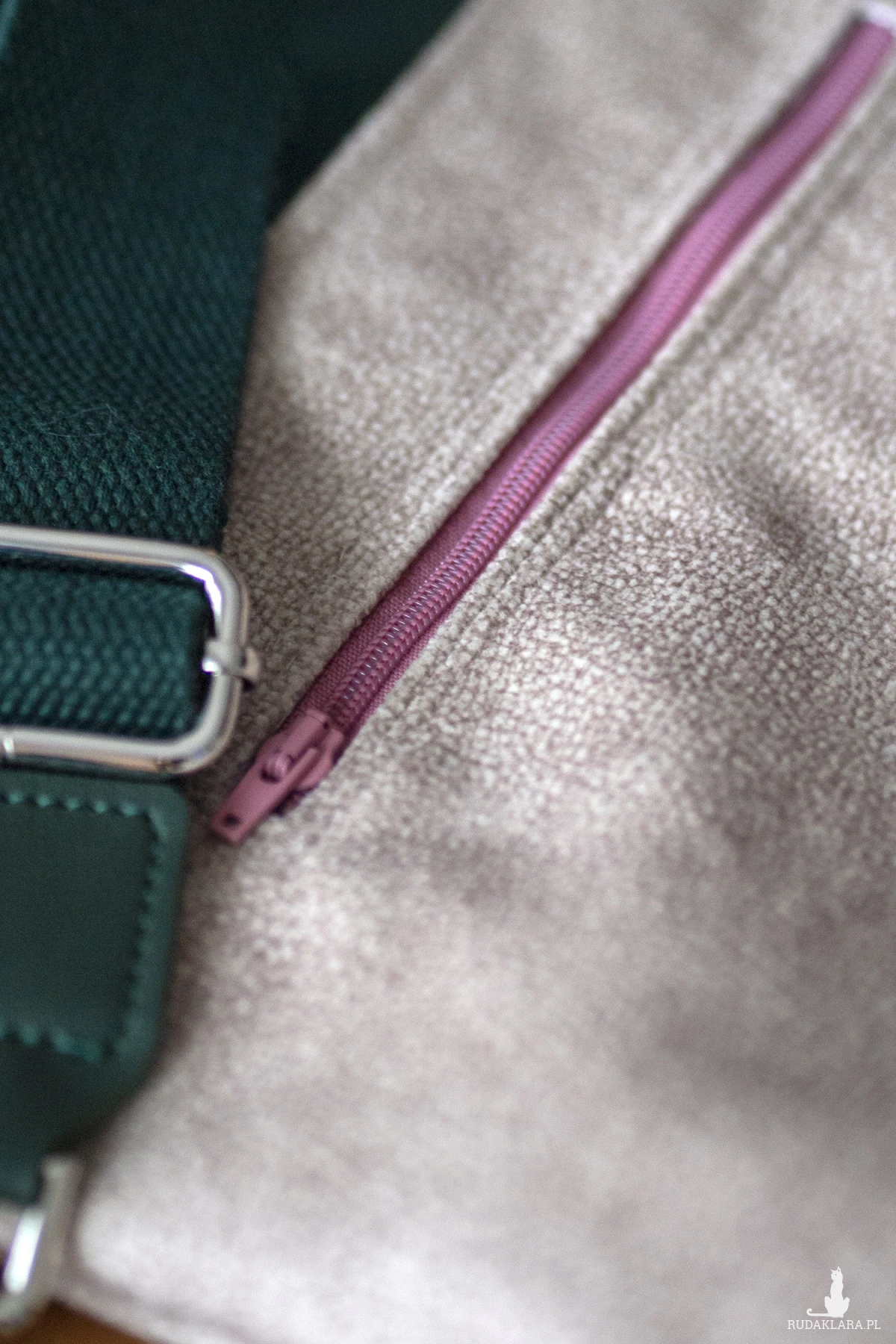 Torebka posiada regulowany zielony pasek i srebrne okucia.