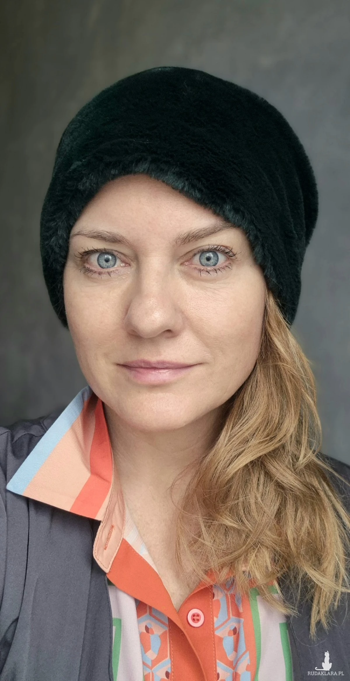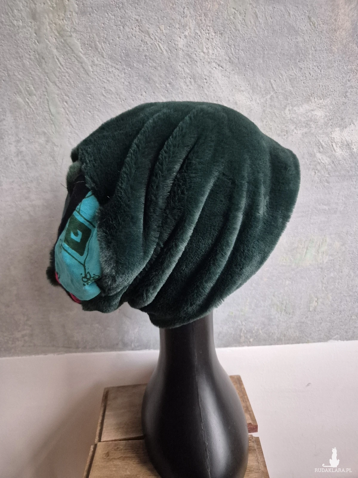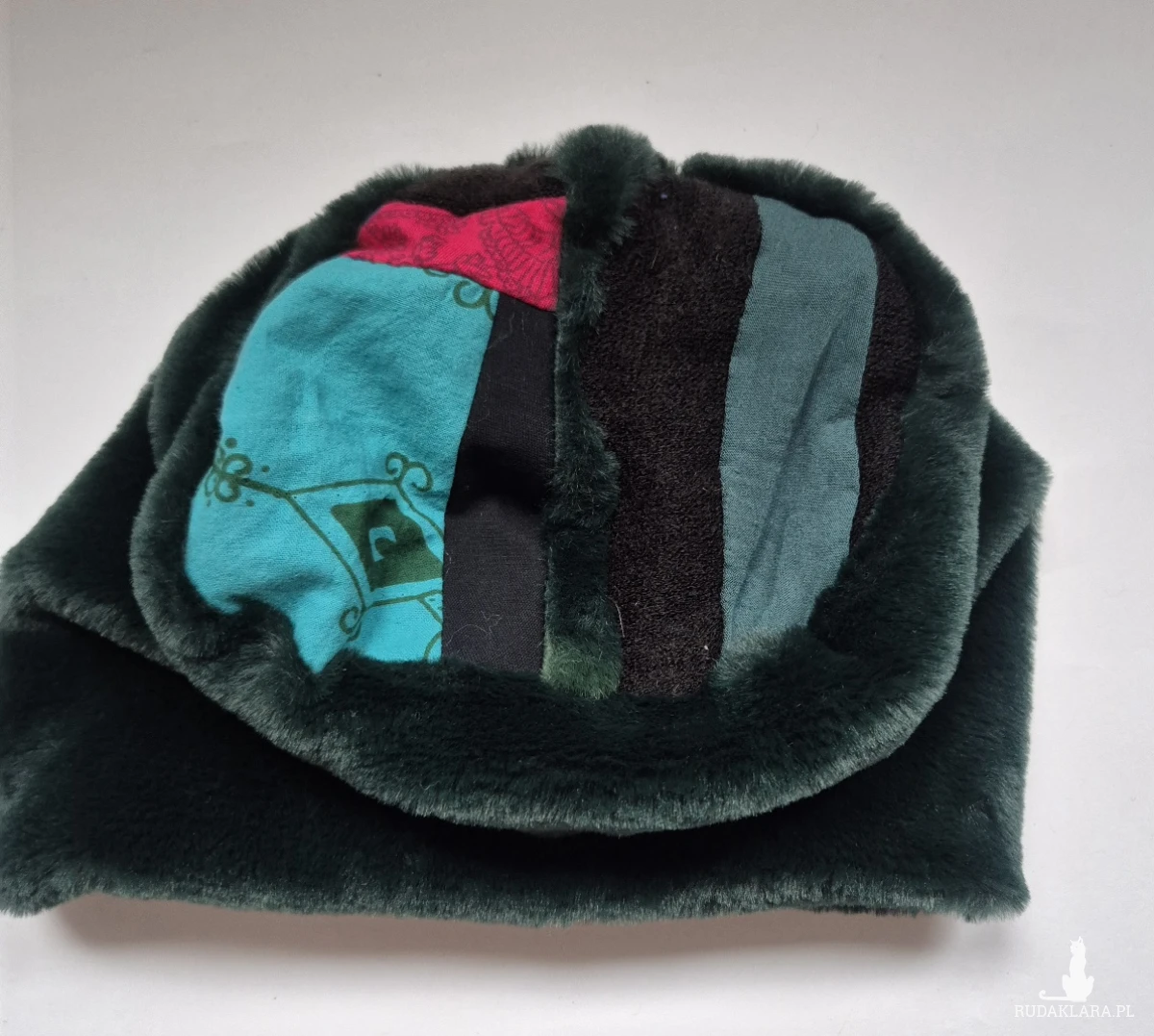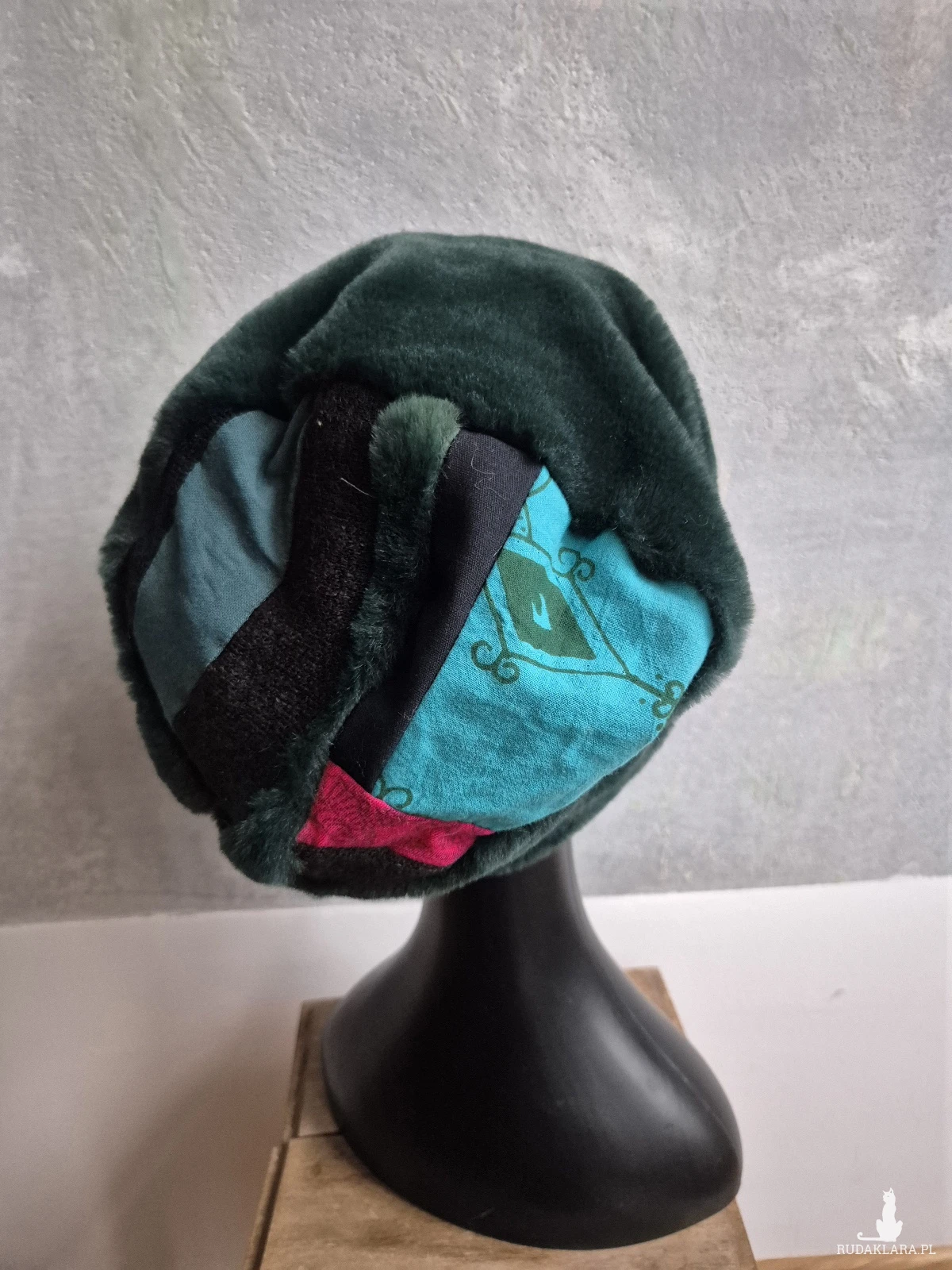Futrzana czapka ciemna zieleń góra patchworkowa na podszewce rozmiar uniwersalny ciepła, box a1