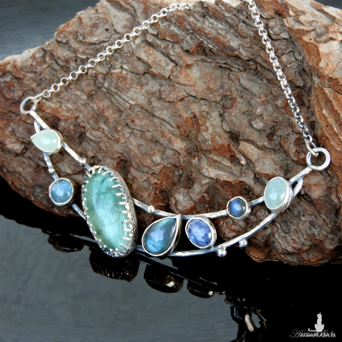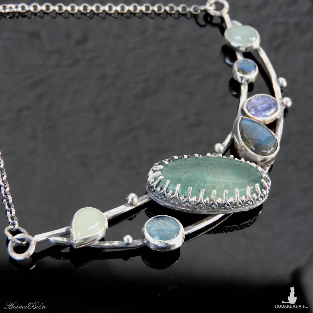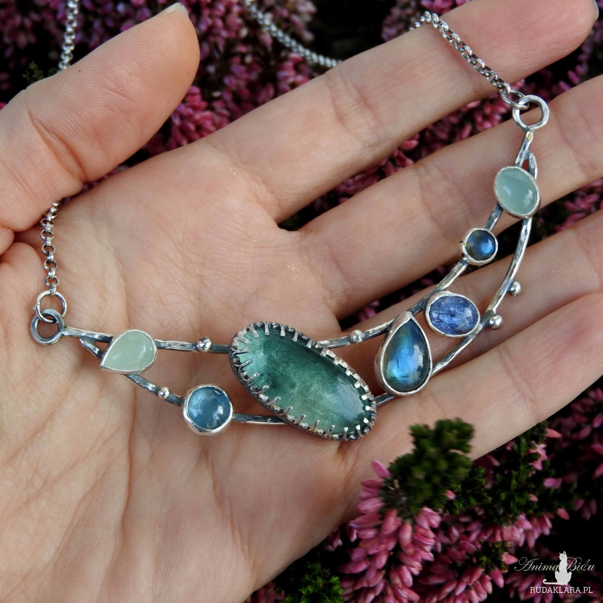 akwamarynu, okrągły kyanit, duży owal fluorytu w srebrnej koronce, potem łezka