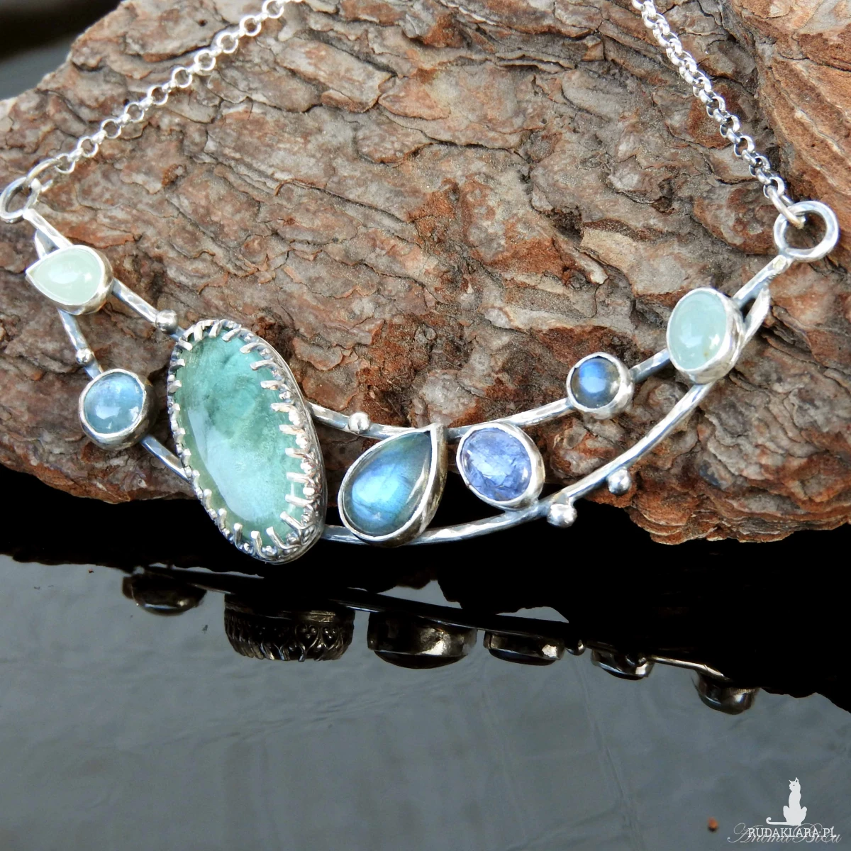 Naszyjnik srebrny z błękitnymi minerałami. Wykonany od