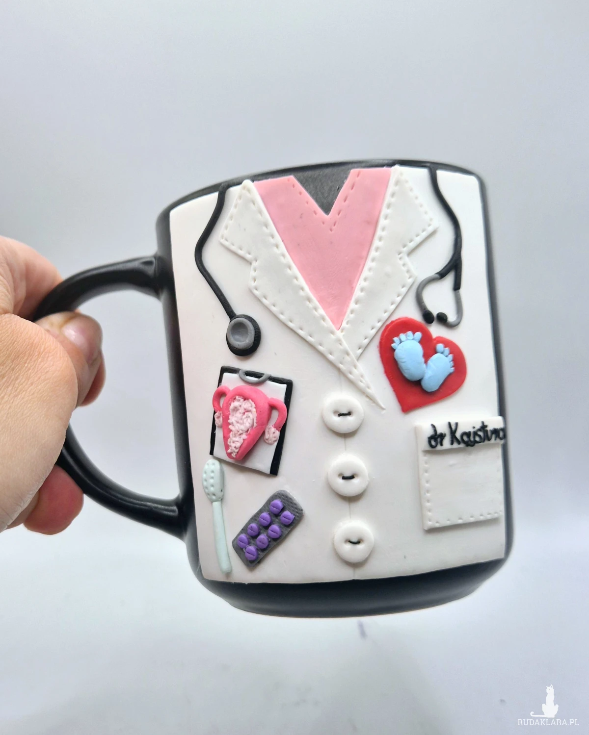 Kubek o pojemności 350 ml ozdobiony ręcznie lepionym wzorem lekarskiego kitla. Kubek w pełni personalizowany. Ma być dla dentysty, ginekologa, kardiologa? Napisz to w wiadomości prywatnej, a wzór bedzie odpowiednio dobrany. Możesz tez wybrać kolor kitla lub koszuli.