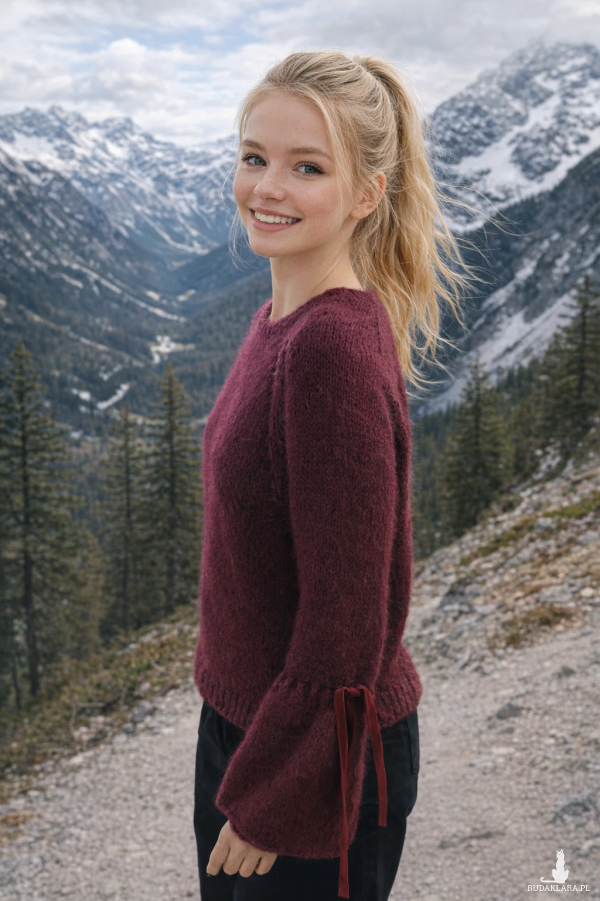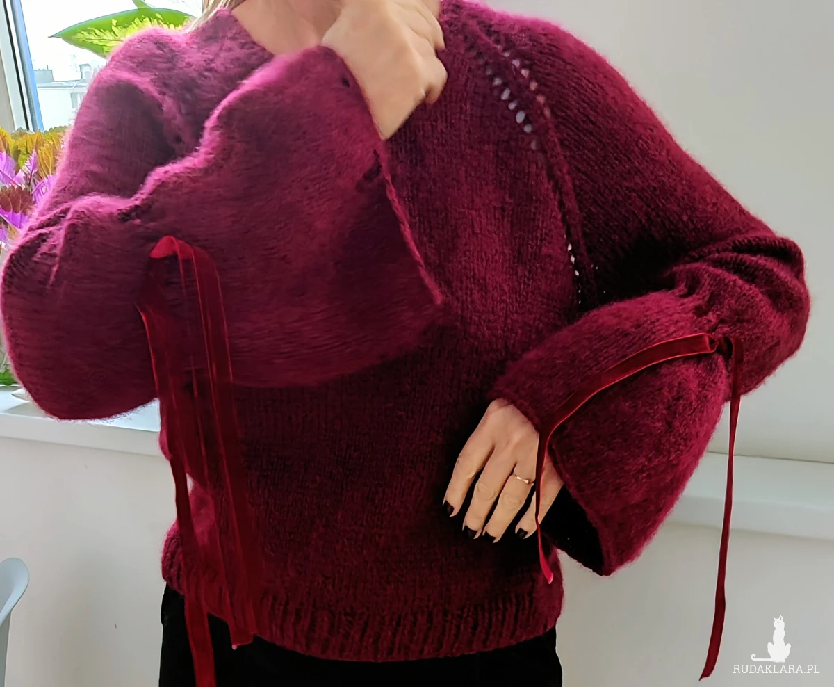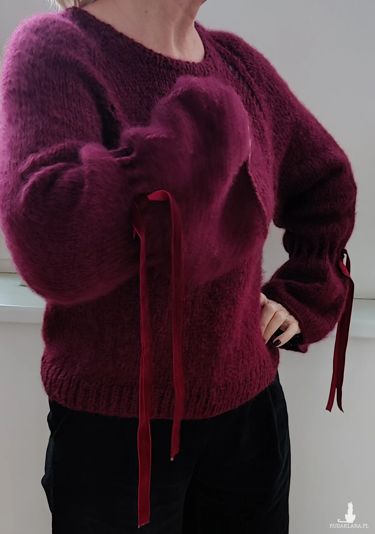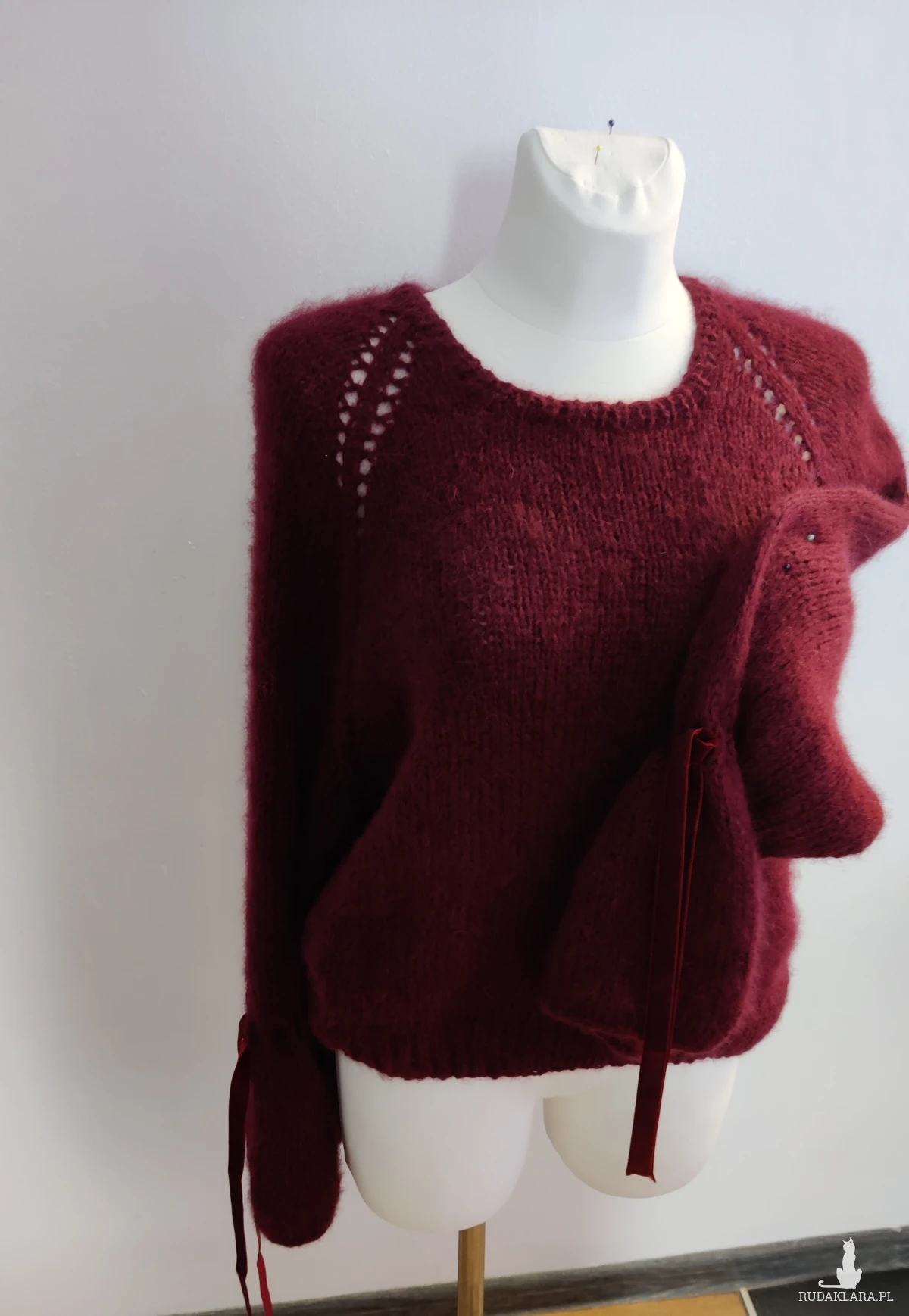 Kolor sezonu burgund przepiękny soczysty miły w dotyku lekki z oryginalnymi rękawami ściąganymi na wysokości łokcia aksamitkami tworzy niepowtarzalny charakter swetra.