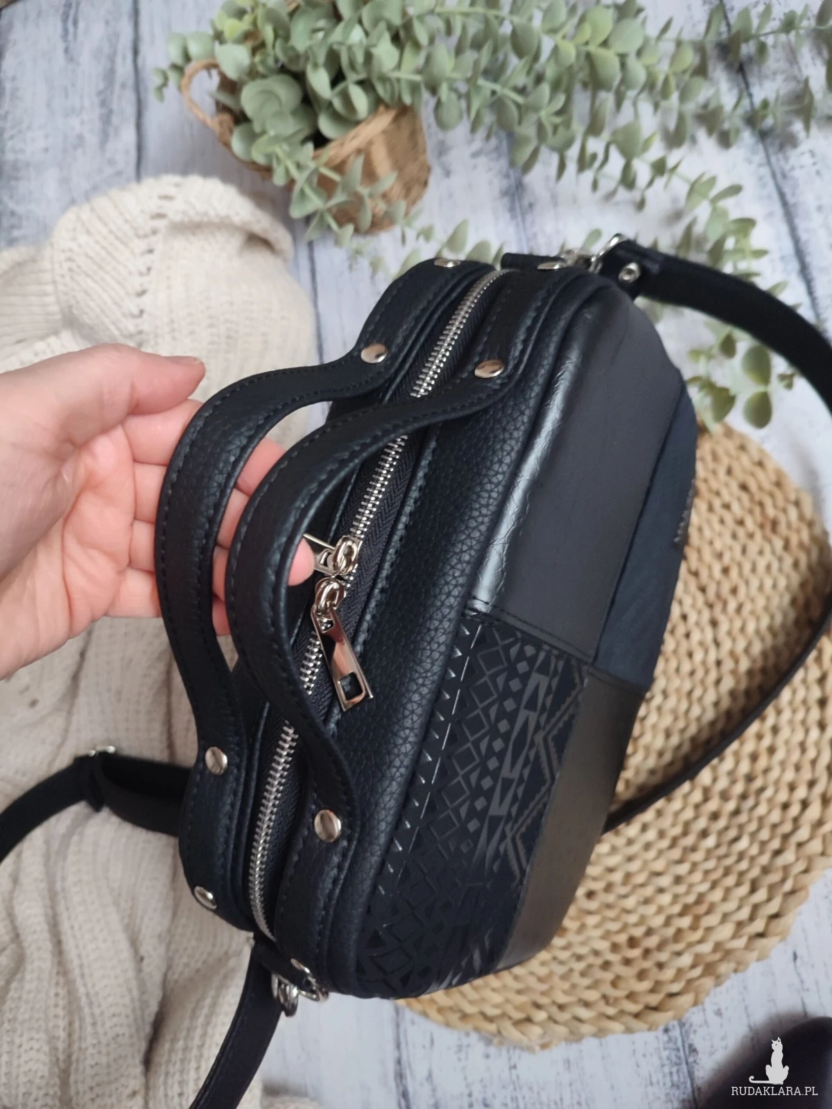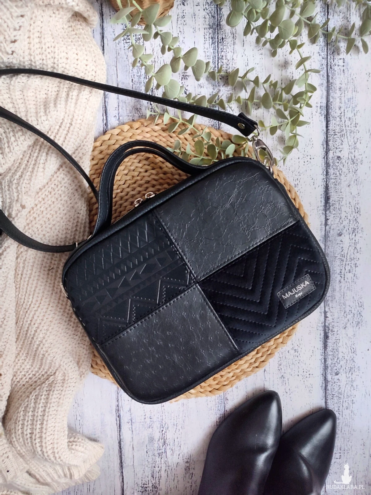 Uszyta jest z połączenia tkanin tkanin o różnych fakturach – ekoskóra, welur.