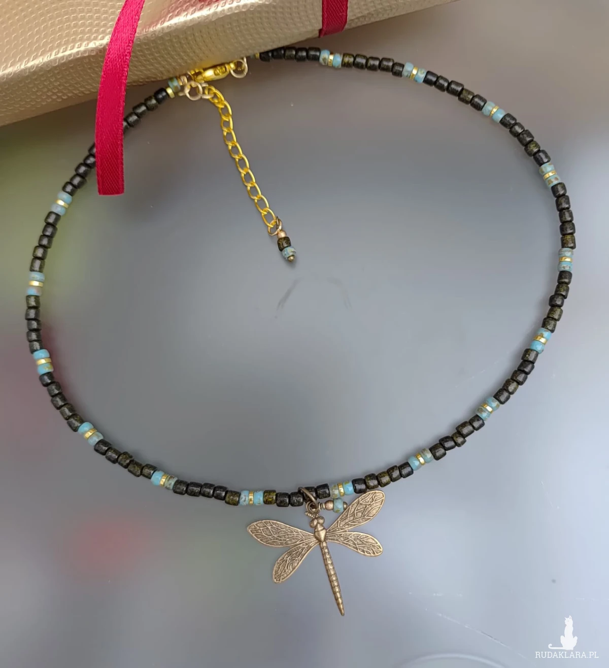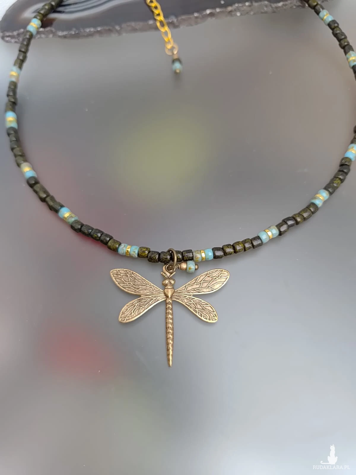 przekładkami z hematytu w kolorze złotym. Wisiorek ważka 3 cm, mosiężna