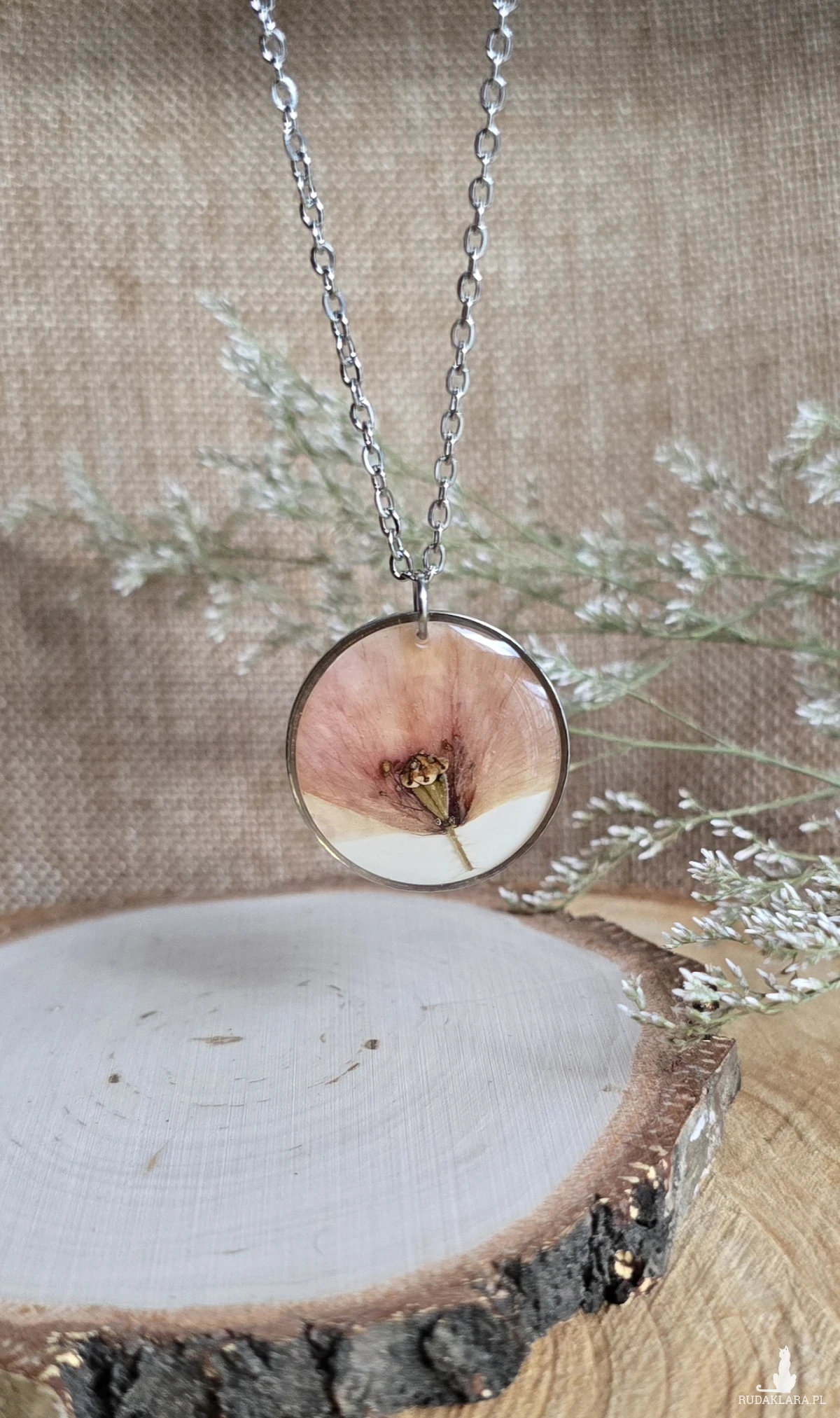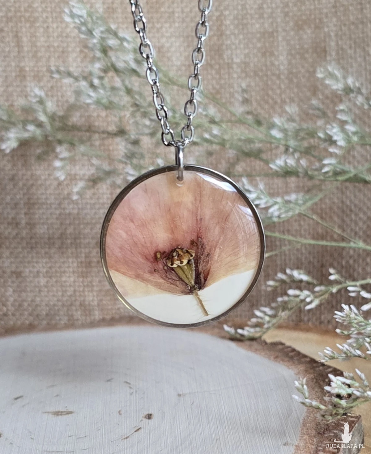 Oferuję Państwu unikalną biżuterię. Zawieszka jest wykonana z suszonych kwiatów i żywicy epoksydowej. Biżuteria jest wspaniałym i oryginalnym prezentem na lata.