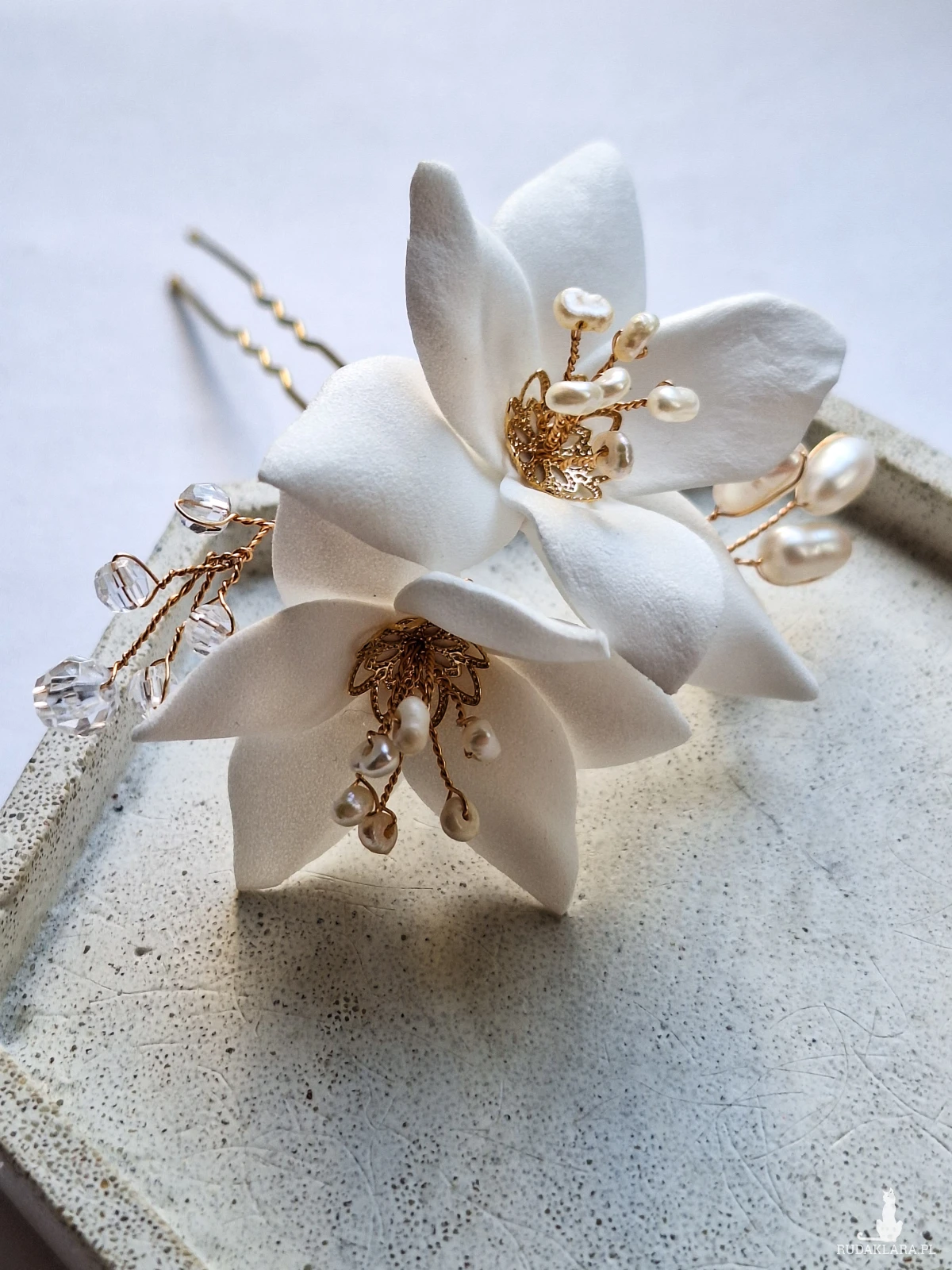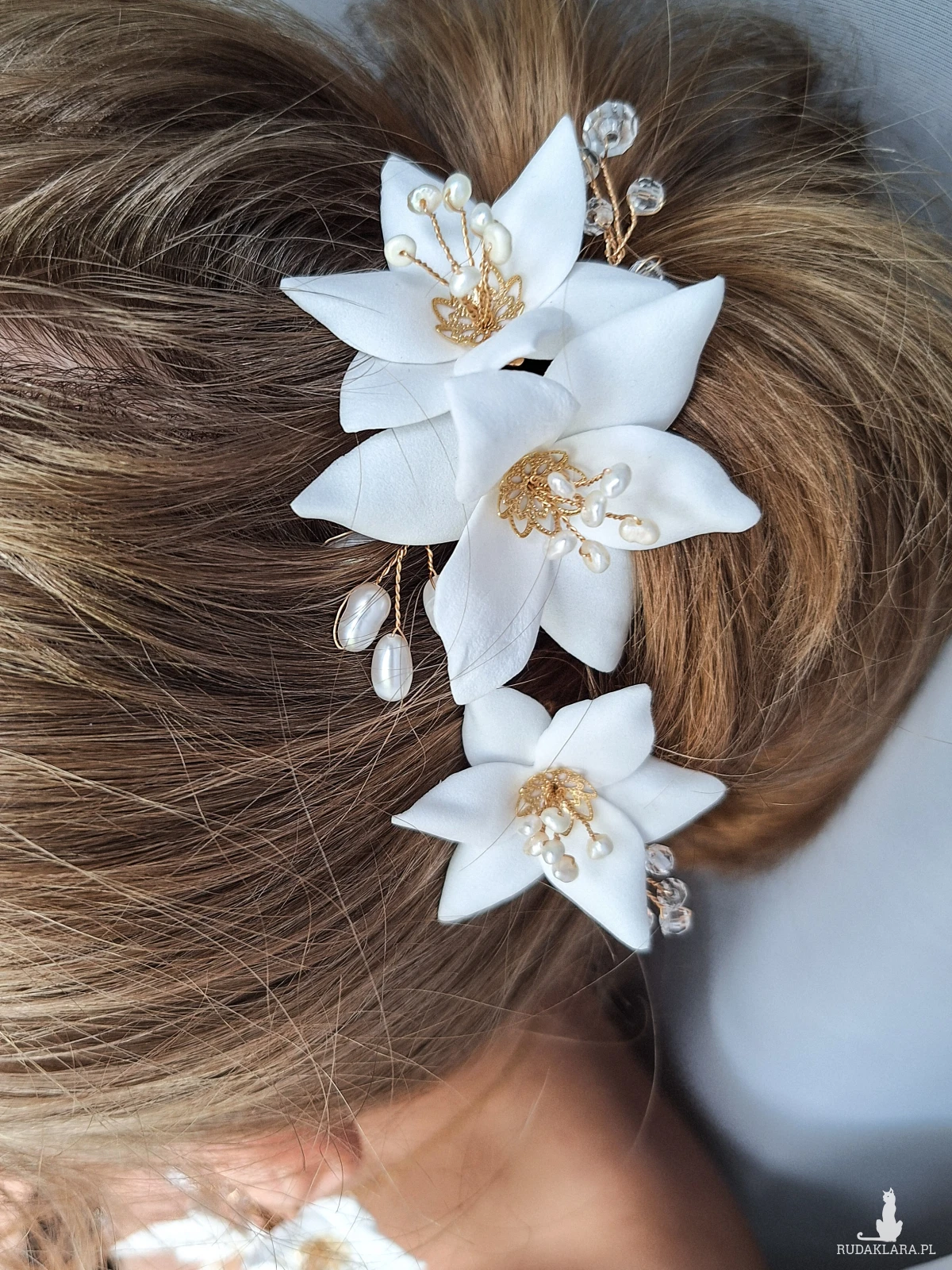 Zestaw ręcznie wykonanych kokówek ślubnych. Delikatna i stylowa ozdoba do włosów, która podkreśli piękno każdej fryzury. Kwiaty z foamiranu zostały uzupełnione o naturalne perły i kryształki, tworząc kompozycję pełną elegancji i subtelnego blasku.