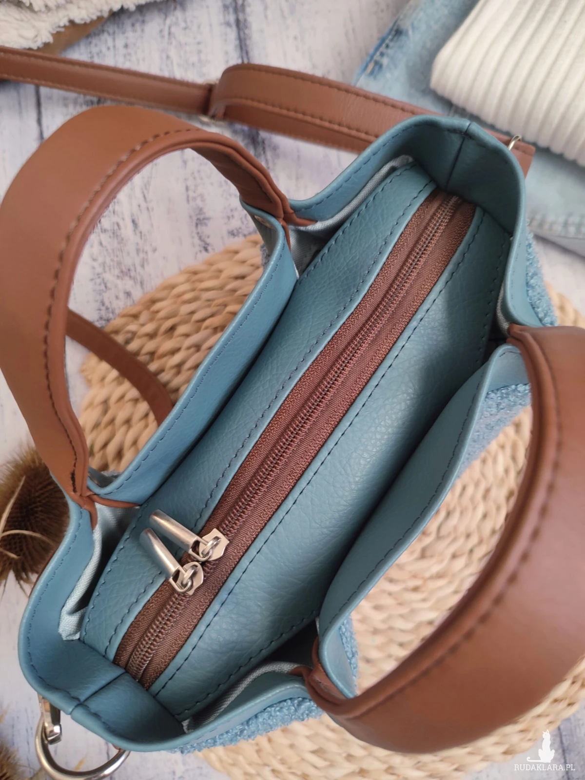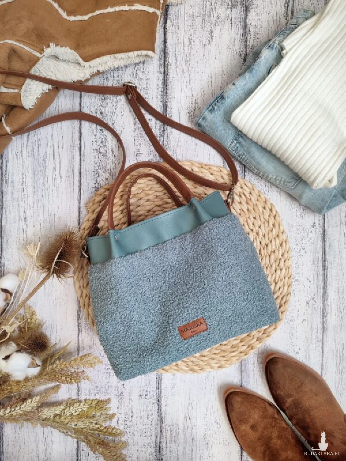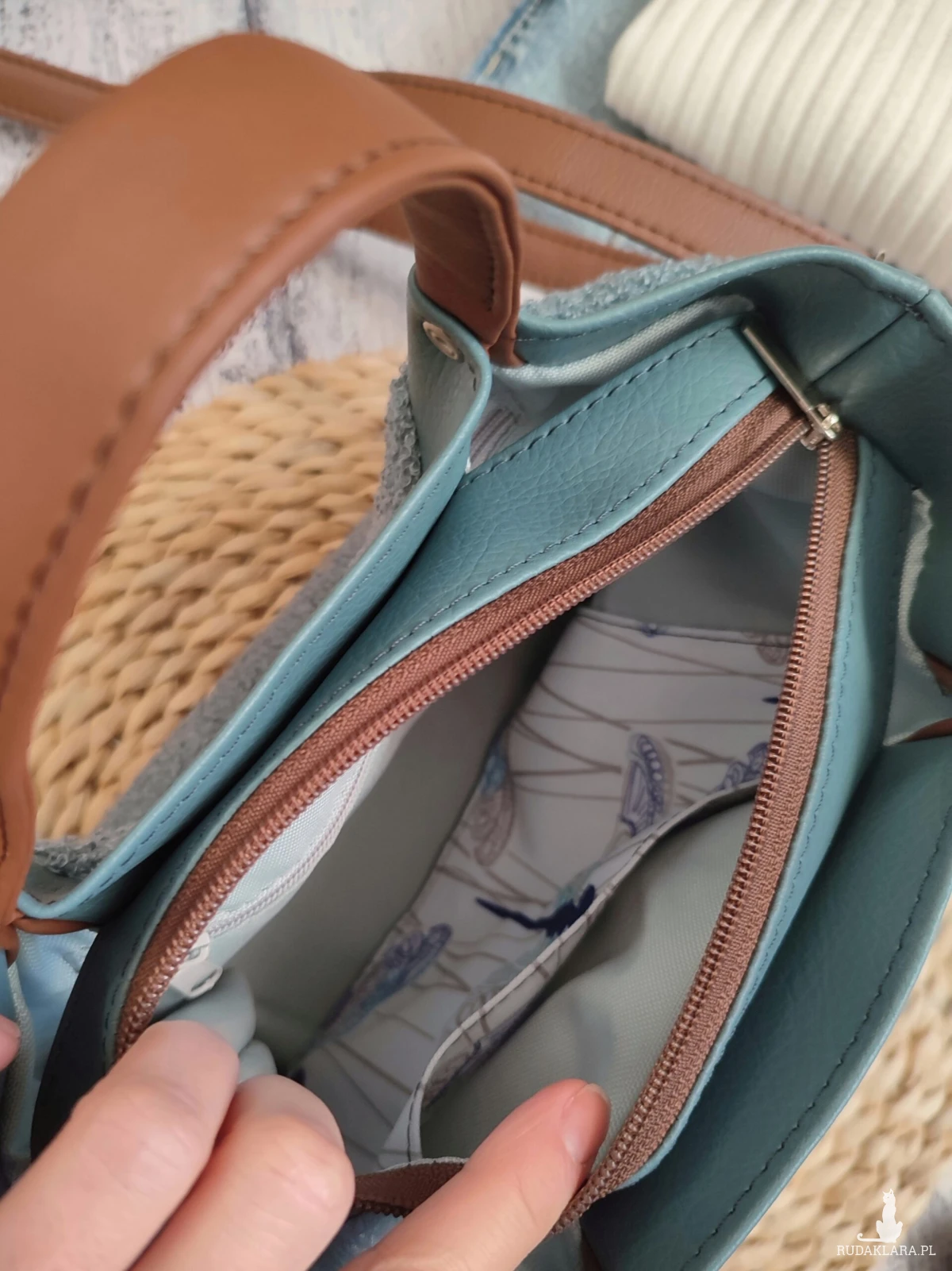 Idealny rozmiar na co dzień. Mała i zgrabna, a przy tym niezwykle pojemna. Pomieści wszystko co niezbędne w codziennym użytkowaniu. Uszyta z tkaniny boucle w kolorze brudnego niebieskiego w połączeniu z brązową ekoskórą. Podszewka z tkaniny wodoodpornej. Kieszonka z motywem ważki.