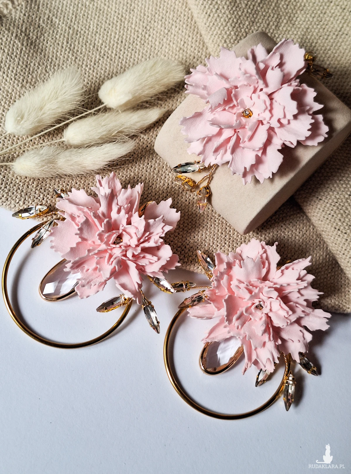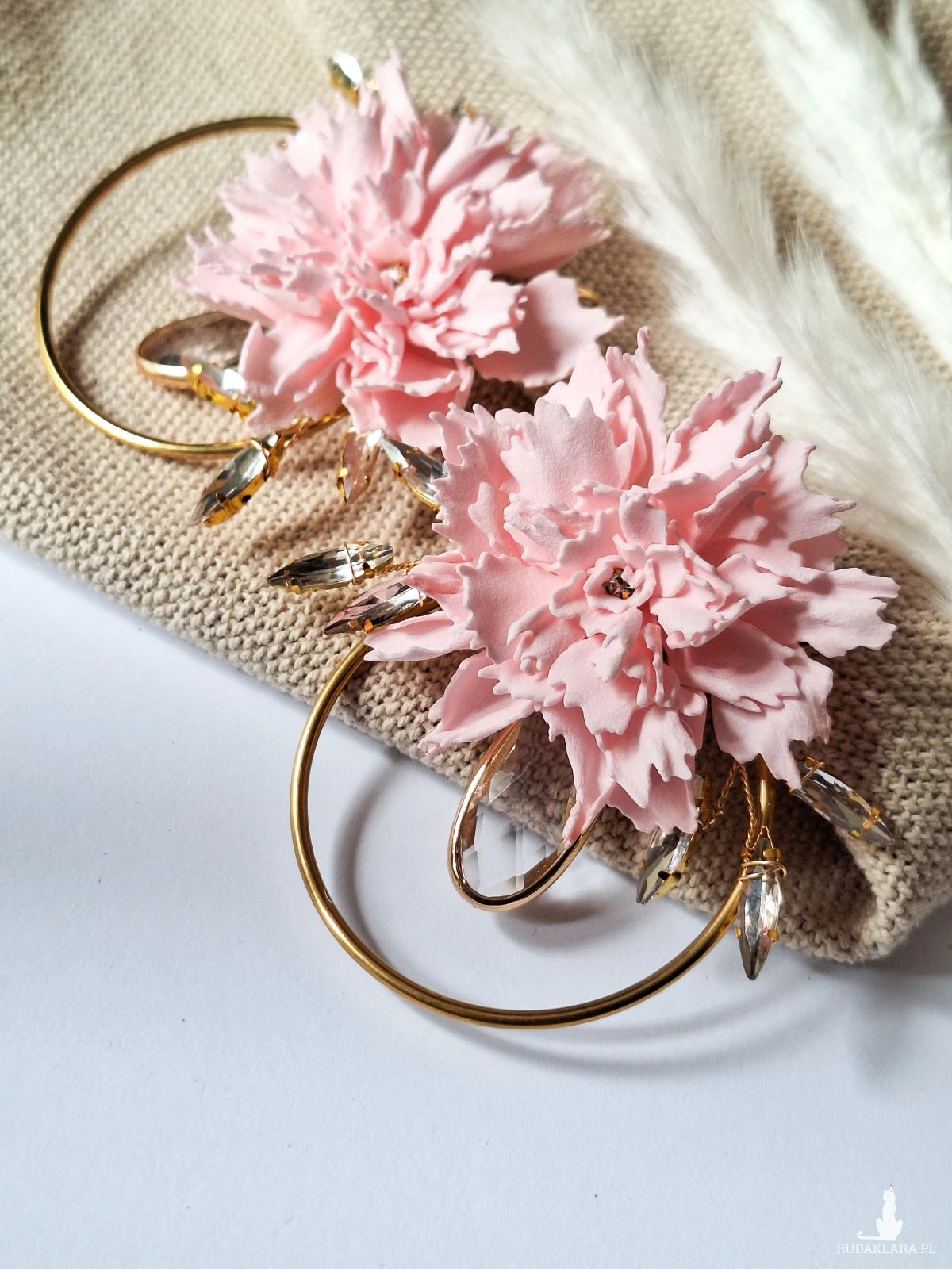 Wyjątkowe kolczyki w formie dużych, ręcznie wykonanych kwiatów goździków w pastelowym różu. Umieszczone na złotych kołach, ozdobione kryształkami o pięknym szlifie, tworzą spektakularny i romantyczny dodatek.