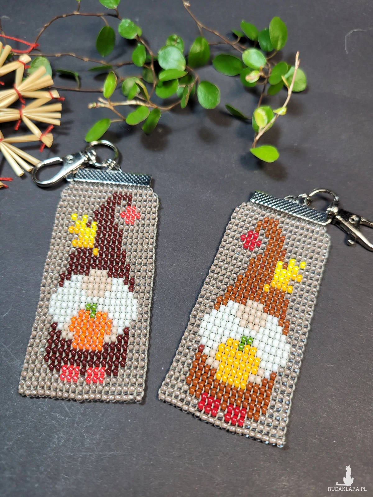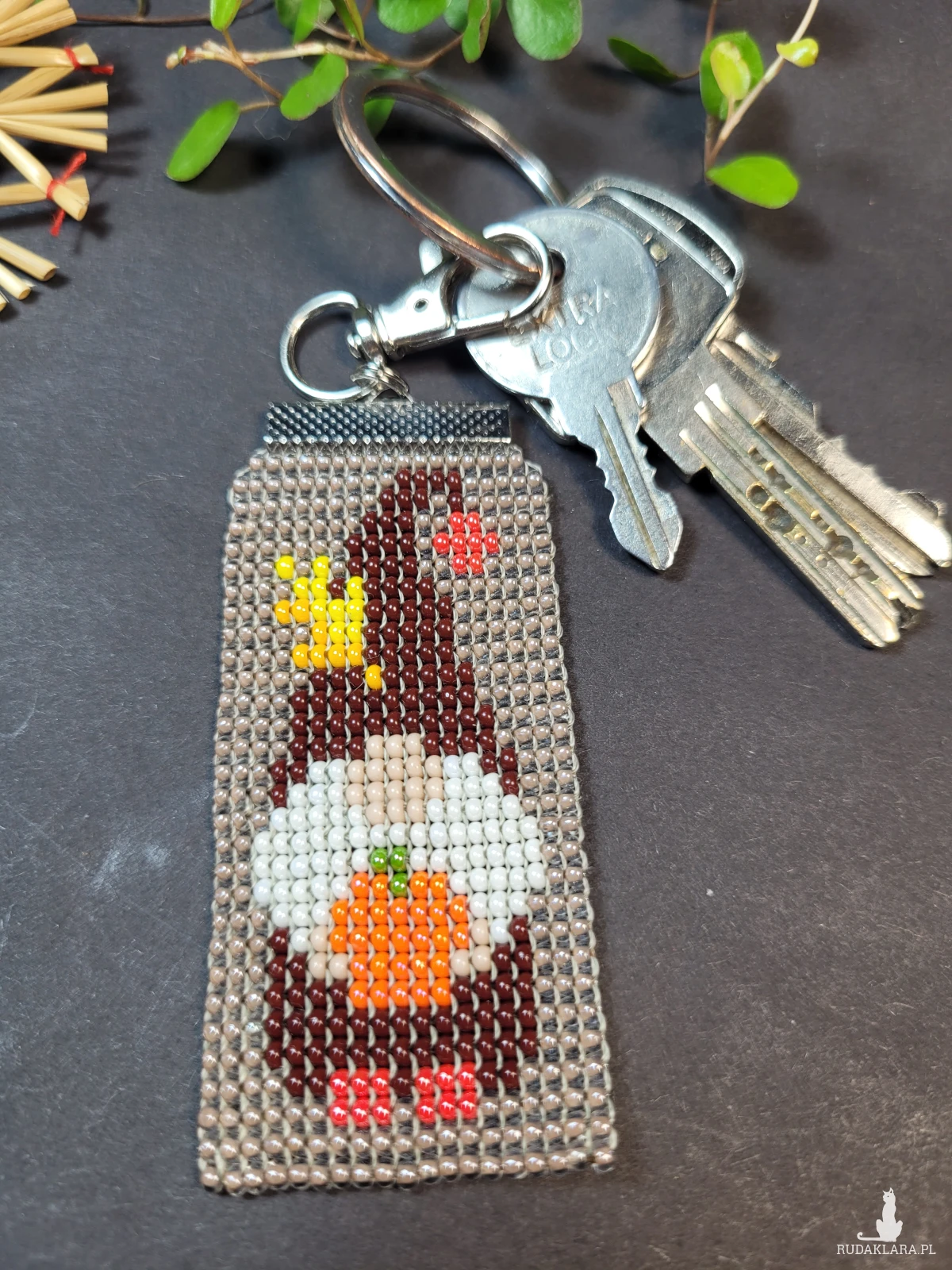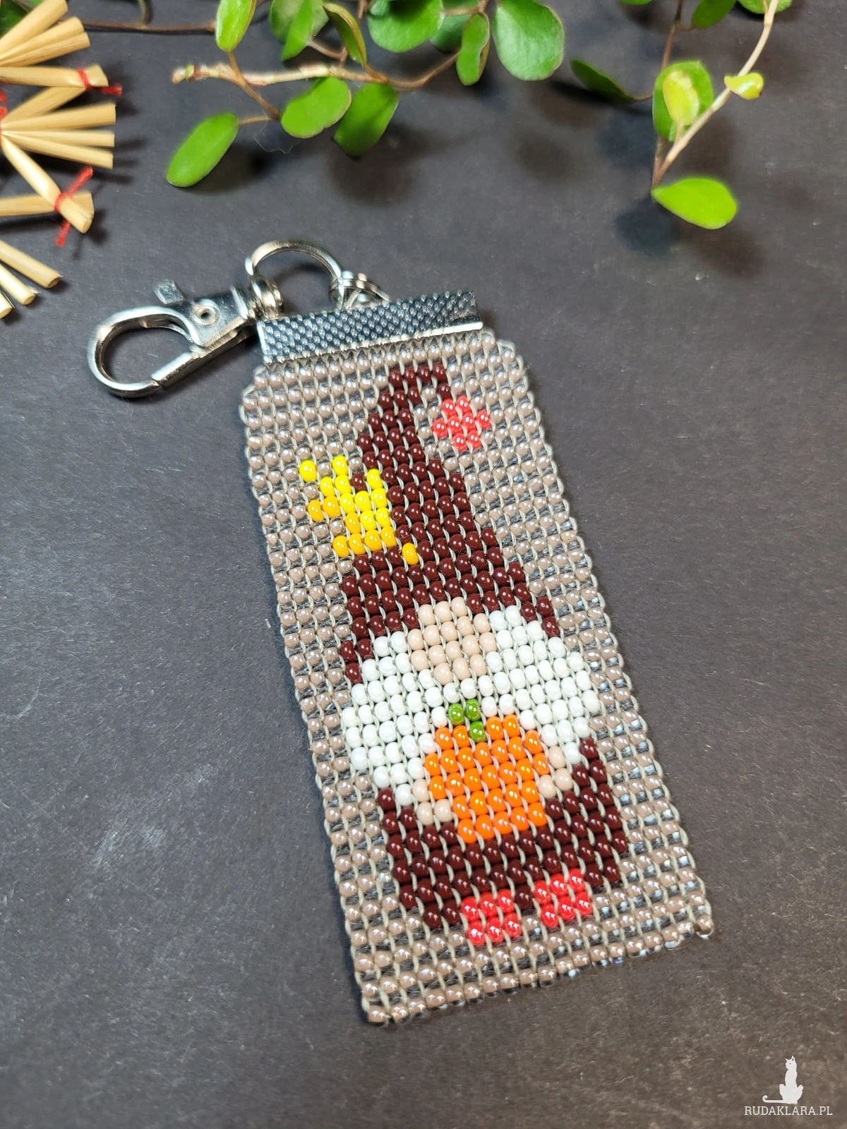 Ręcznie wykonany brelok przedstawiający krasnala w ciemno-brązowym stroju z dyną. Utkany ręcznie z wysokiej jakości czeskich koralików Preciosa.