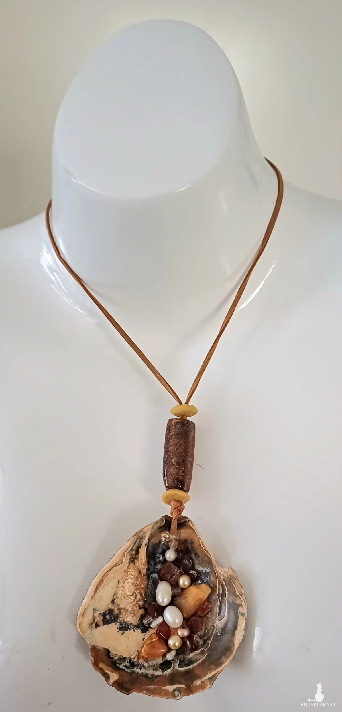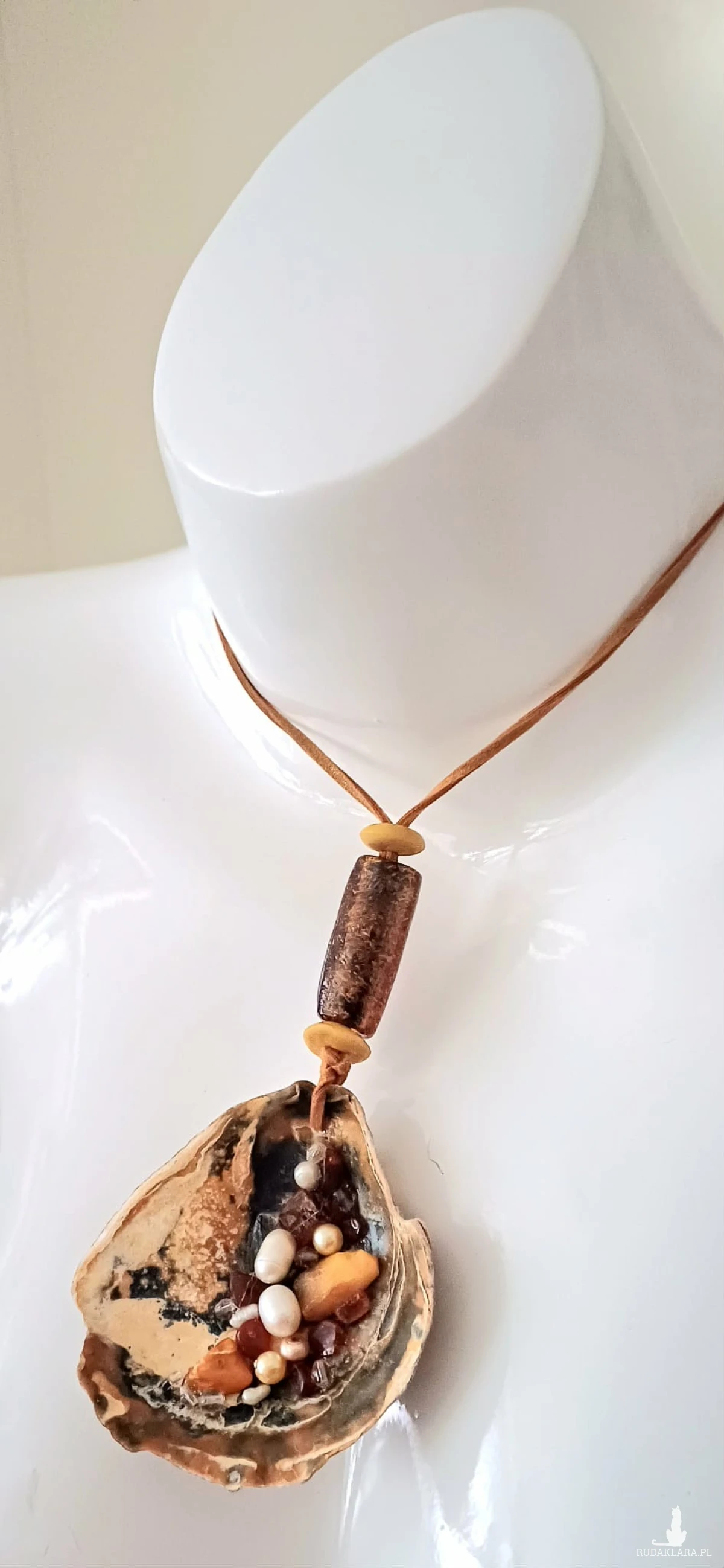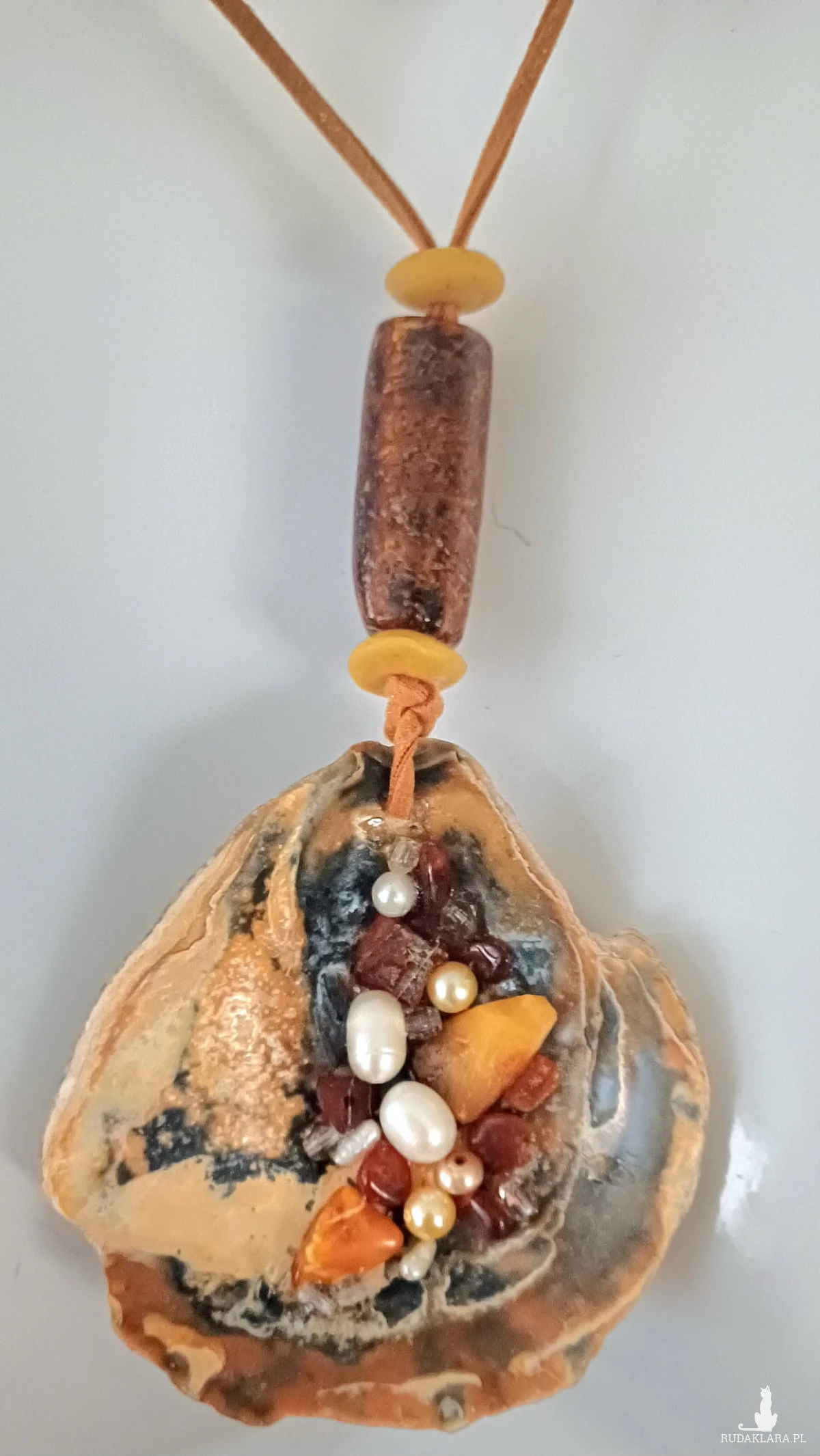 Piękny unikatowy wisior z muszli ostrygowej - dodałam perełki, bursztyn, kryształki i piękny duży szklany koralik. Każda muszla - symbol kobiecości - jest jedyna w swoim rodzaju !