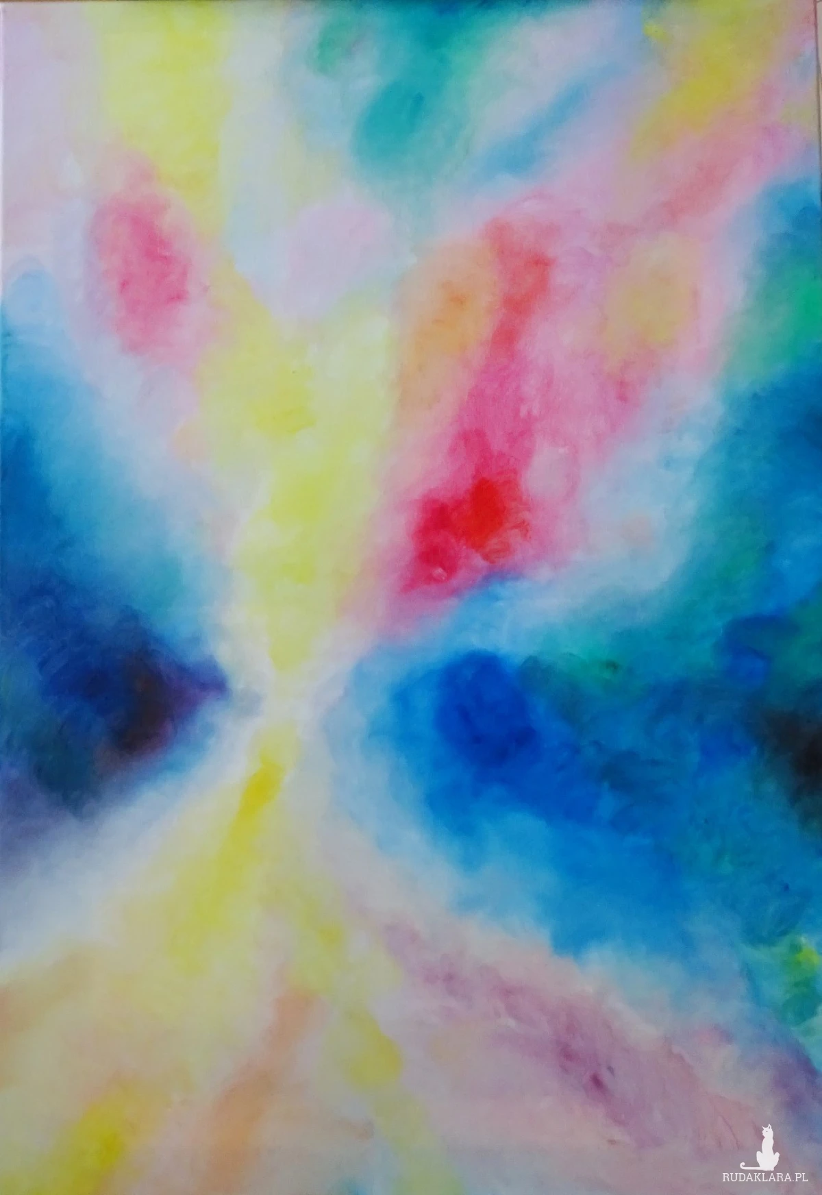 Ten obraz pulsuje jak oddech światła, jakby cała kompozycja była jednym wielkim rozbłyskiem energii rozlewającej się w różnych kierunkach. Miękkie, rozmyte przejścia barw sprawiają wrażenie, że obserwujemy narodziny czegoś ulotnego i niematerialnego — może emocji, może wspomnienia, może kosmicznego zjawiska, które dopiero nabiera kształtu.