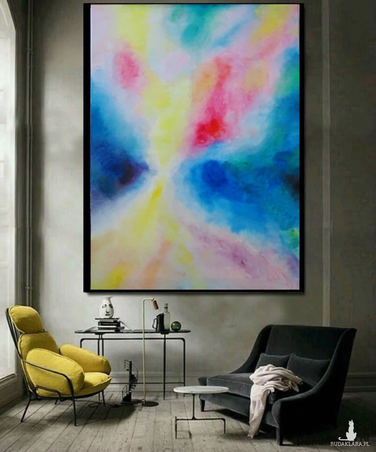 Obraz namalowany techniką olejną na blejtramie o wymiarach: 100/70 cm, boki obrazu zamalowane, sygnowany z przodu. Jest to moja autorska kompozycja. Świetnie może być eksponowany w nowoczesnych wnętrzach o stonowanej kolorystyce. Swoimi barwami może rozjaśnić takie wnętrza, w oświetleniu dziennym, jak i sztucznym. Polecany dla miłośników ekspresji i nie tylko.