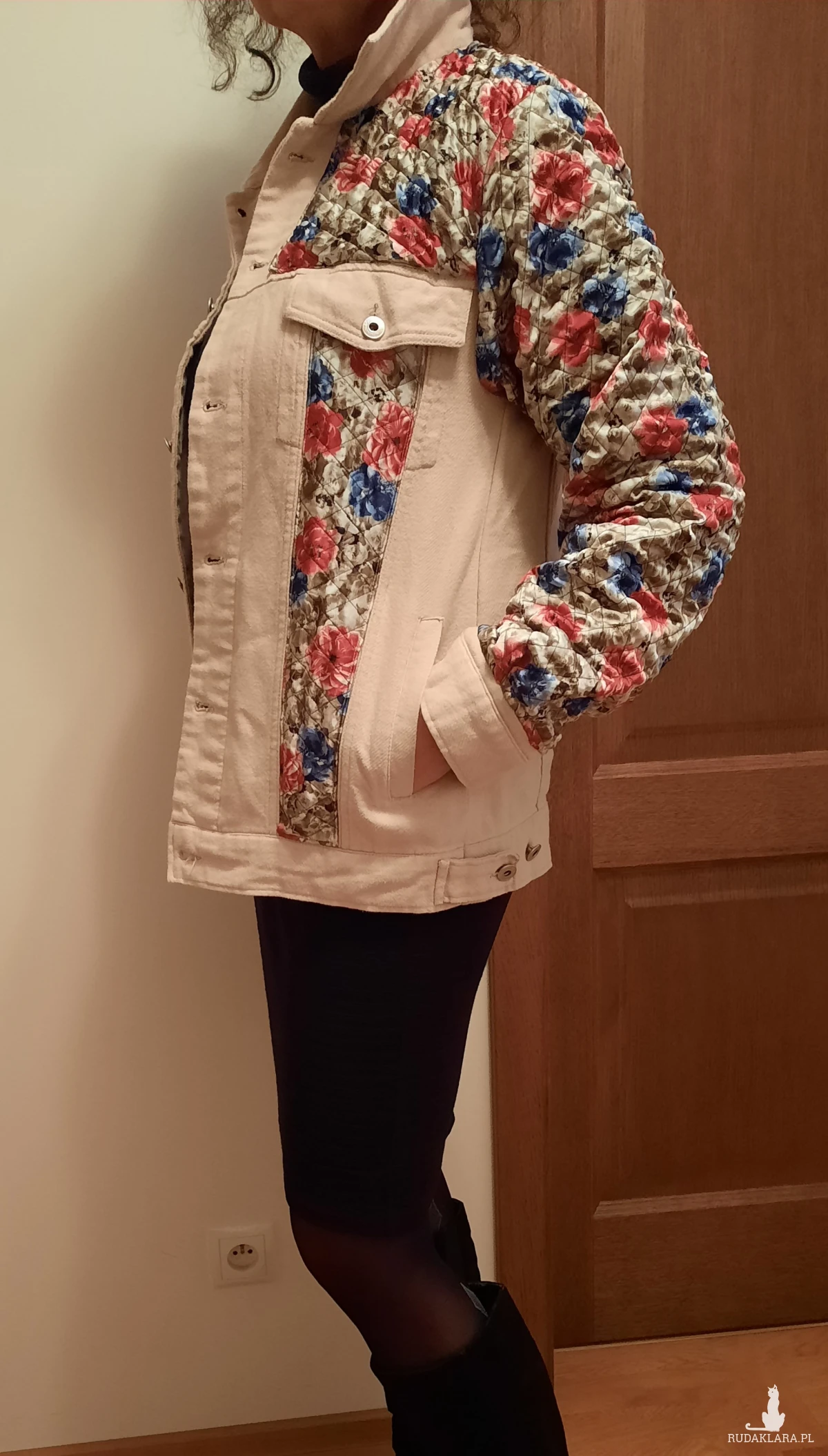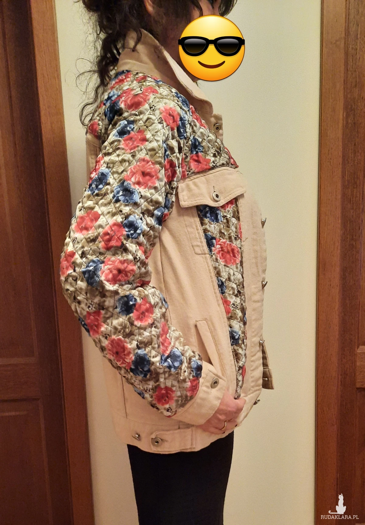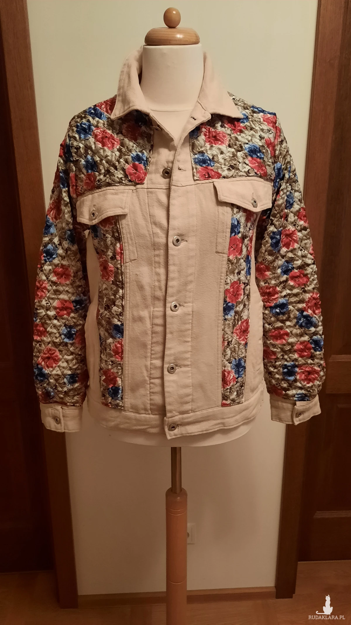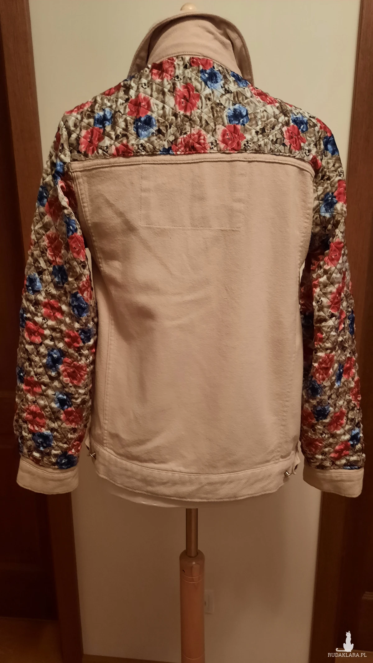 Sprzedam optymistyczną beżową kurtkę z rękawami i dodatkami z resztek pikowanej tkaniny! Mój projekt z serii nic nie może być nudne!!! Rękawy ,plecy i przód super ozdobione. Wszystko 100 % mój projekt,nie będzie drugiej takiej. Pięknie wygląda , do pracy ,na spacer! ! Długość 70 szer,dół 104 cm, międzypachami 2x50. POLECAM jedyna taka dla Ciebie 🙂 DAJĘ RZECZOM DRUGIE ŻYCIE