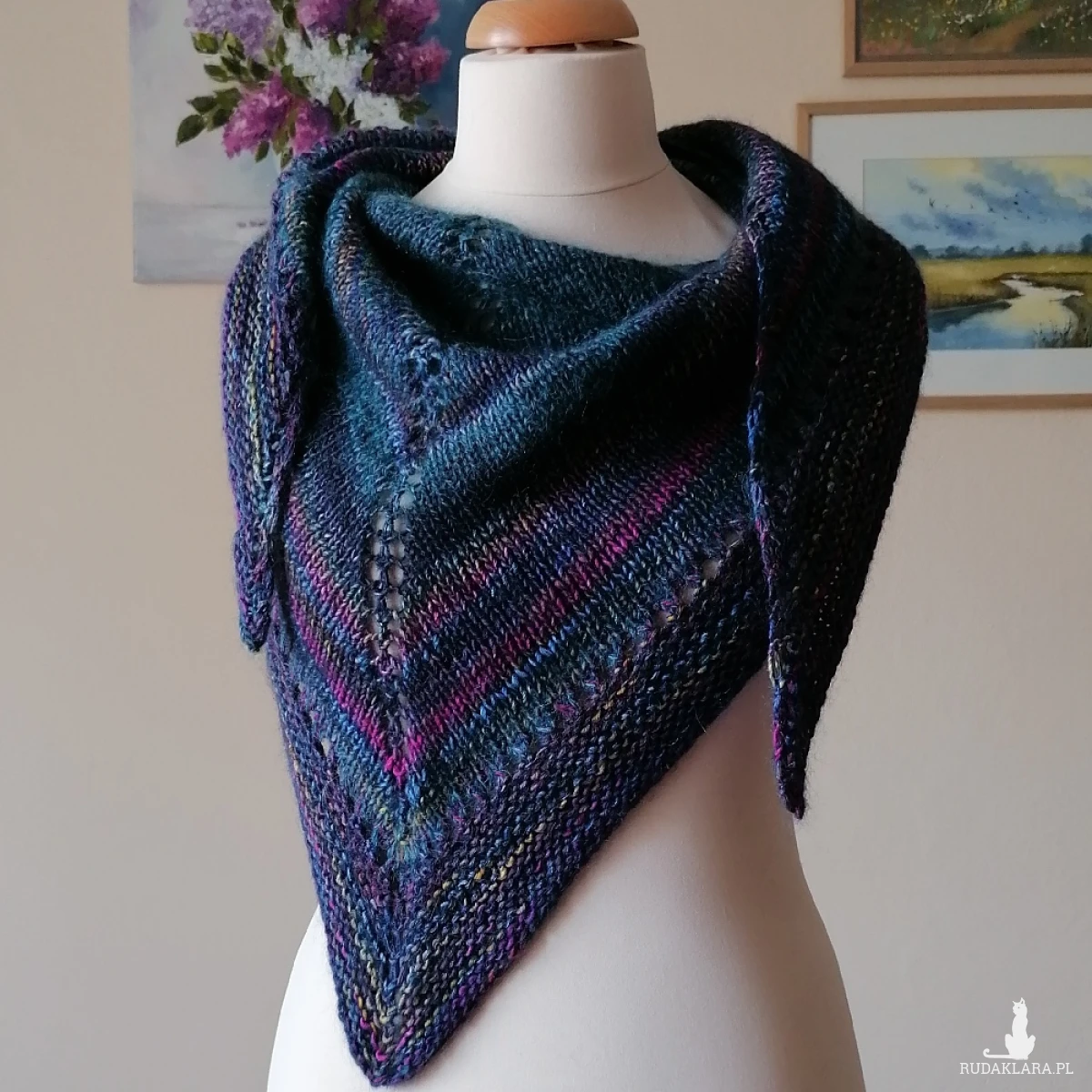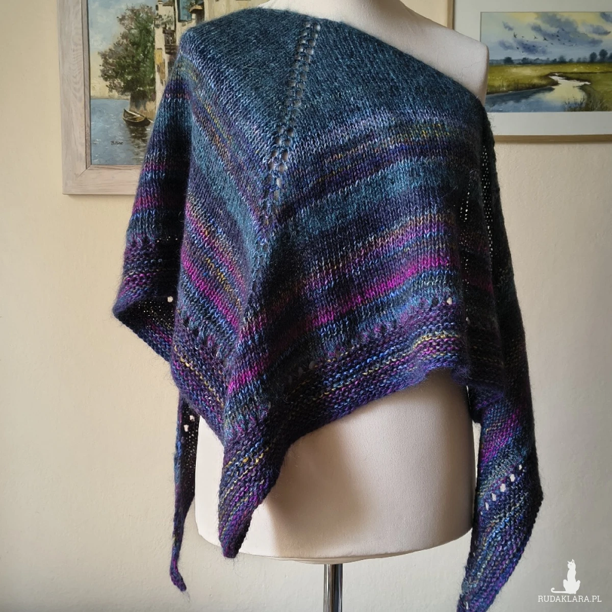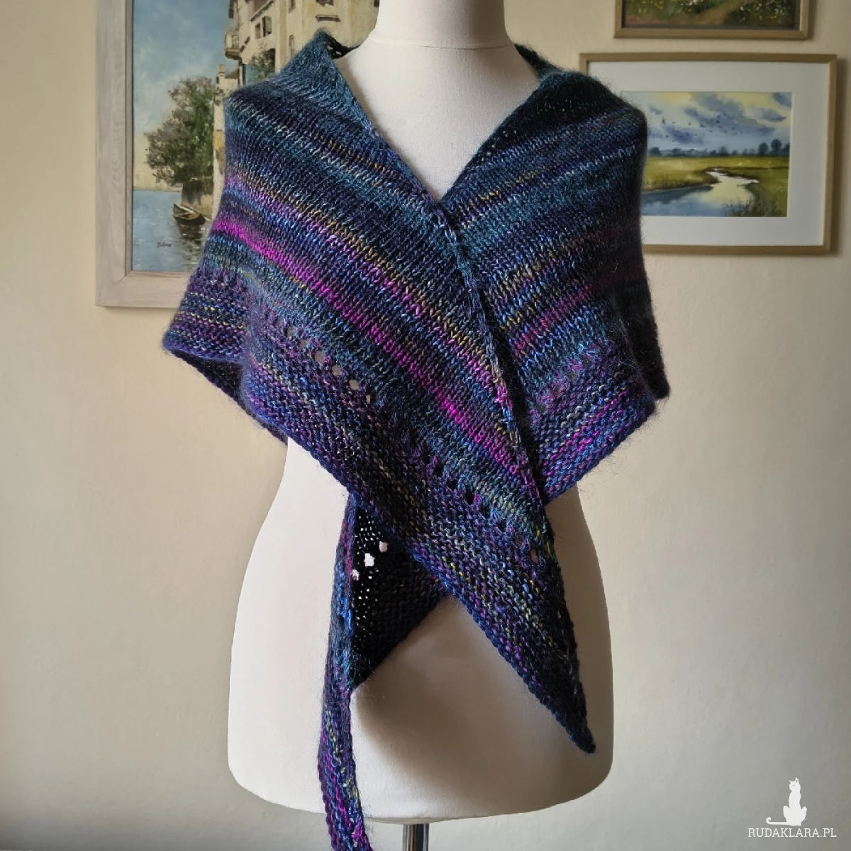 Duża, miła, delikatnie puchata, mięsista, lejąca chusta, wykonana ręcznie na drutach podwójną nitką z doskonałych włóczek (w tym wyjątkowej, kultowej włóczki japońskiej firmy Noro), kanadyjskiego, szlachetnego jedwabiu z moherem i wełenki 100% merino. Łączny skład włóczek to: jedwab, moher, wełenka merino, alpaka i minimalna ilość poliamidu. Niestety zdjęcia nie oddają piękna kolorów ich gradientów i uroku włóczek. Chusta jest twarzowa i pasuje do wielu stylizacji. Jest przy tym ciepła: doskonała do zimowego otulenia, jak i okrycia sylwetki w cieplejszych miesiącach. Wymiary: 195 cm. najdłuższy bok, 70 cm. wys. trójkąta. Pranie wyłącznie ręczne.