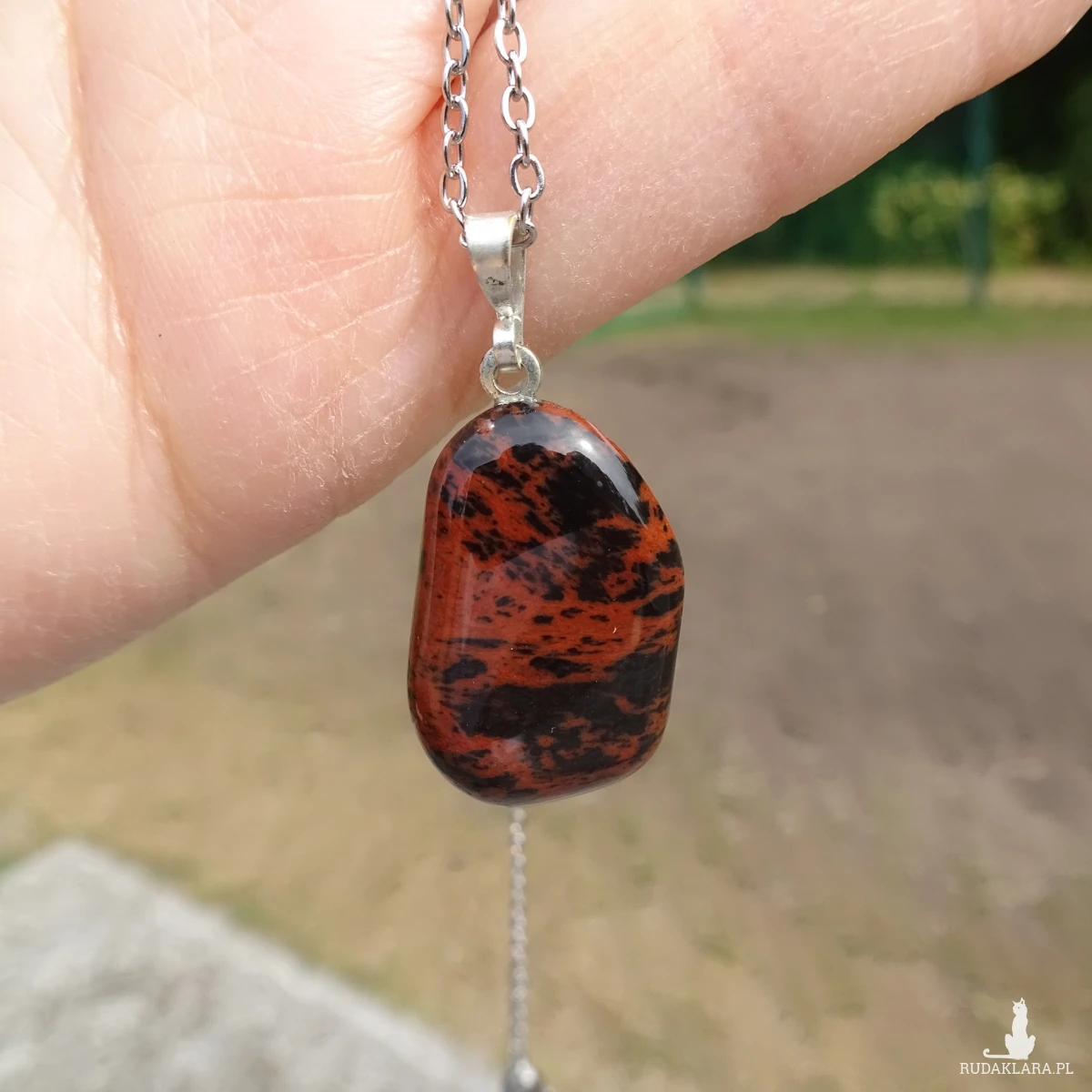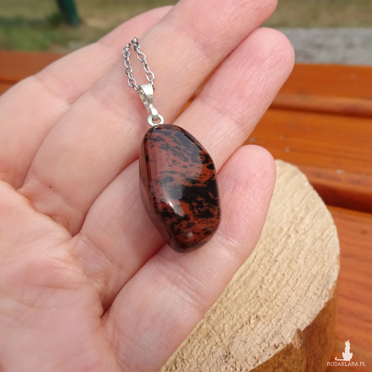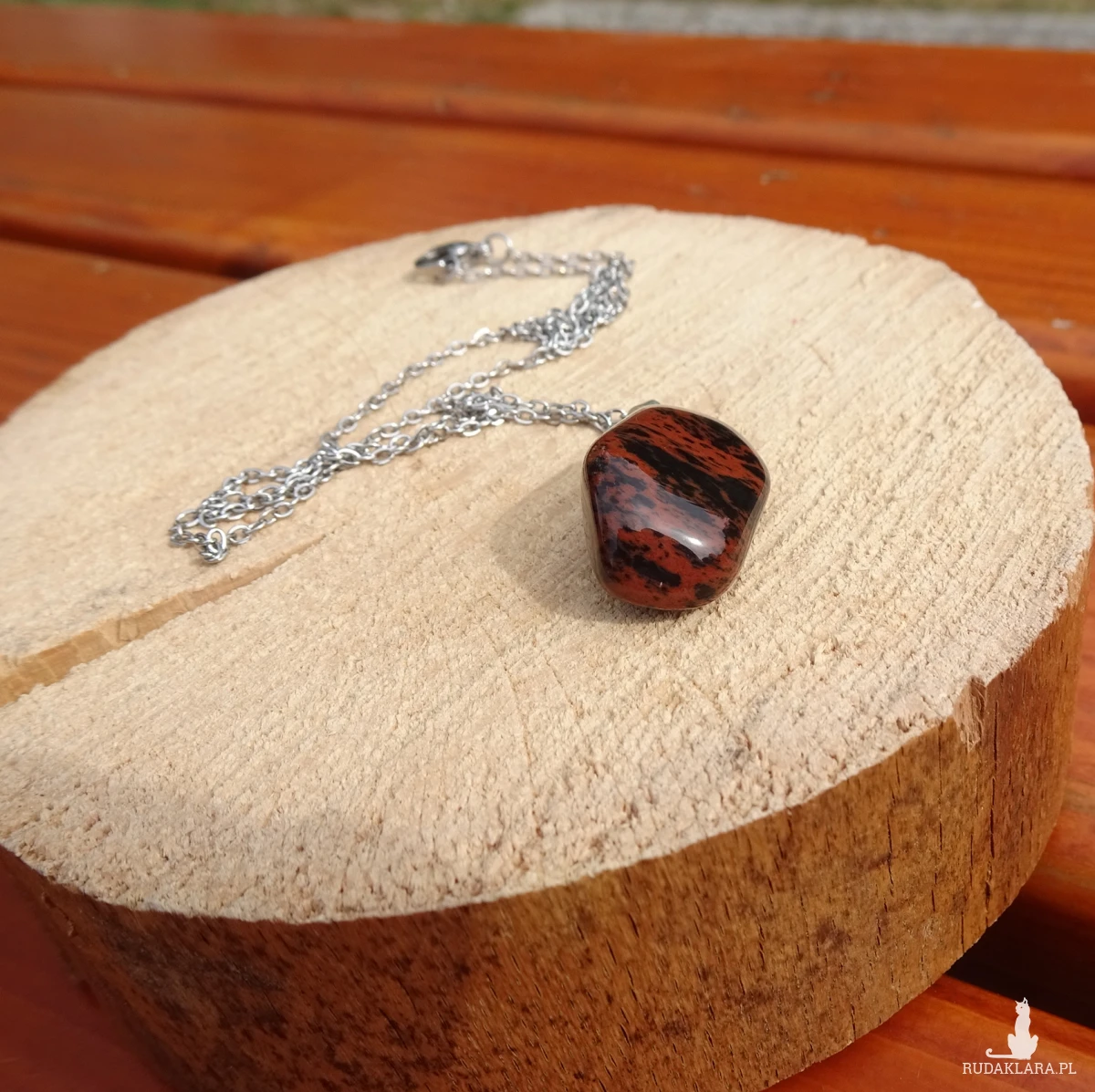 Wisiorek z łańcuszka ze stali chirurgicznej i zawieszki z obsydianu mahoniowego w o wielkości 1,4x2,2cm. Długość łańcuszka z zapięciem 45cm. Na zdjęciach sprzedawany egzemplarz.