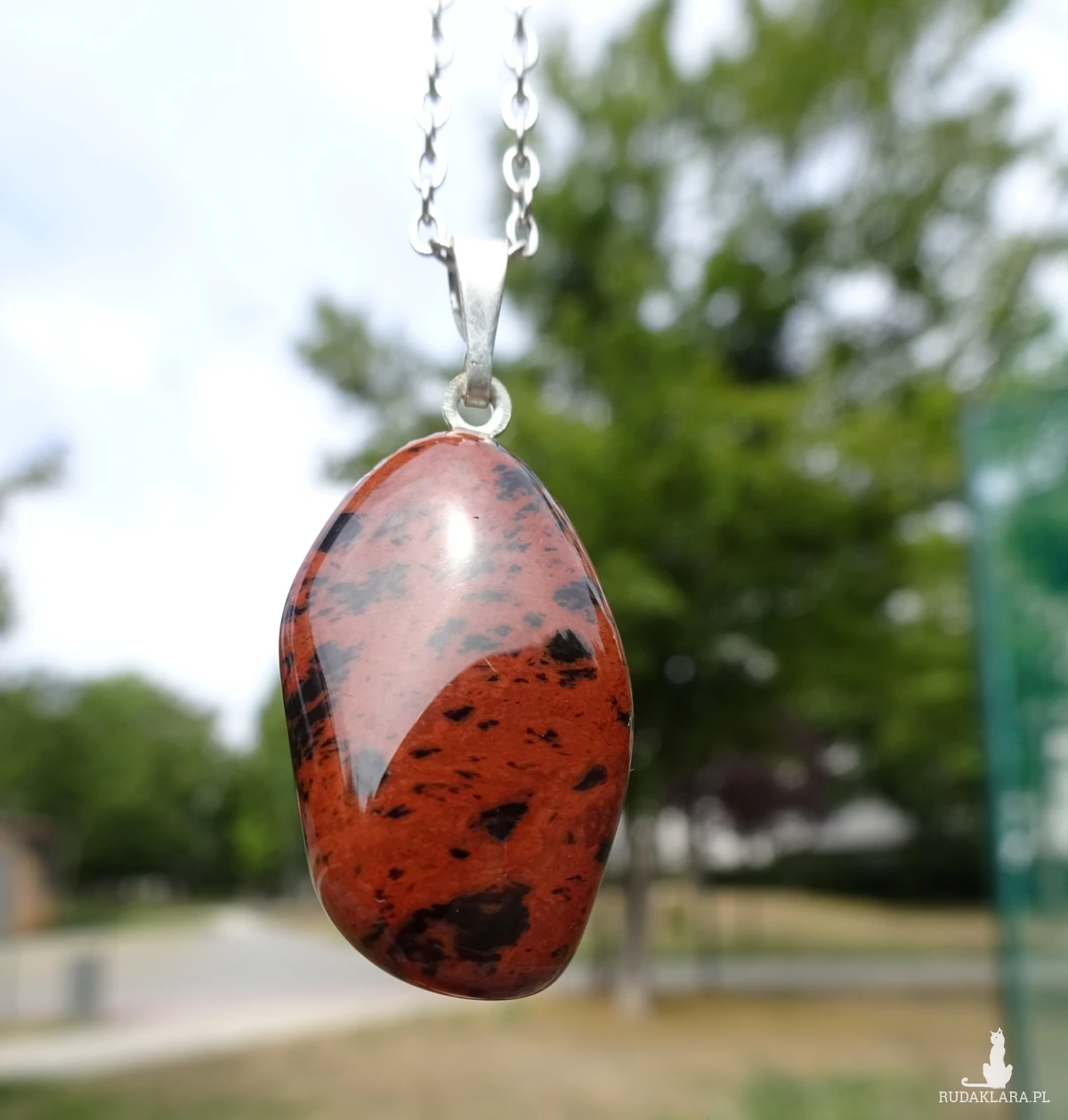 Mahoniowy obsydian łagodzi napięcie fizyczne. Zwiększa witalność. Pobudza krążenie, ociepla dłonie i stopy. Pomaga leczyć rany i krwawienia. Wzmacnia kręgosłup, kości, paznokcie, włosy i skórę. Wspiera wzrost u dzieci. Przydatny w zwalczaniu alergii na roztocza.