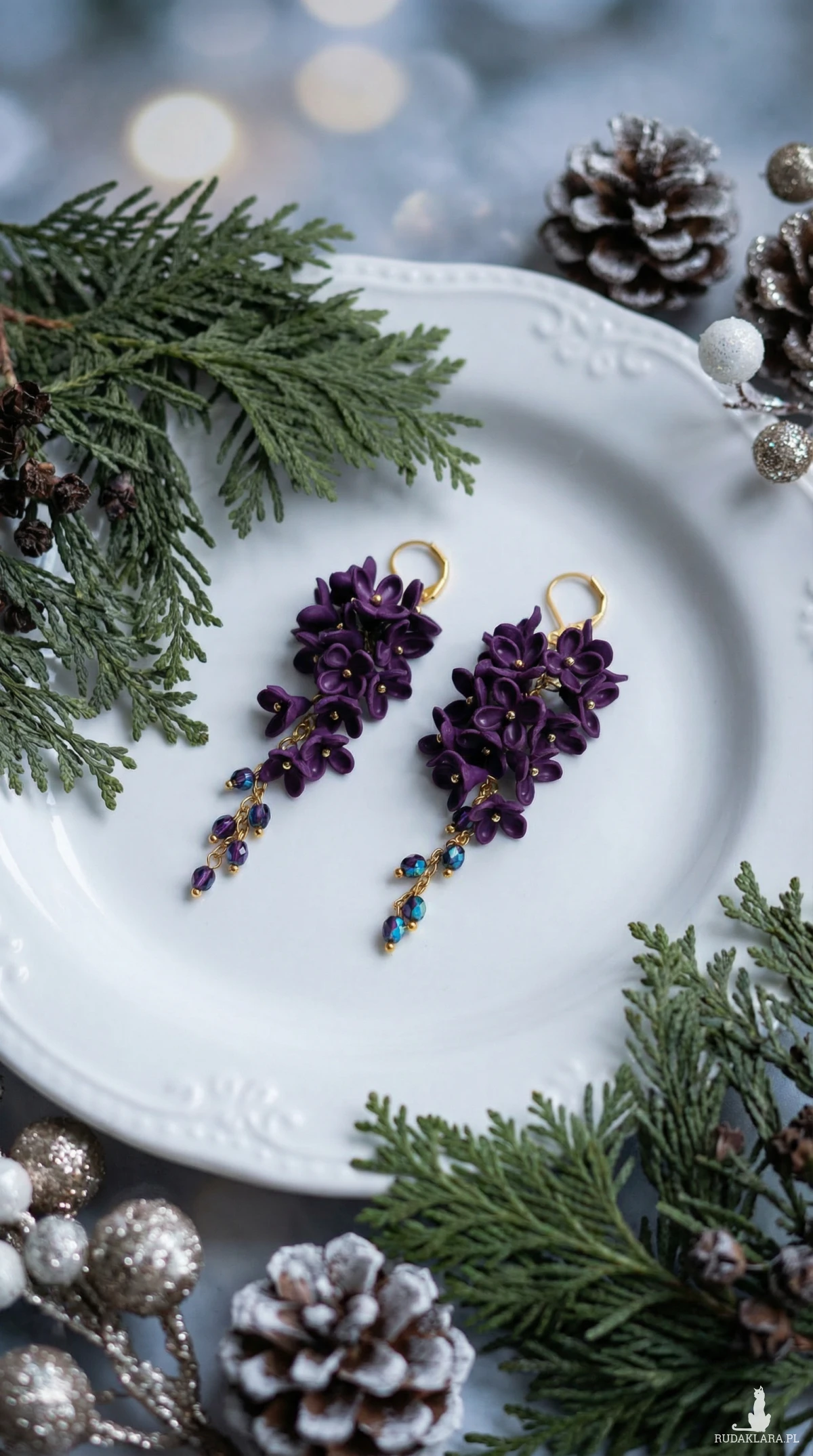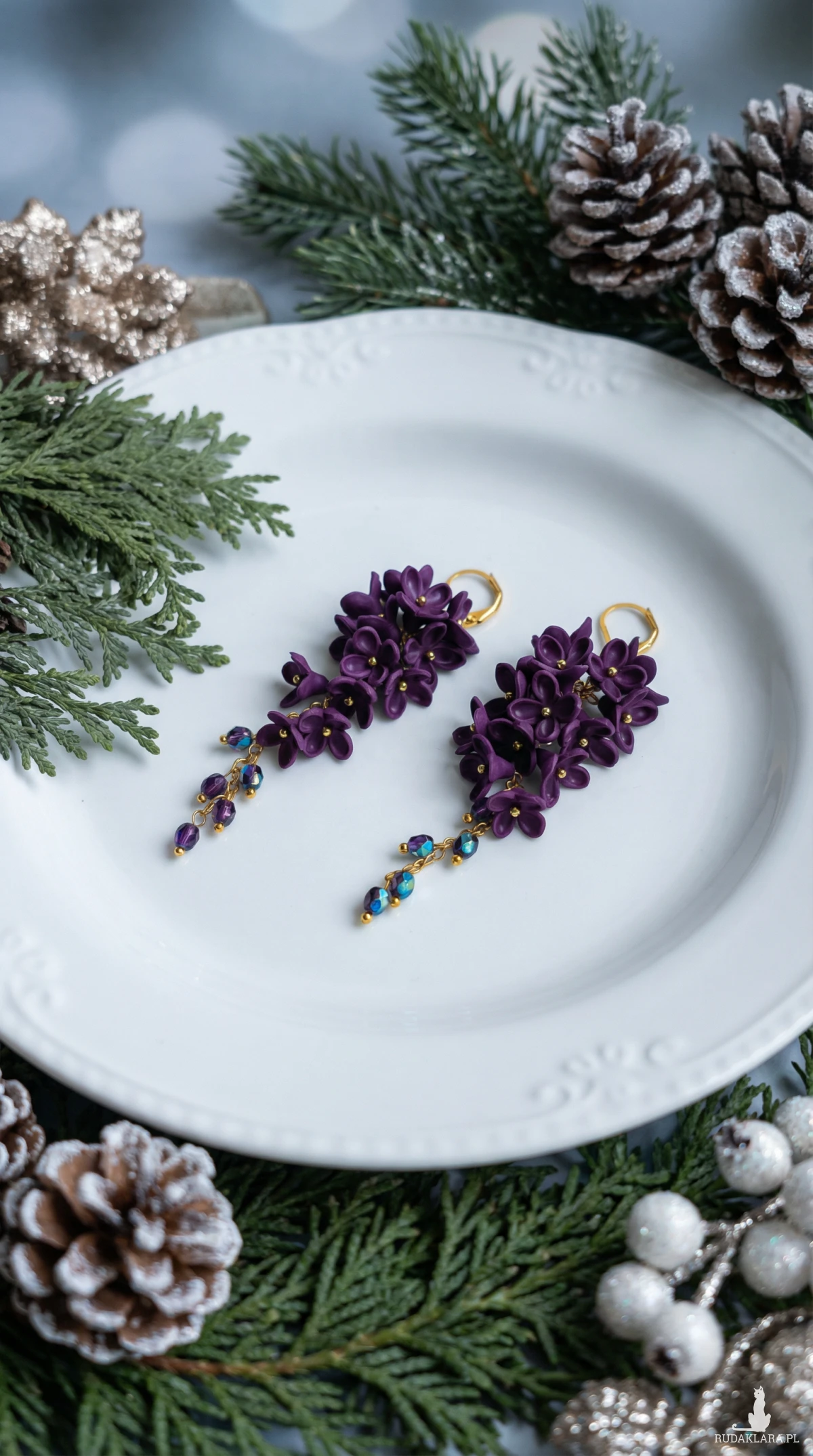 Eleganckie, ręcznie wykonane kolczyki z kwiatuszkami w kolorze oberżyny 🤗