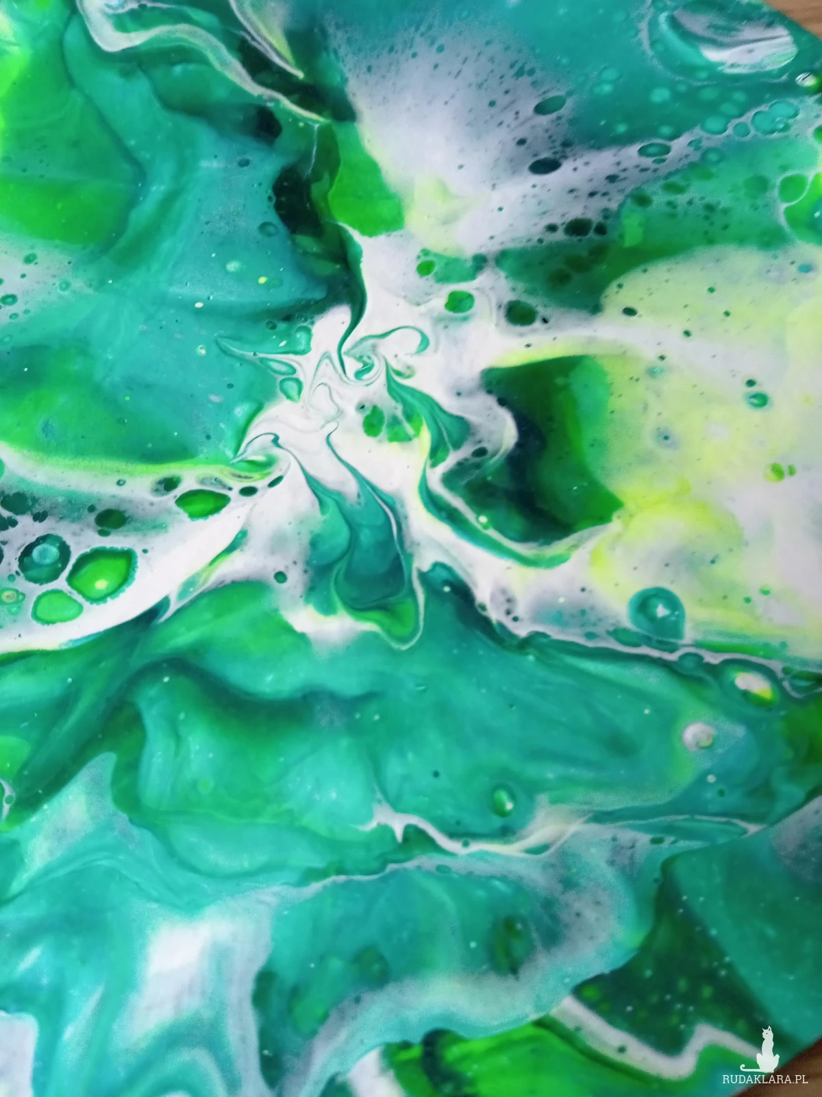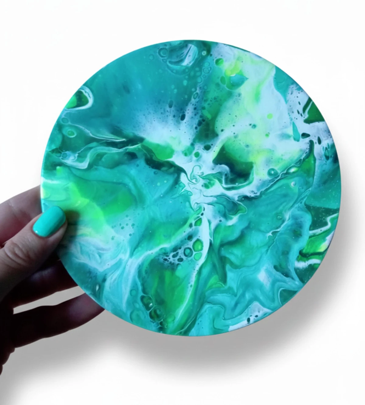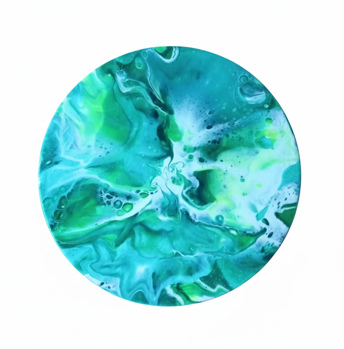 Stworzony techniką acrylic pouring, jest absolutnie wyjątkowy -każdy egzemplarz to niepowtarzalna kompozycja kolorów i wzorów.