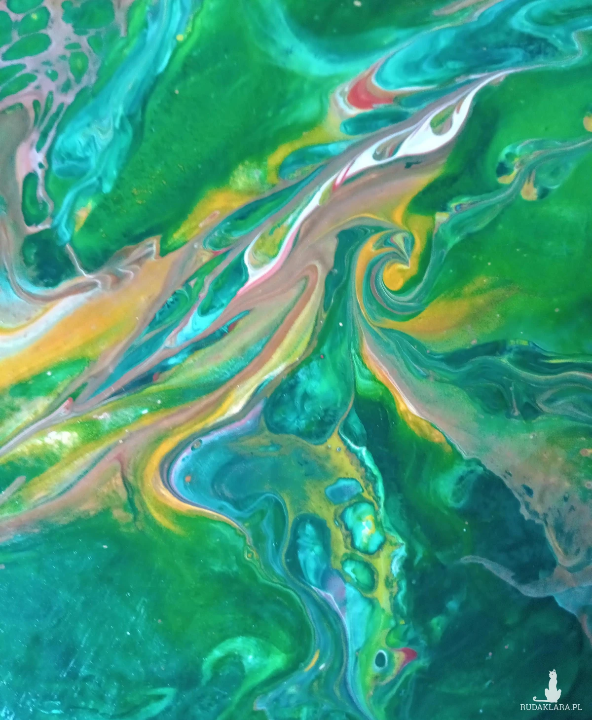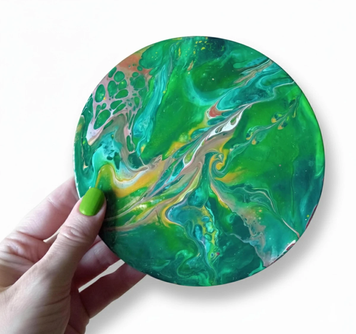 Stworzony techniką acrylic pouring, jest absolutnie wyjątkowy -każdy egzemplarz to niepowtarzalna kompozycja kolorów i wzorów.