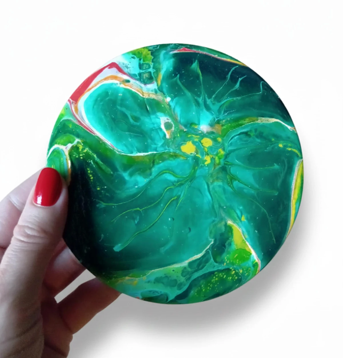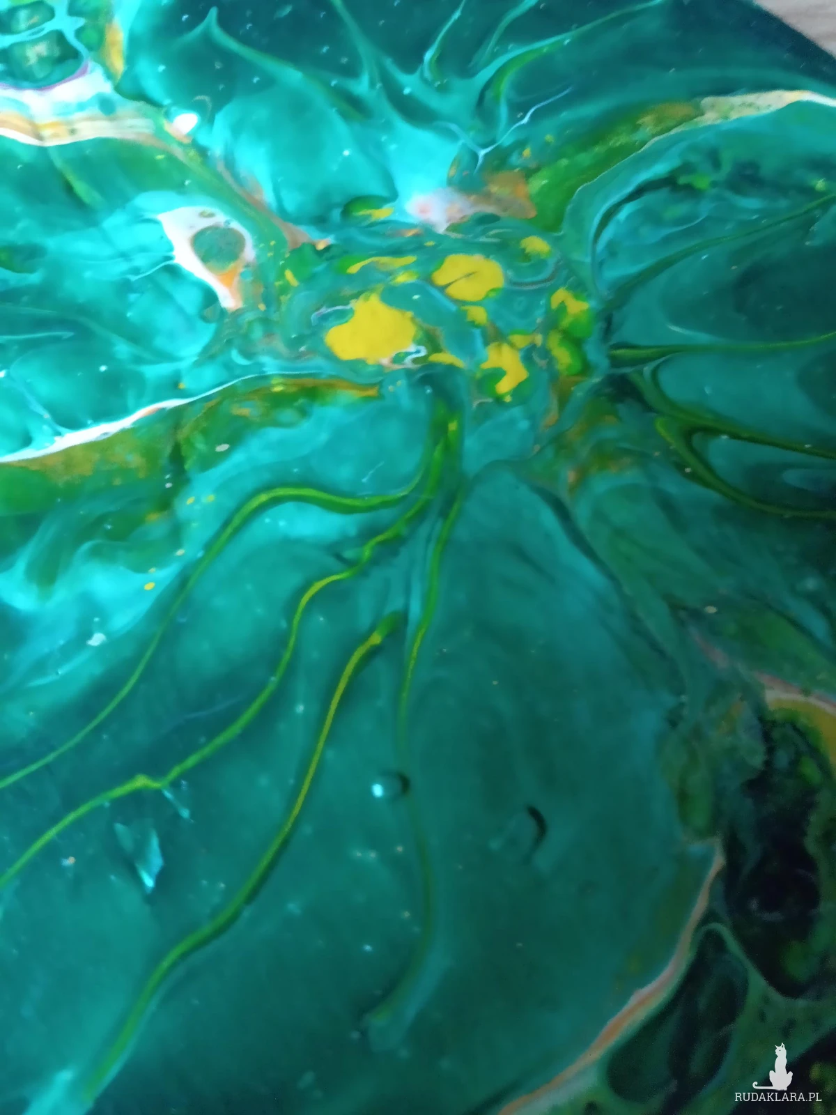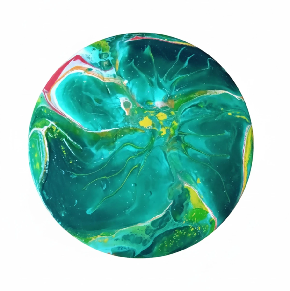 Stworzony techniką acrylic pouring, jest absolutnie wyjątkowy -każdy egzemplarz to niepowtarzalna kompozycja kolorów i wzorów.