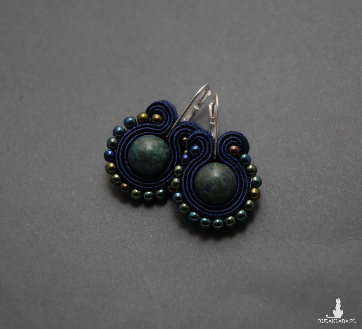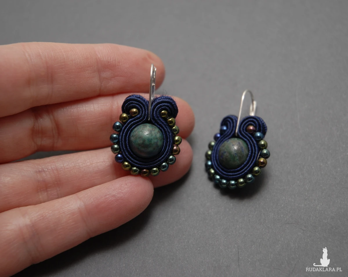 oferuję kolczyki zrobione techniką sutasz, ozdobione chryzokolą i drobnymi koralikami